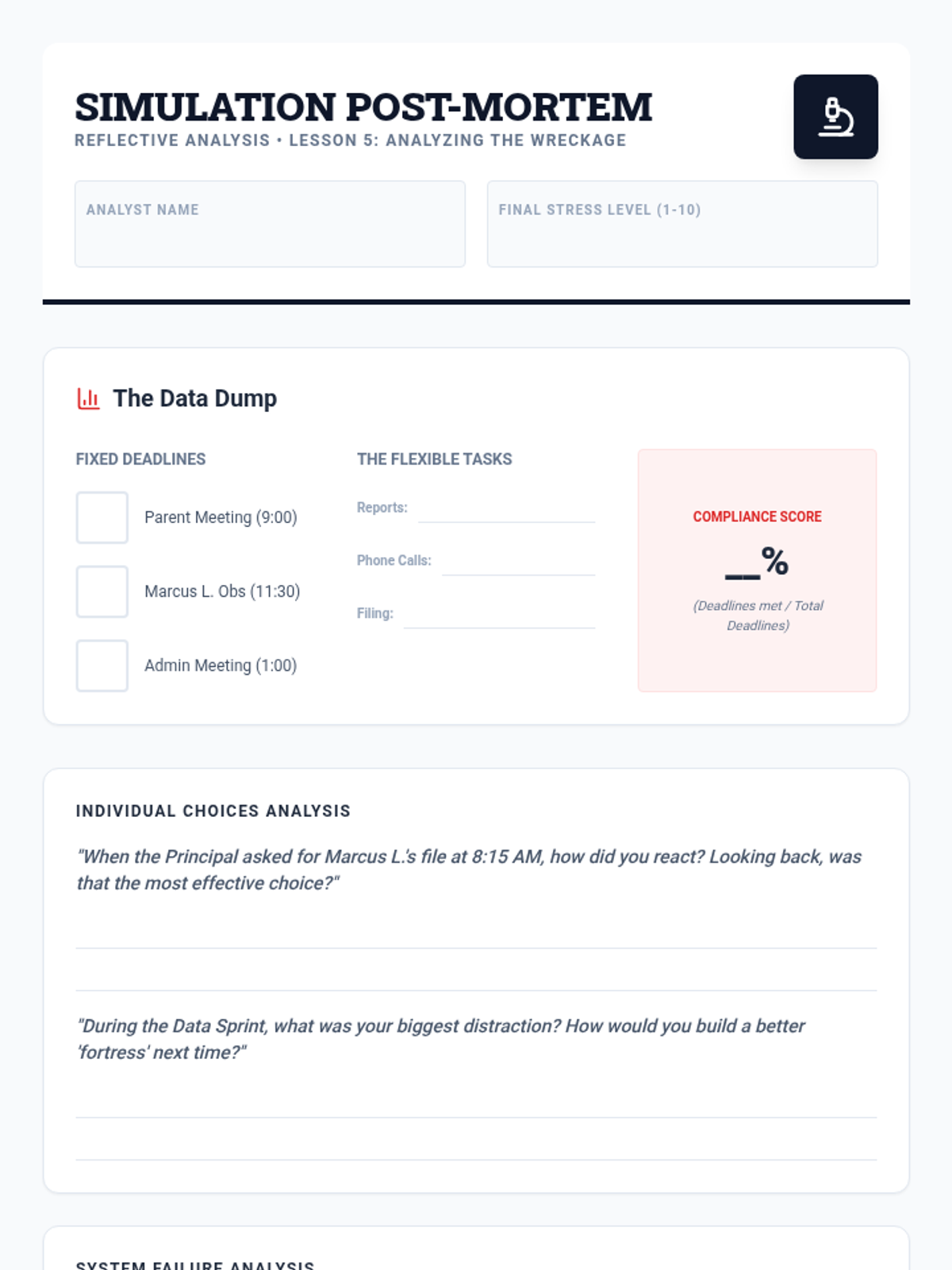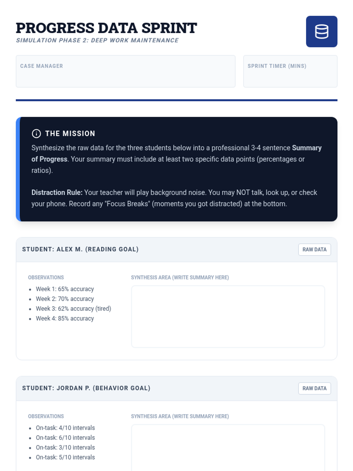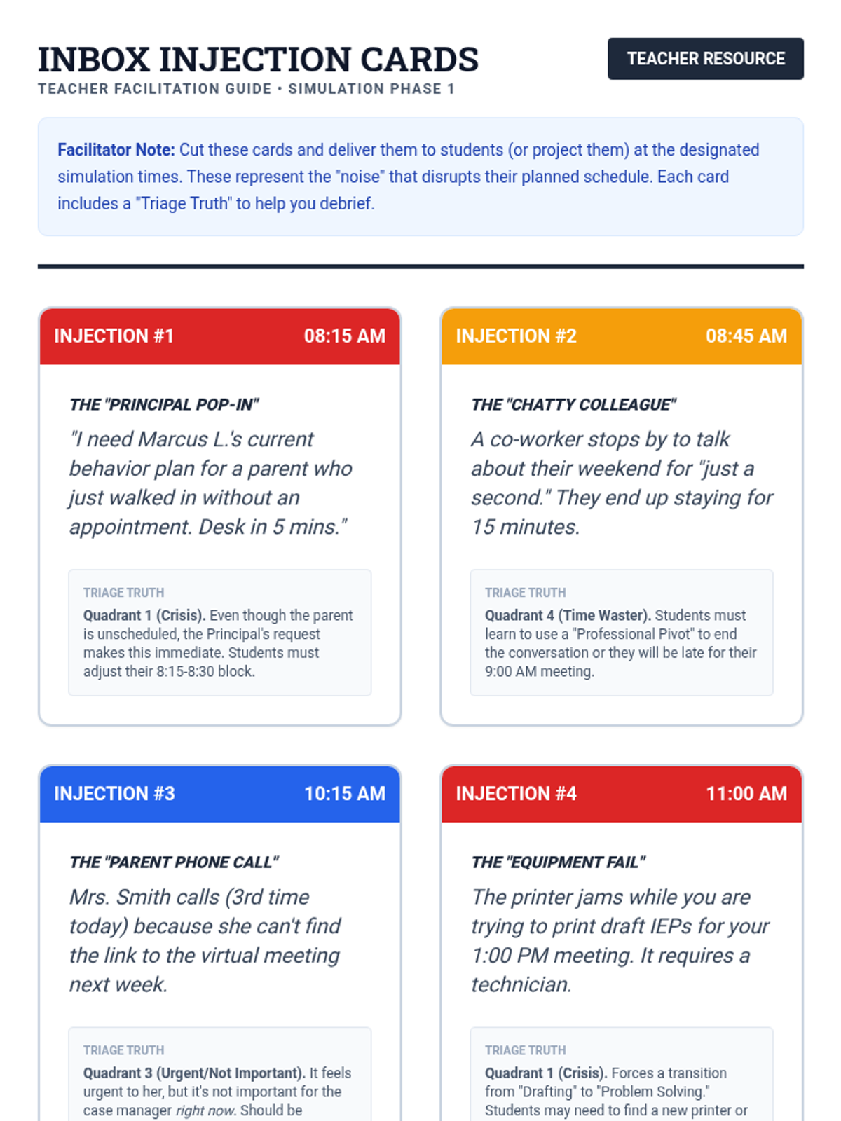 A high-stakes simulation for 12th graders transitioning to professional environments, focusing on prioritizing competing demands, managing interruptions, and professional communication in a special education caseload context.