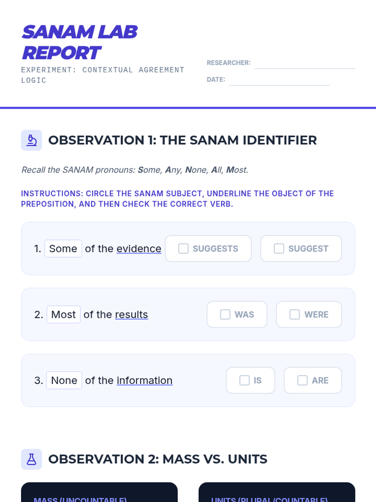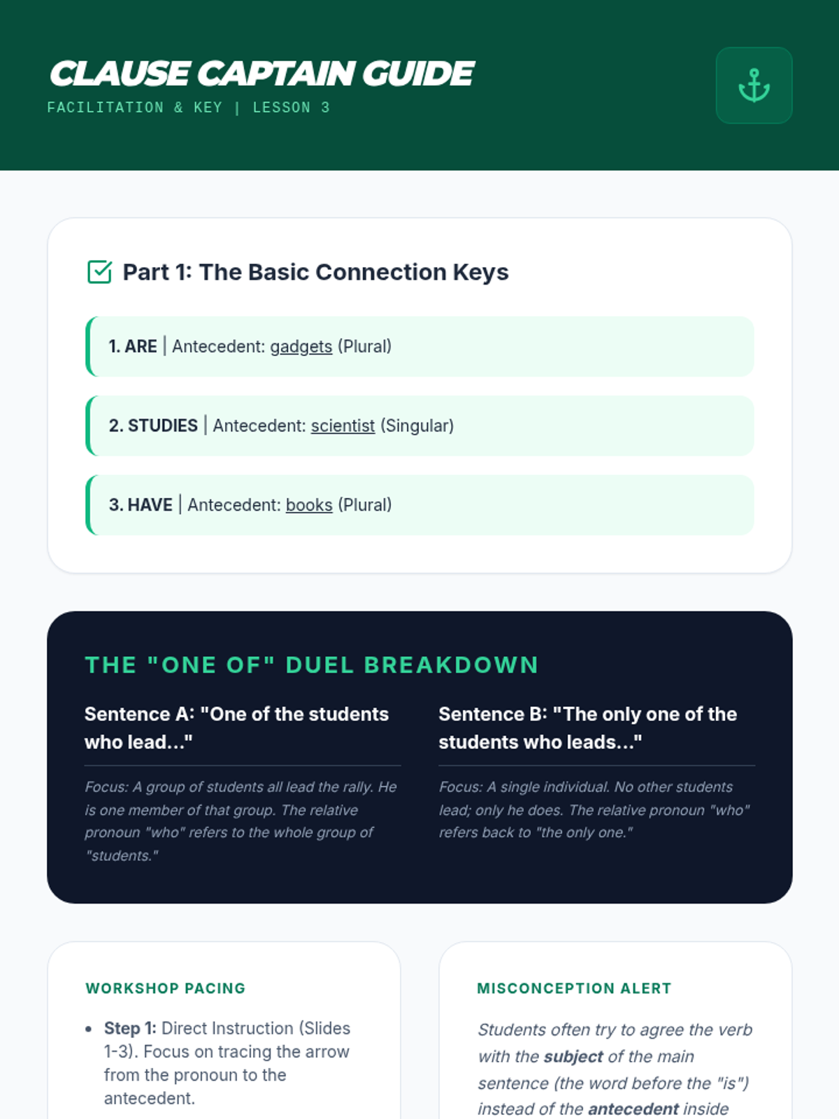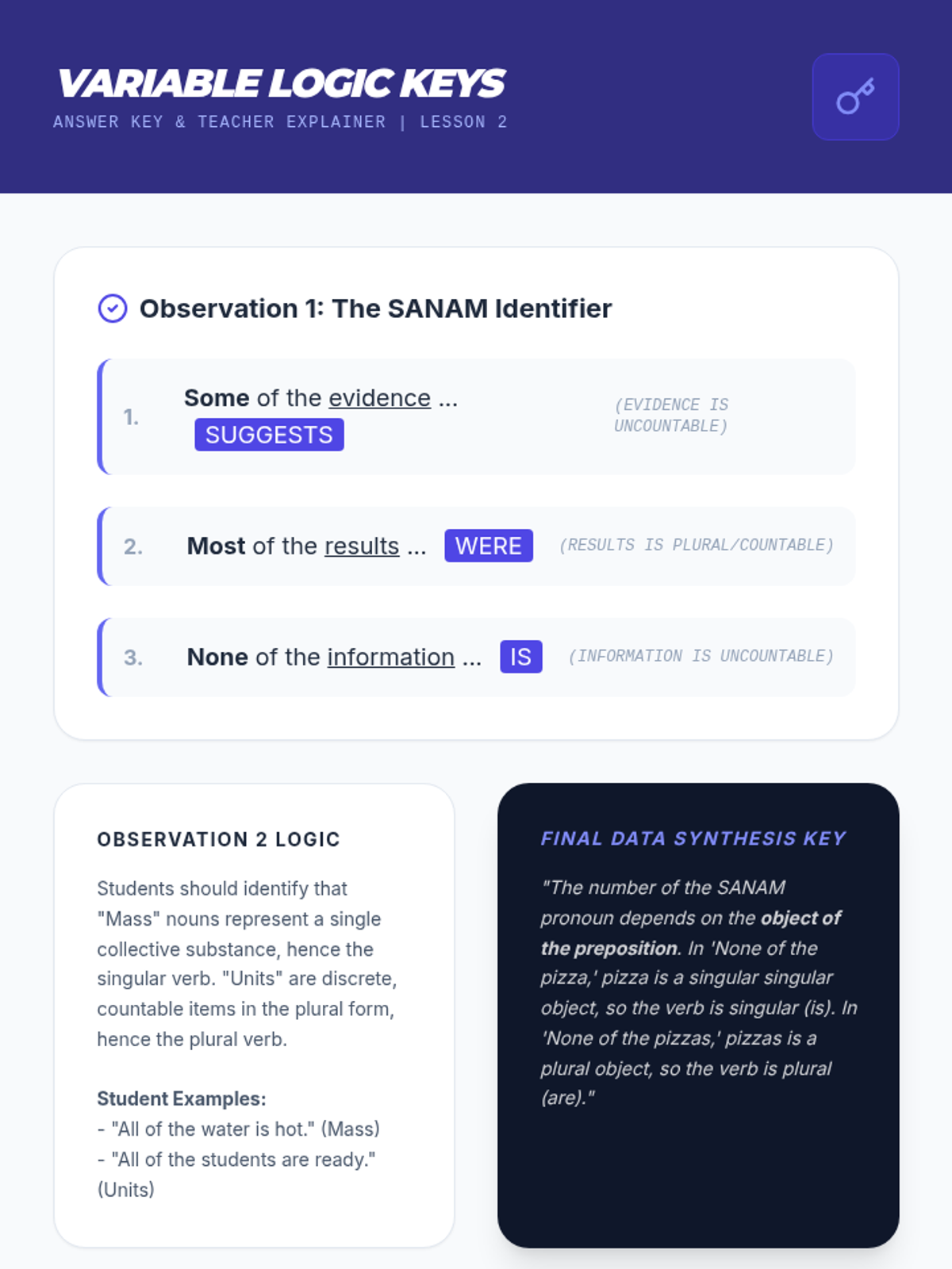 This sequence explores the nuances of subject-verb agreement with indefinite pronouns, variable subjects (SANAM), adjective clauses, and verbal phrases (gerunds and infinitives). Students progress from memorizing singular categories to applying logical linguistic rules in complex sentence structures.