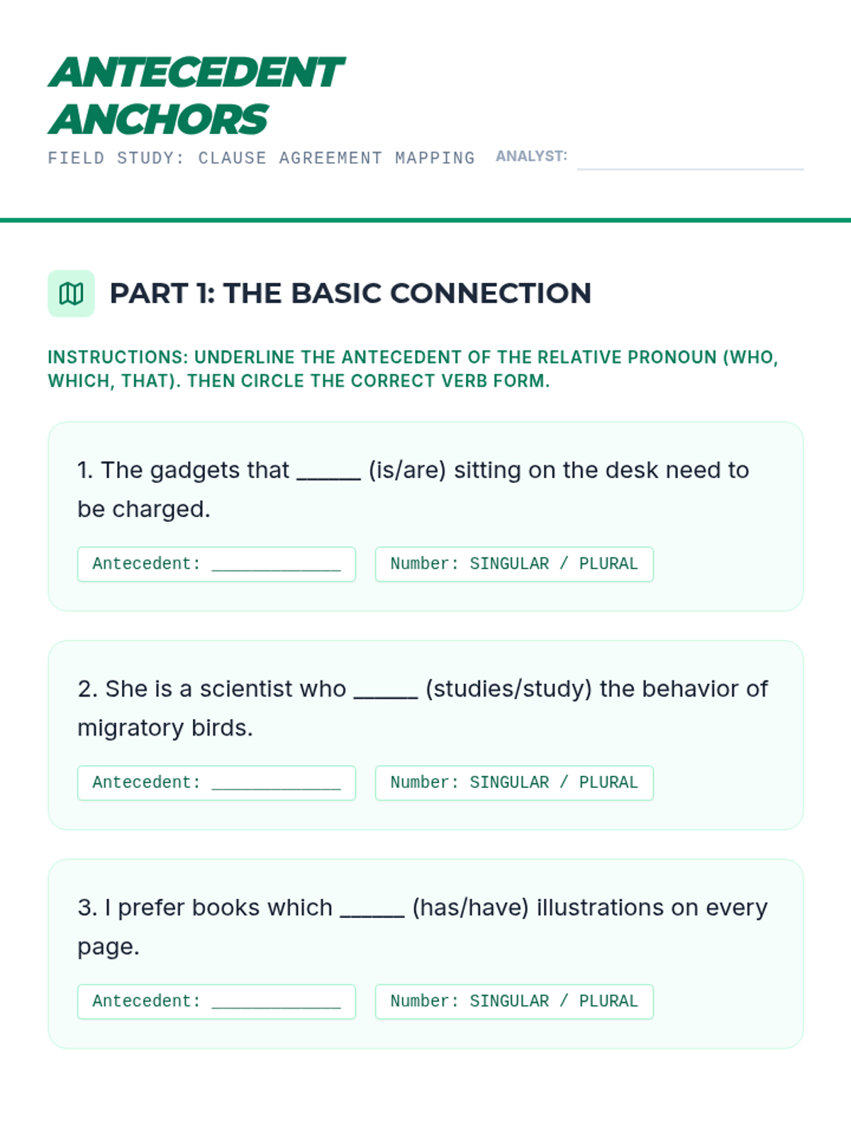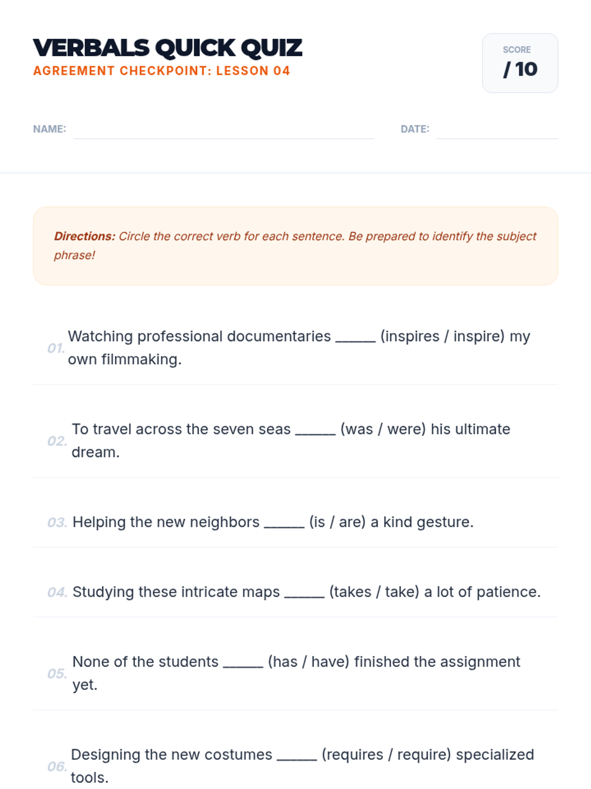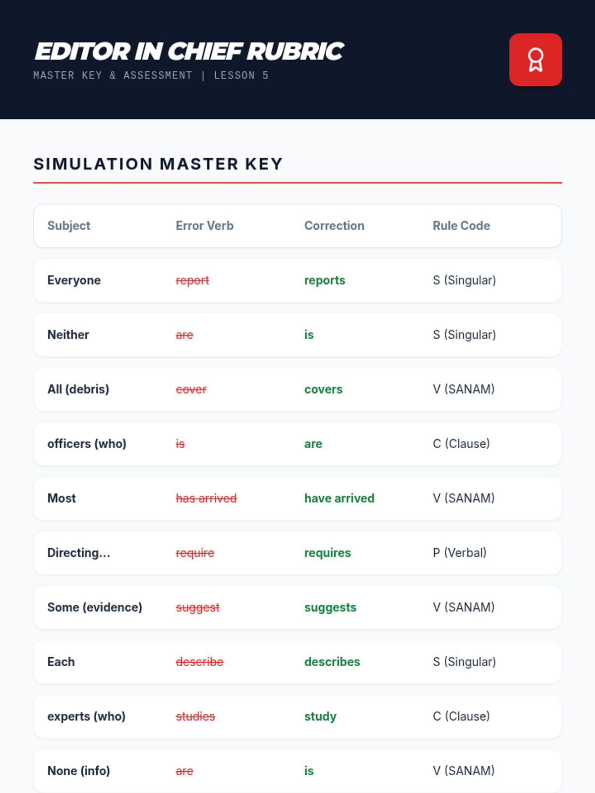 This sequence explores the nuances of subject-verb agreement with indefinite pronouns, variable subjects (SANAM), adjective clauses, and verbal phrases (gerunds and infinitives). Students progress from memorizing singular categories to applying logical linguistic rules in complex sentence structures.