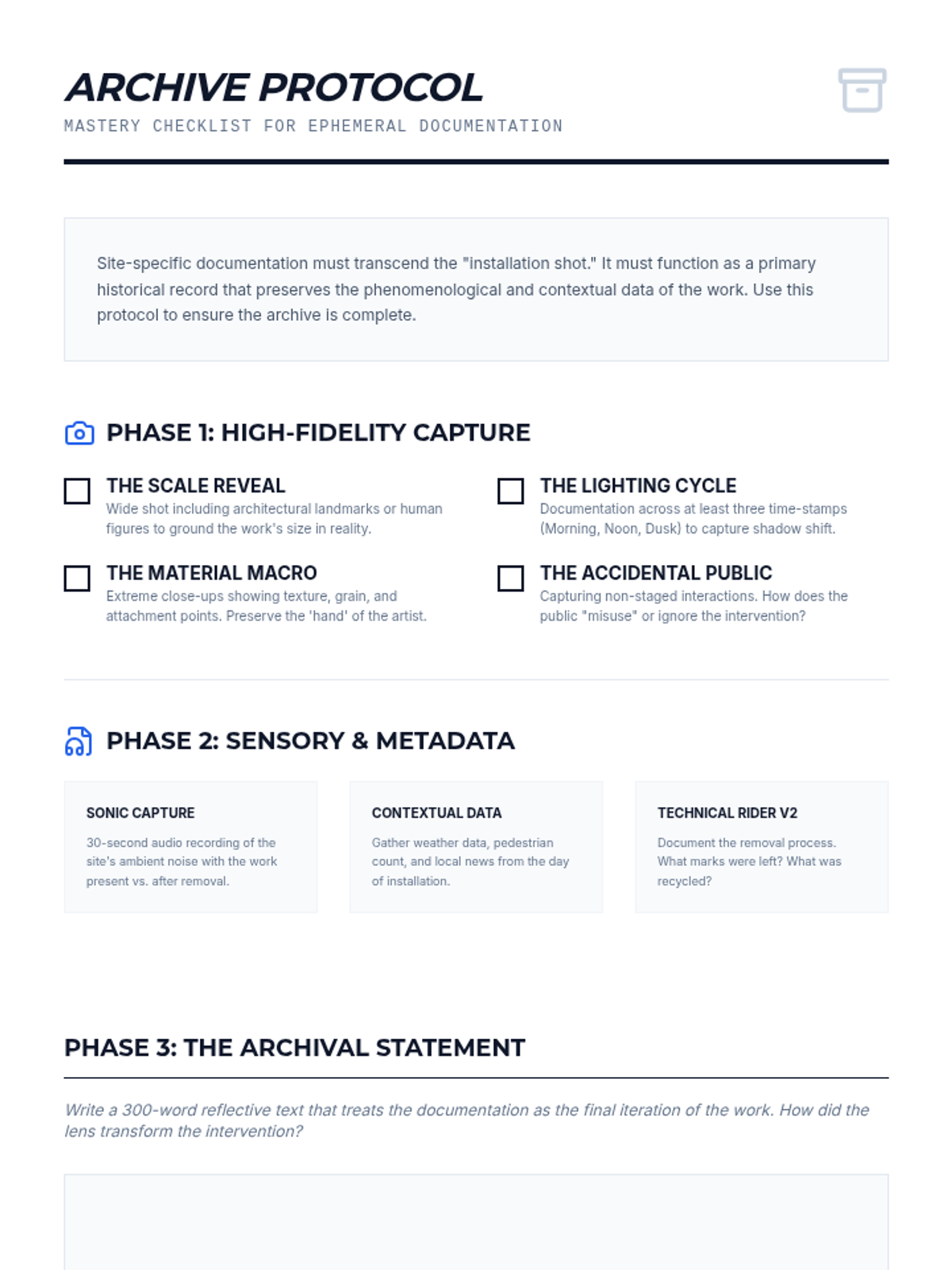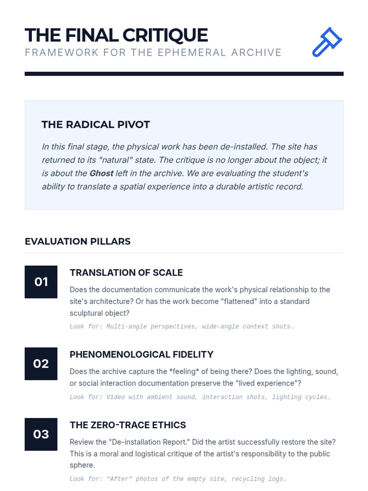 A graduate-level sequence exploring the methodology of site-specific sculpture, focusing on spatial analysis, professional proposal development, phenomenology, and archival documentation.