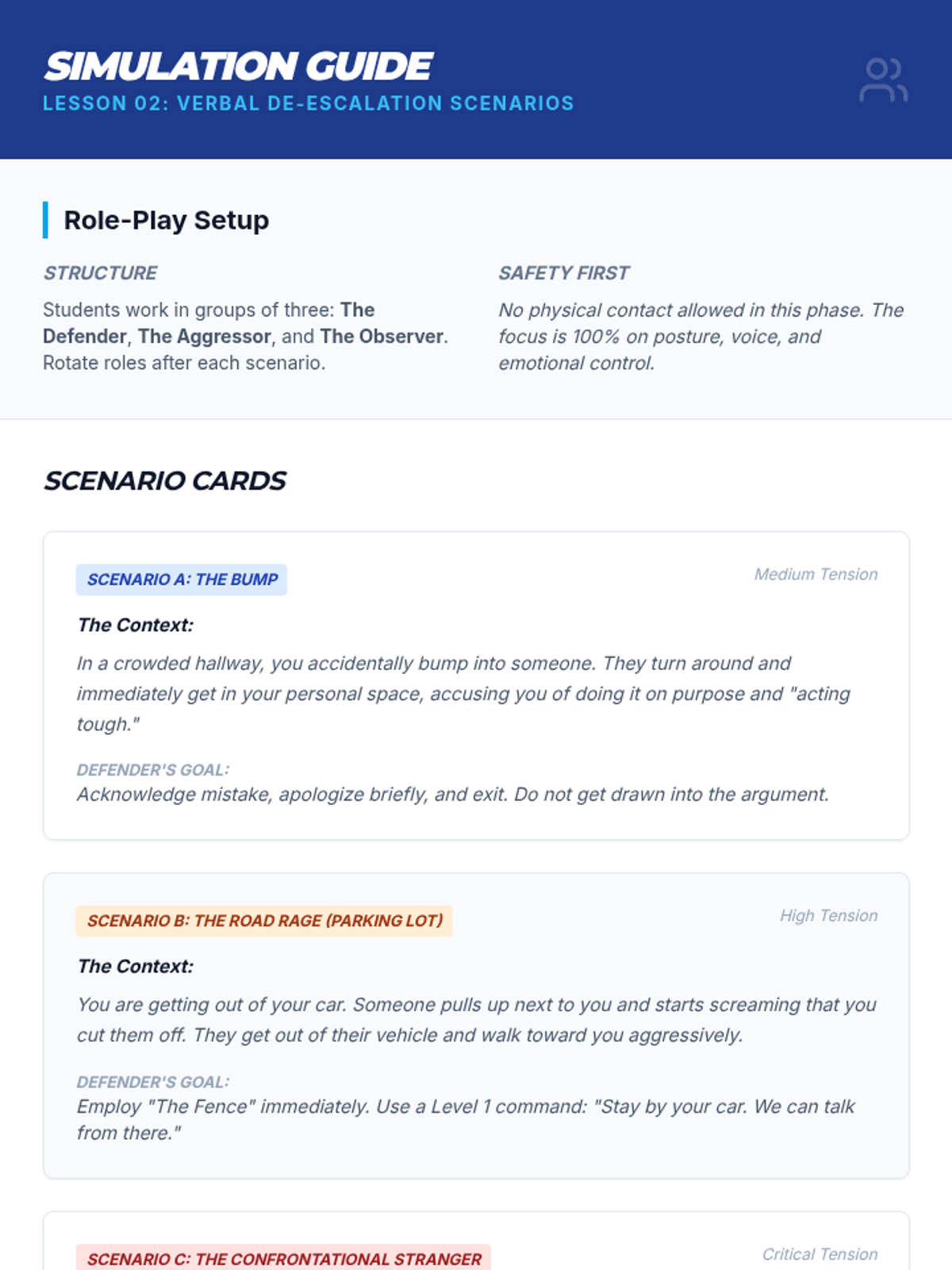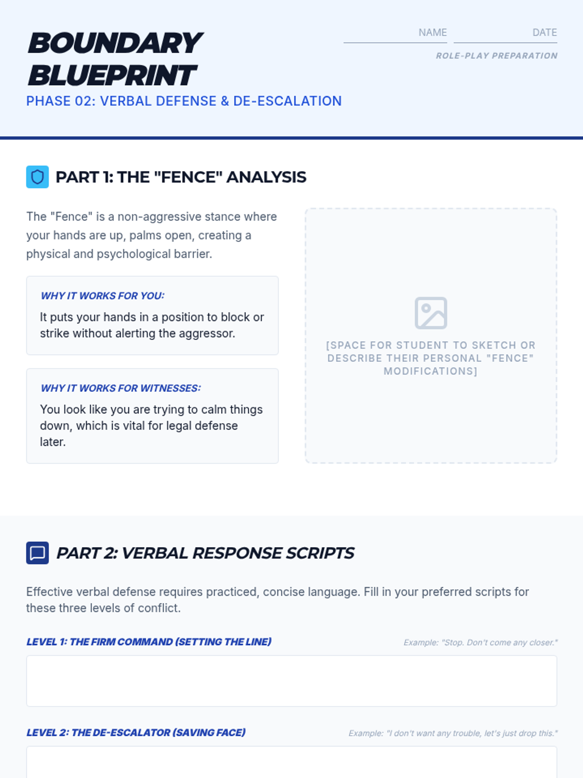 A comprehensive 12th-grade sequence focused on the psychological, verbal, and legal aspects of self-defense, moving beyond physical techniques to emphasize situational awareness and conflict de-escalation.