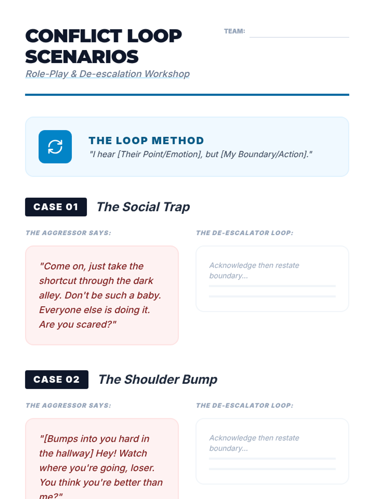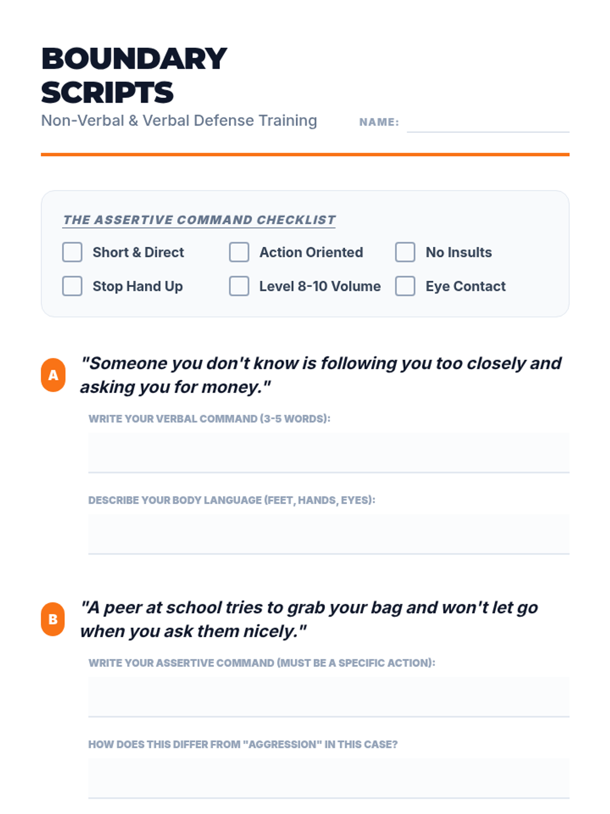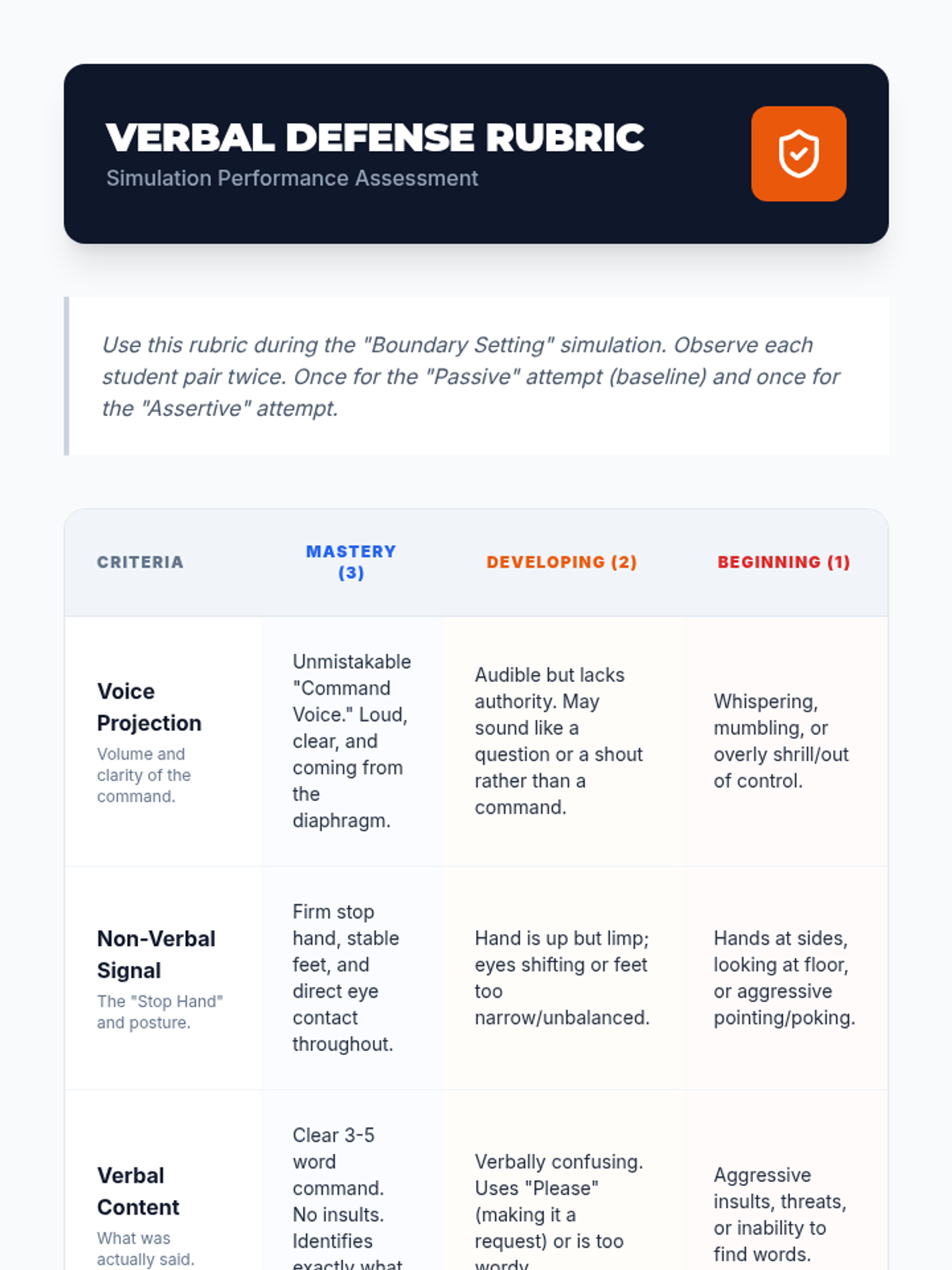This sequence shifts focus from physical combat to the mental and verbal aspects of self-defense, prioritizing conflict avoidance. Students learn threat assessment, assertive communication, and environmental scanning through Cooper's Color Code and role-playing scenarios.