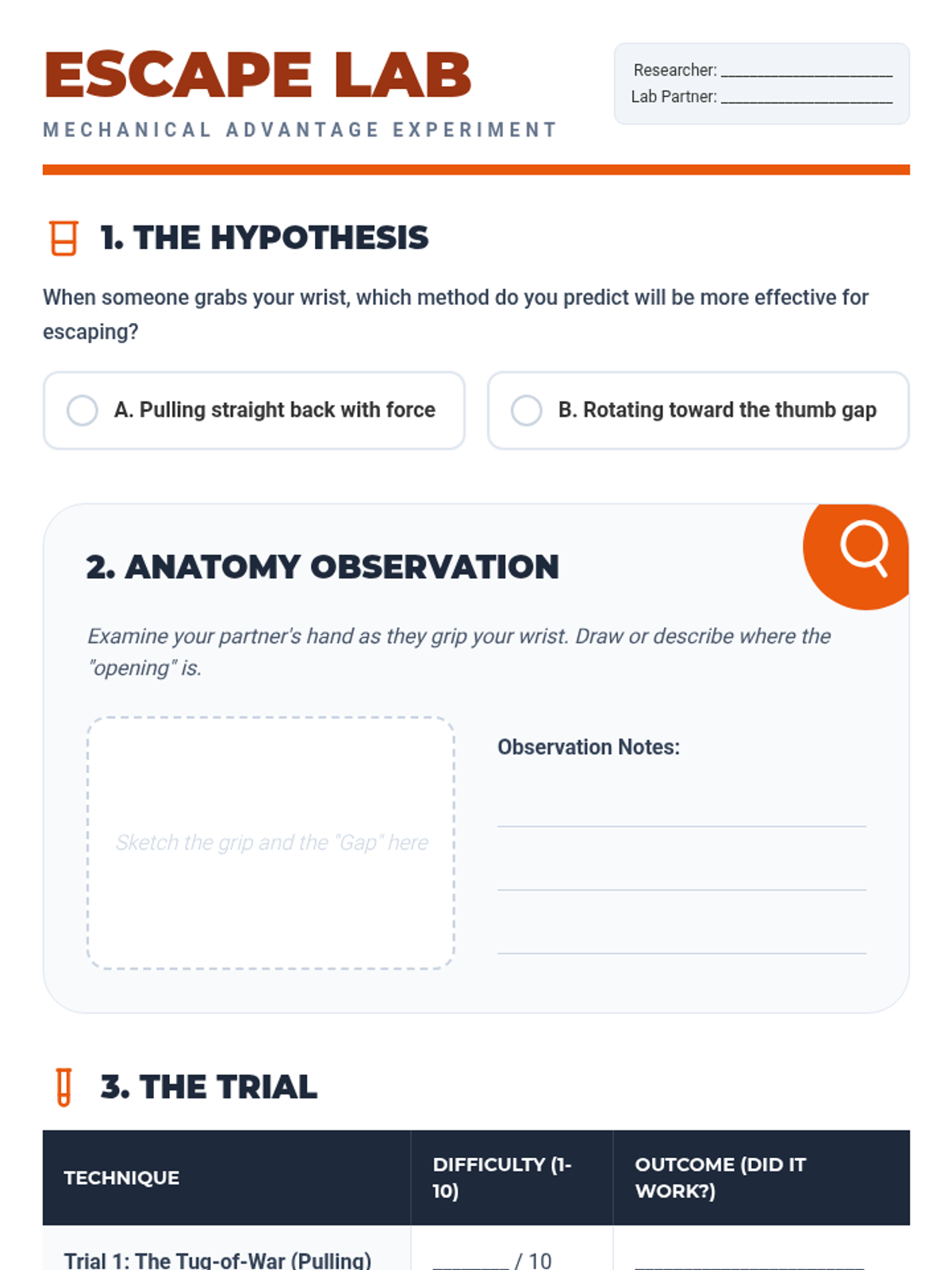 A comprehensive 6th-grade PE sequence focusing on non-aggressive self-defense, situational awareness, and escape maneuvers. Students progress from mental preparedness and verbal boundaries to physical blocks, grab escapes, and safe falling techniques.