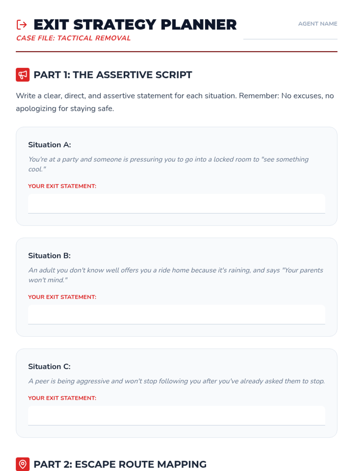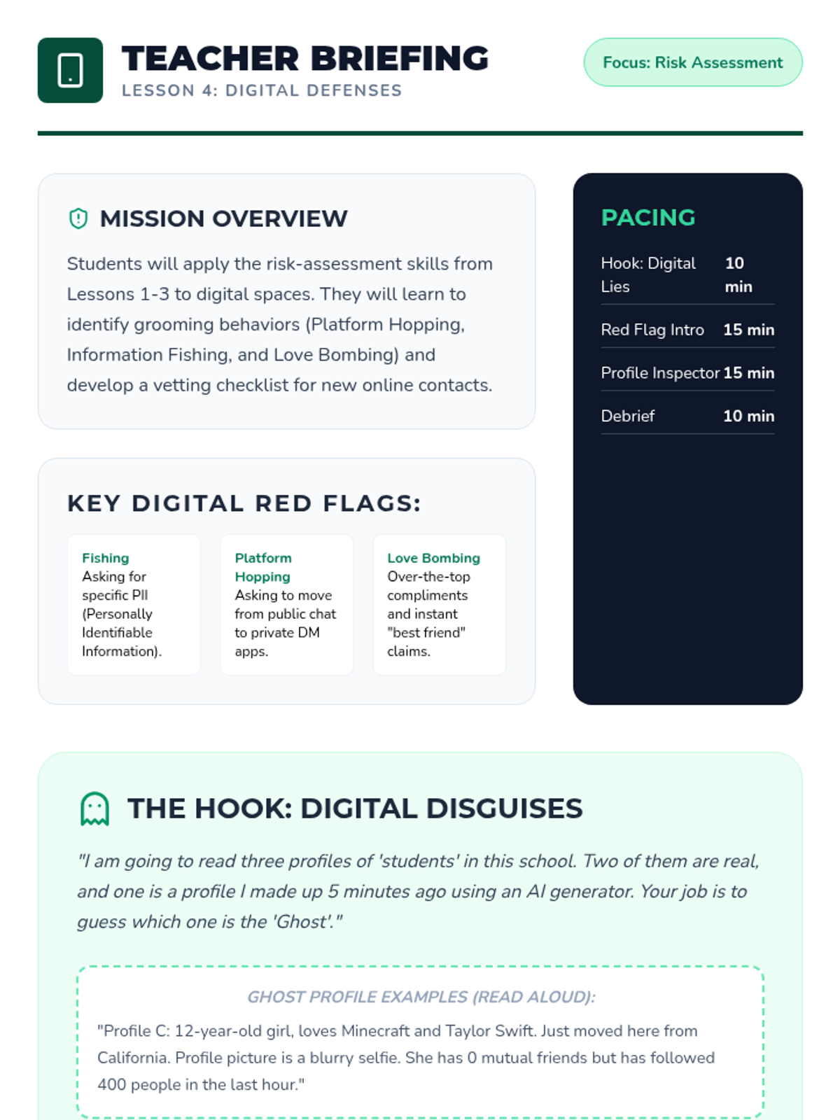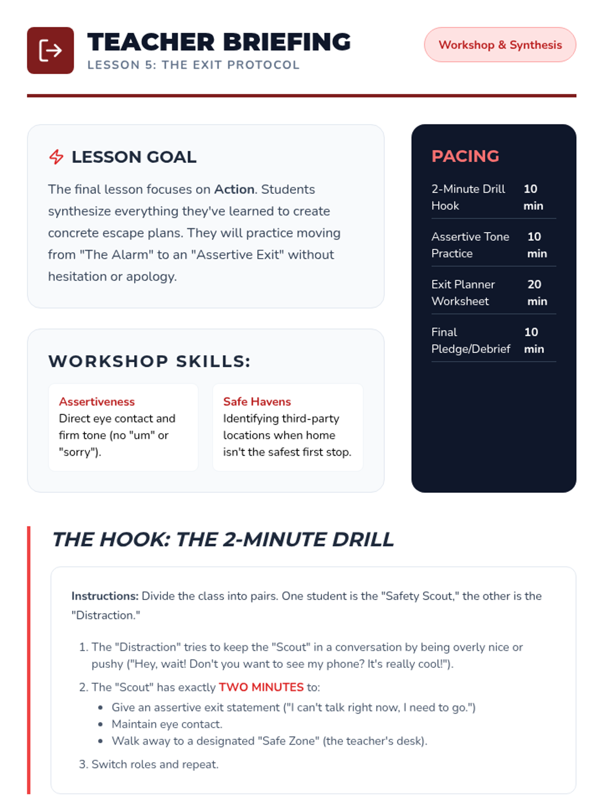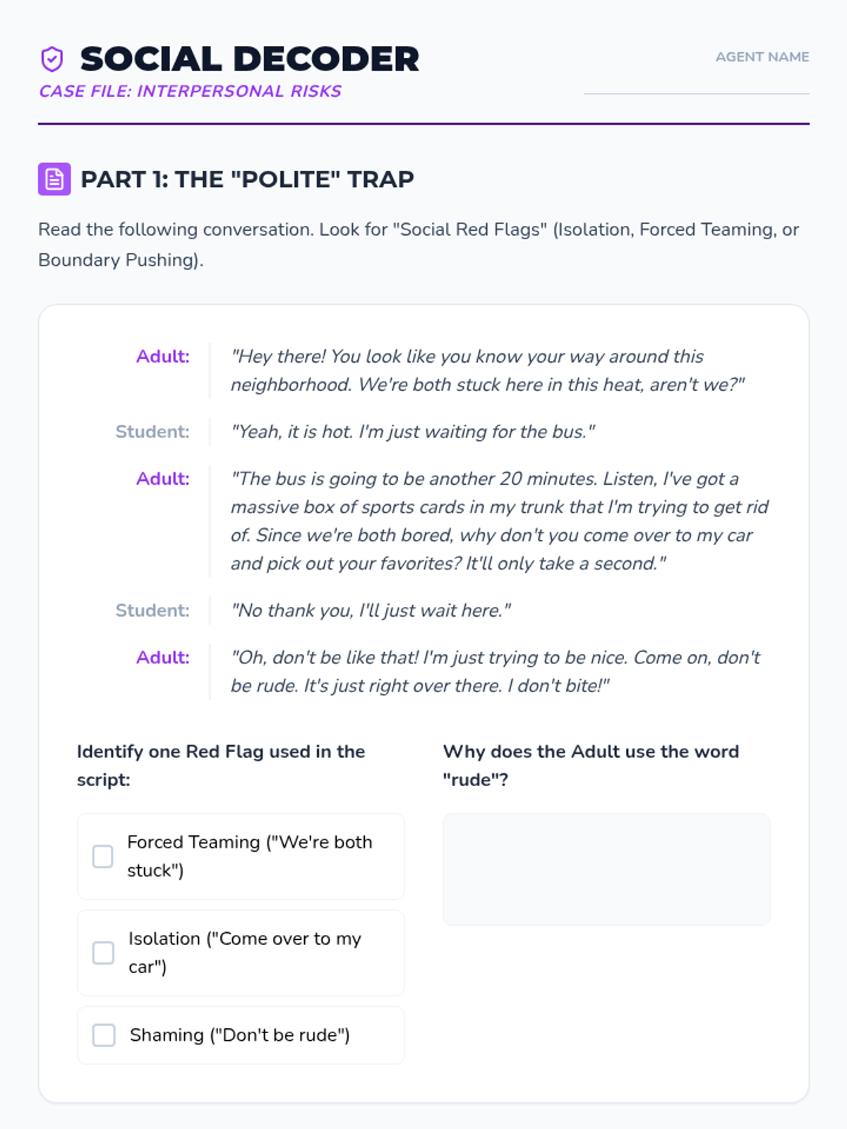 This sequence guides 6th-grade students through identifying and responding to unsafe situations in physical and digital environments. Students explore physiological stress responses, situational awareness, social manipulation, digital red flags, and assertive exit strategies.