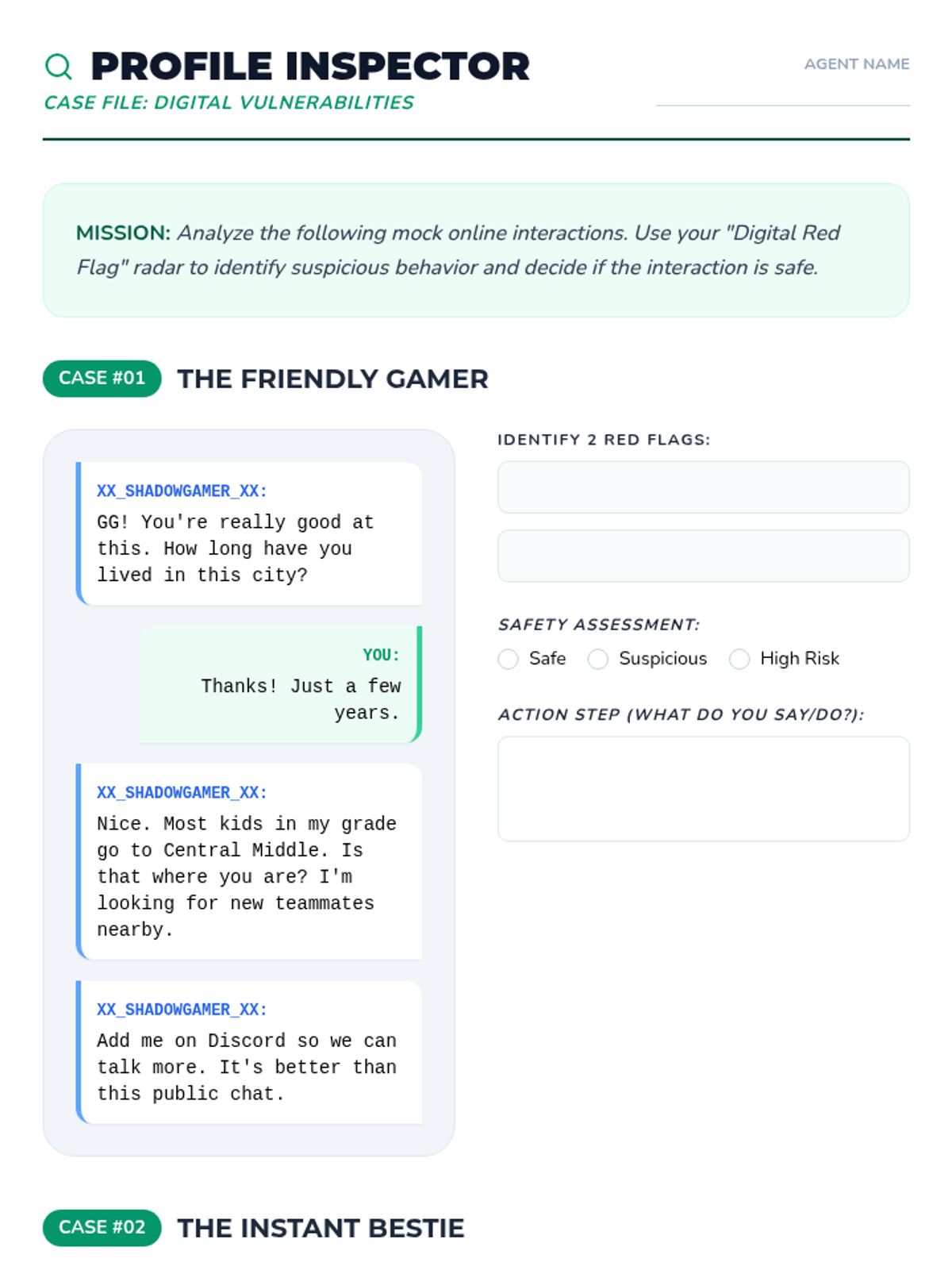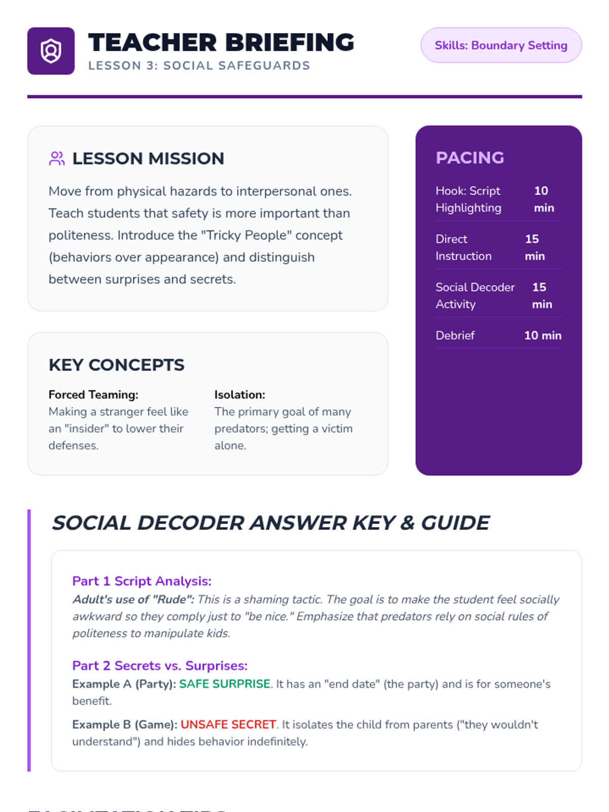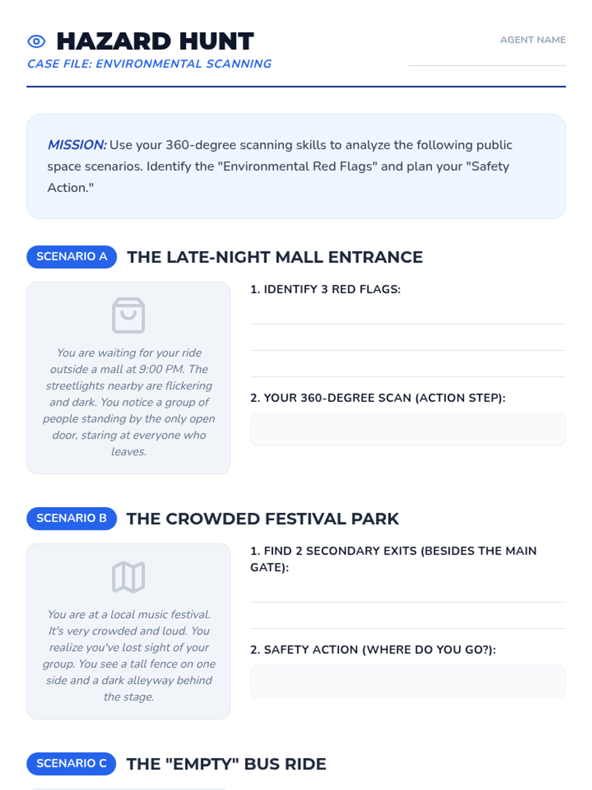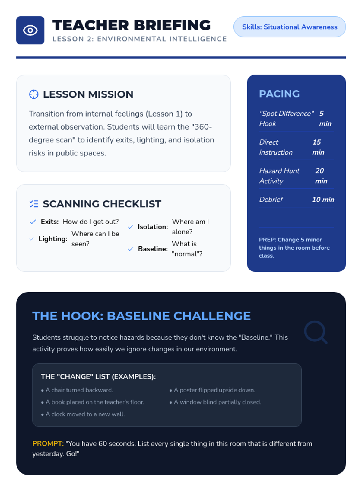 This sequence guides 6th-grade students through identifying and responding to unsafe situations in physical and digital environments. Students explore physiological stress responses, situational awareness, social manipulation, digital red flags, and assertive exit strategies.