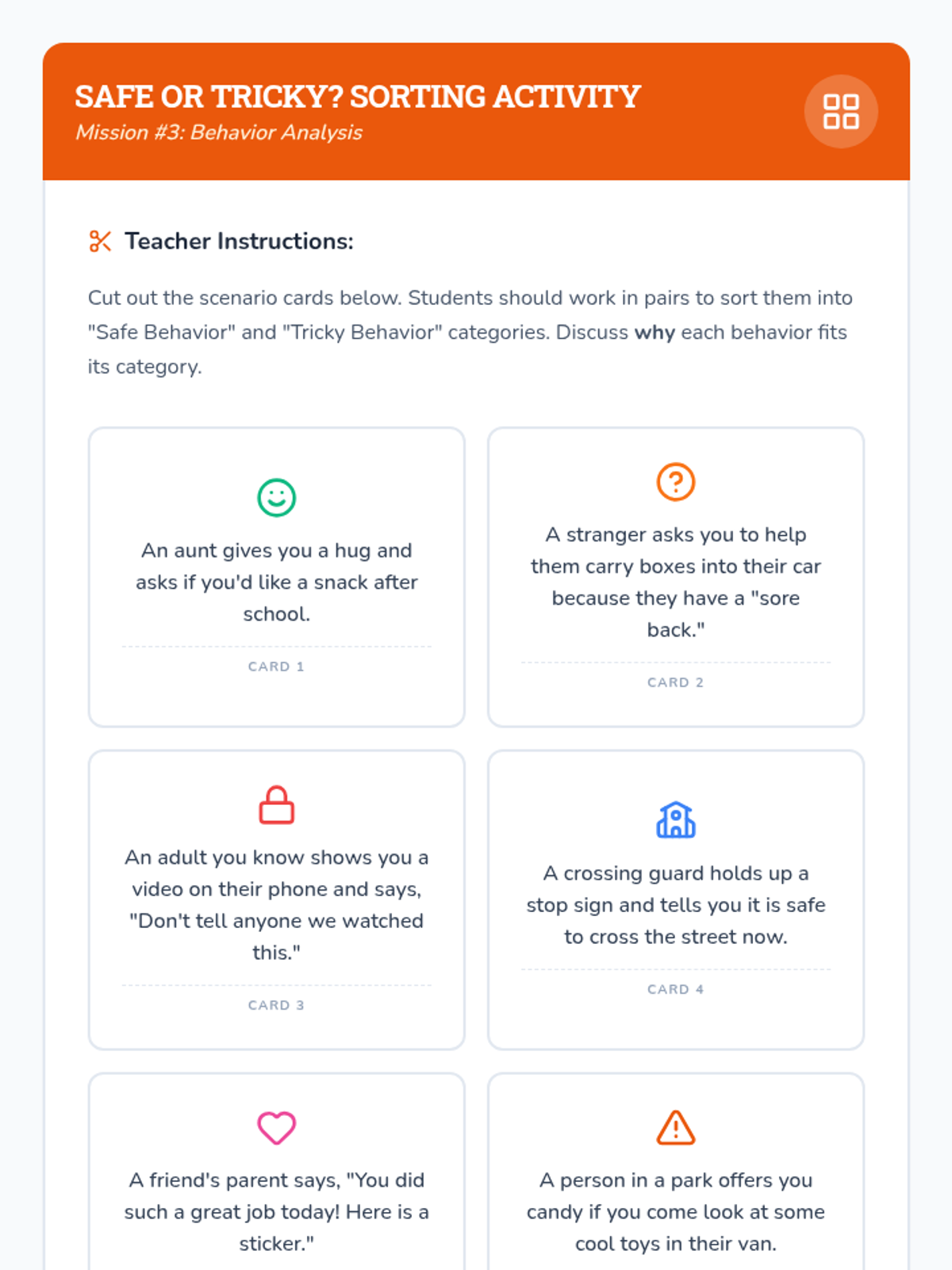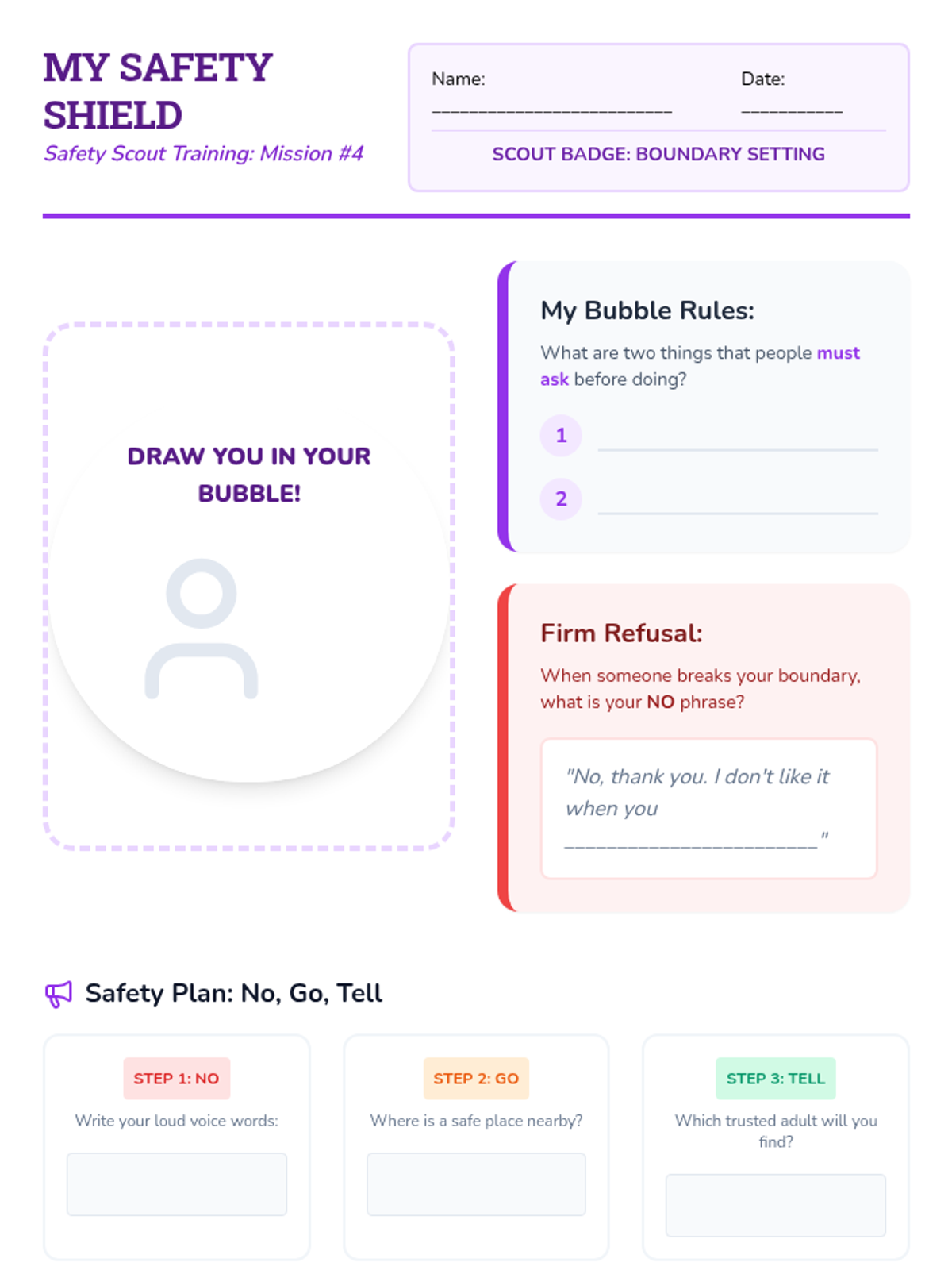 This comprehensive 3rd-grade sequence empowers students to recognize and respond to unsafe situations through intuition, environmental scanning, behavior analysis, and boundary setting. Using a 'Safety Scout' theme, students move from understanding internal physical alarms to executing practical exit strategies and identifying trusted adults.