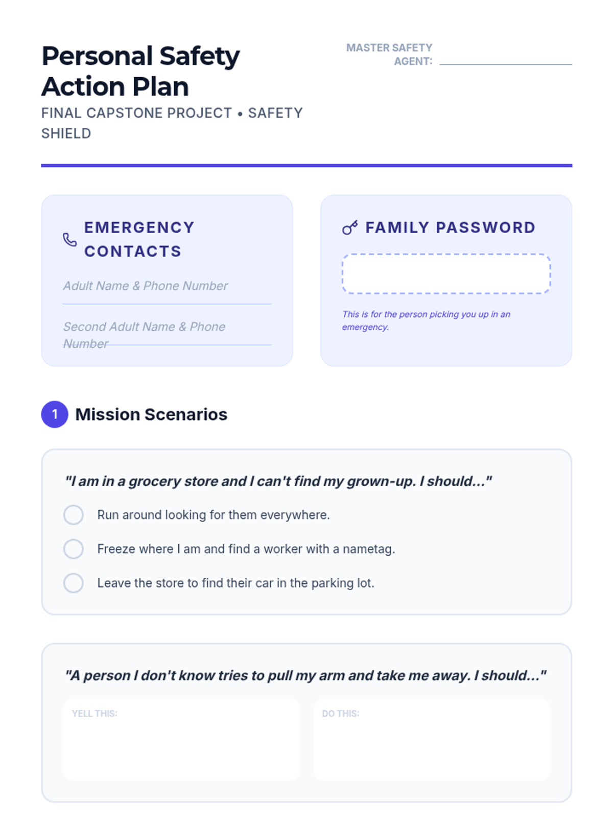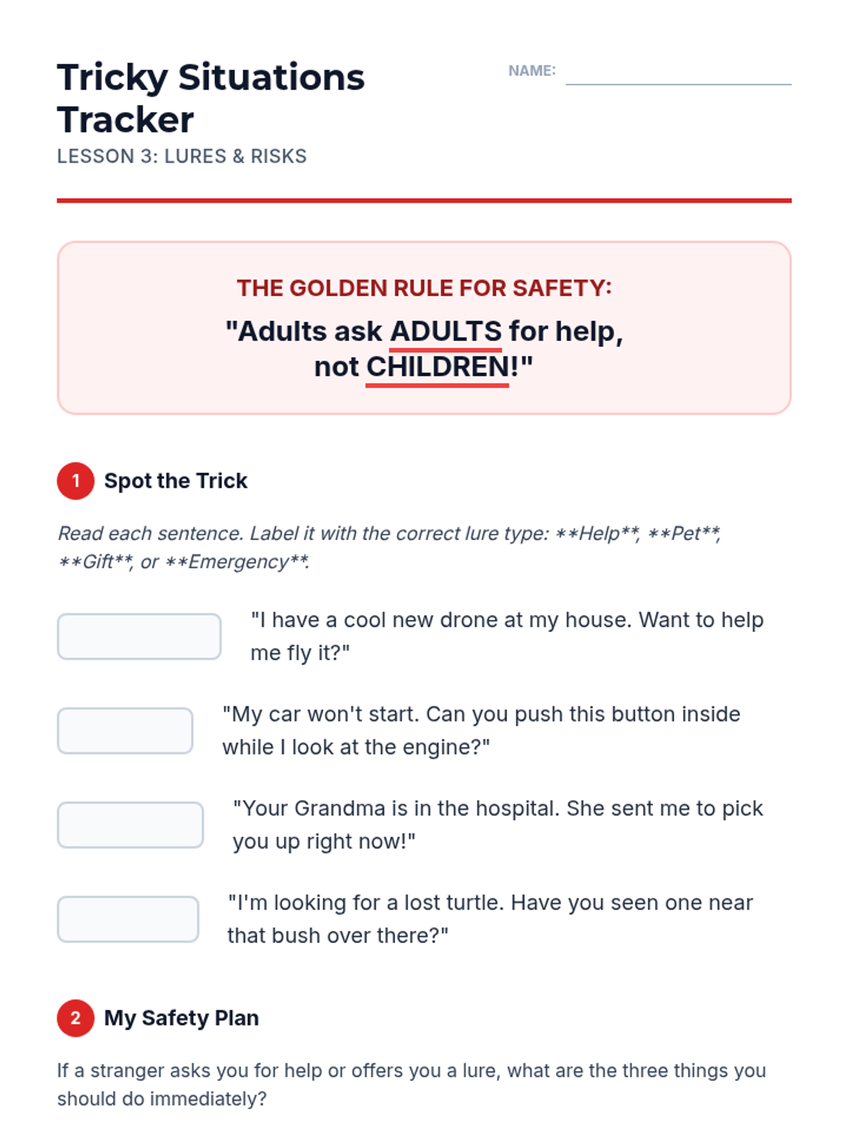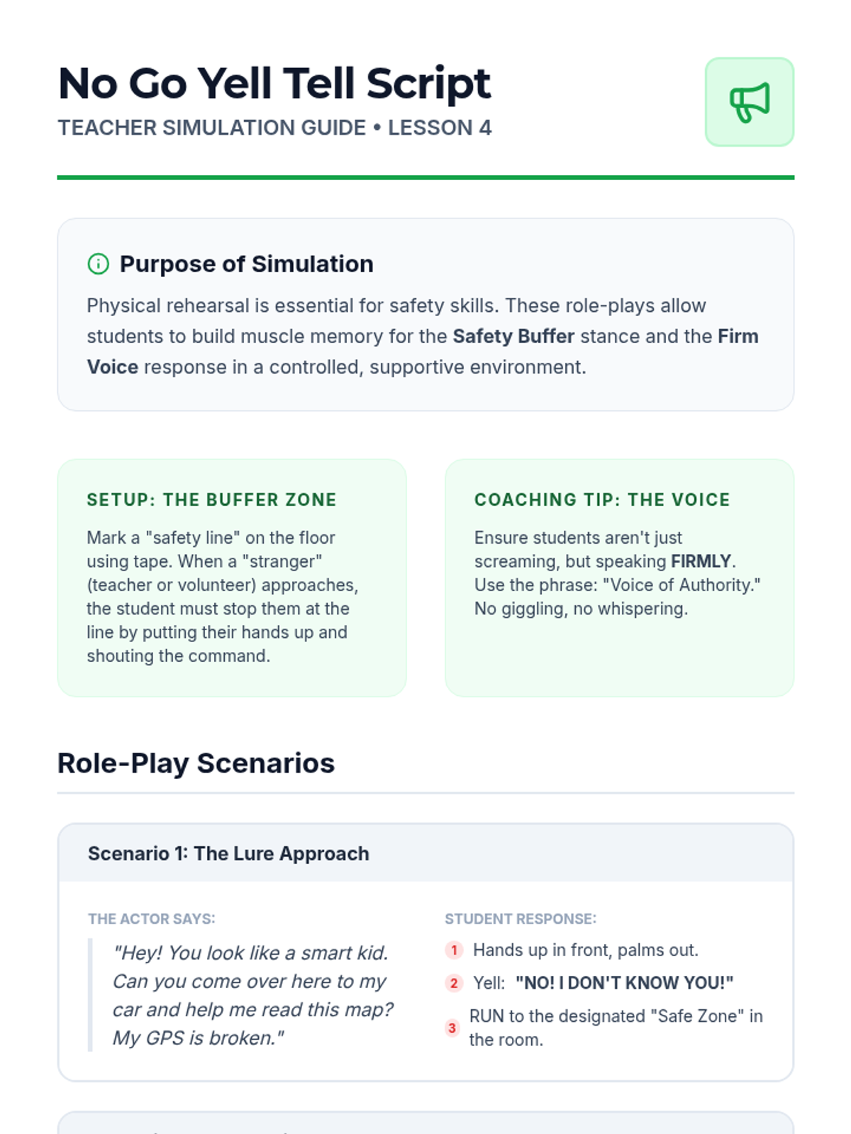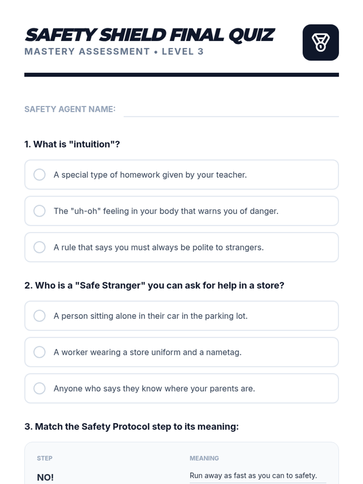 A comprehensive safety curriculum for 3rd graders that builds from internal intuition to external action plans. Students learn to trust their gut, identify community helpers, recognize common lures, and practice the 'No, Go, Yell, Tell' protocol to stay safe in public spaces.