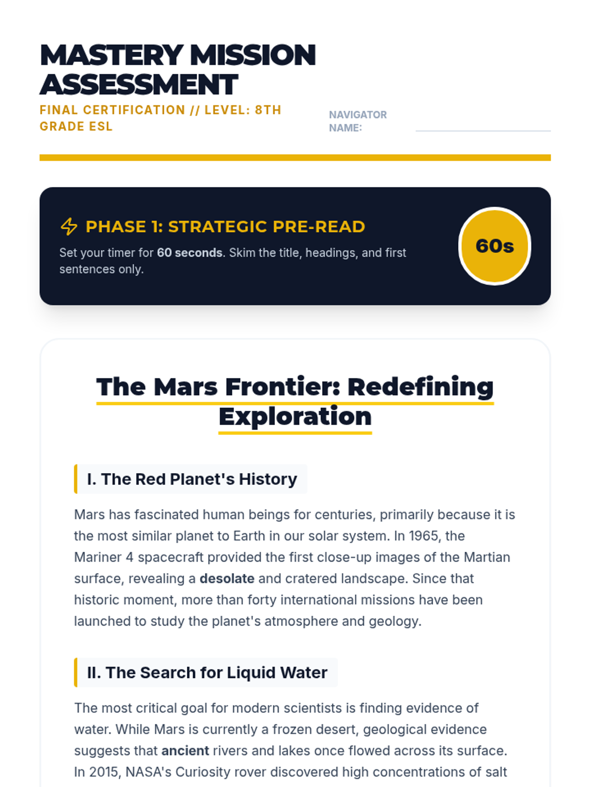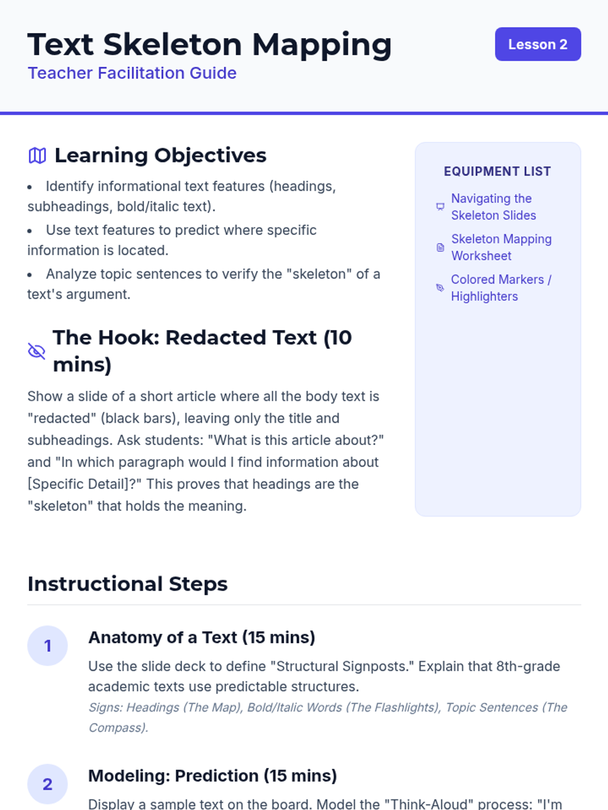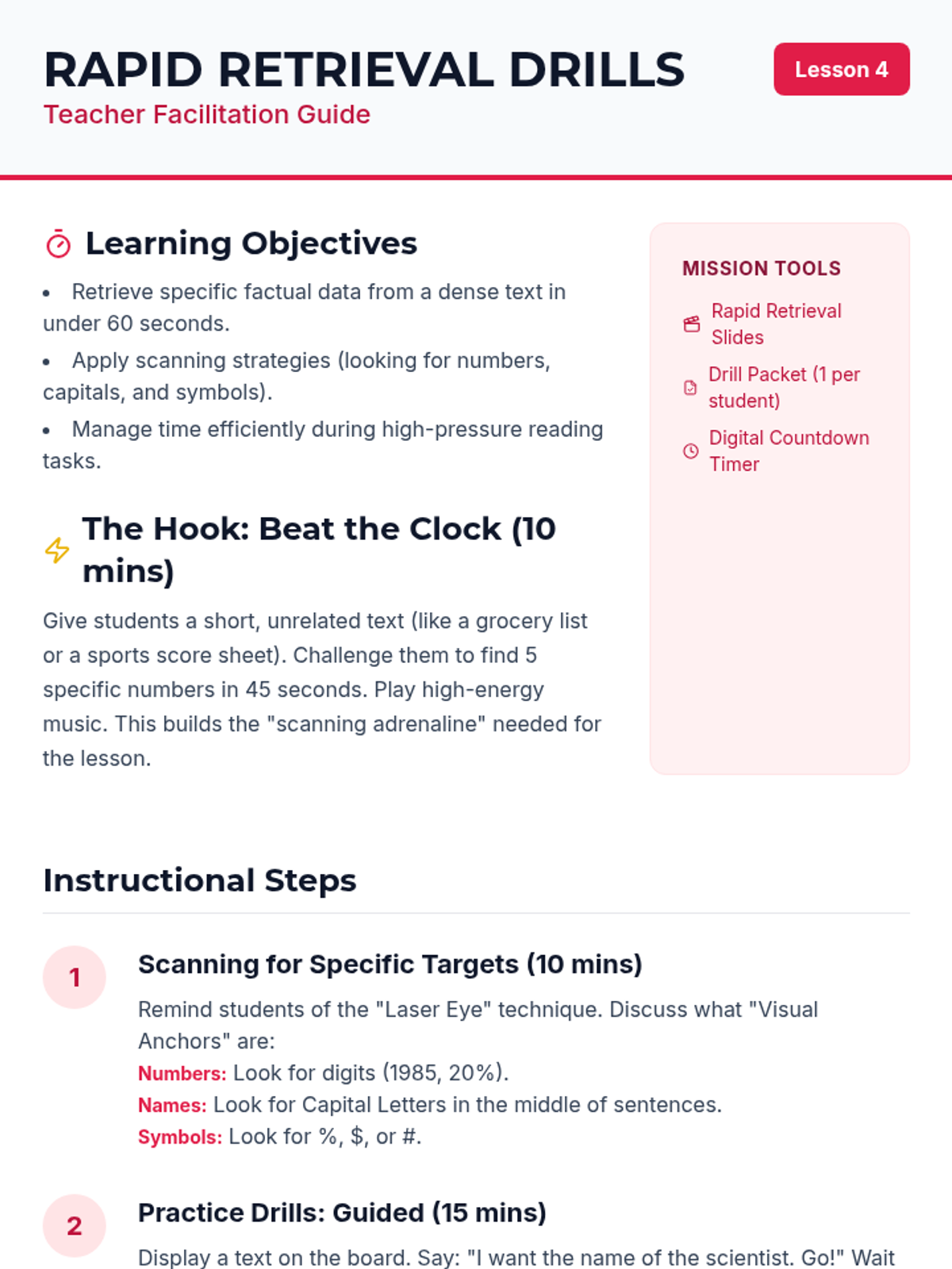 A comprehensive 5-lesson sequence for 8th-grade ESL students focusing on mastering skimming and scanning techniques to improve academic reading efficiency and test performance. Students learn to navigate text structures, identify keywords, recognize synonyms, and apply these strategies under timed conditions.