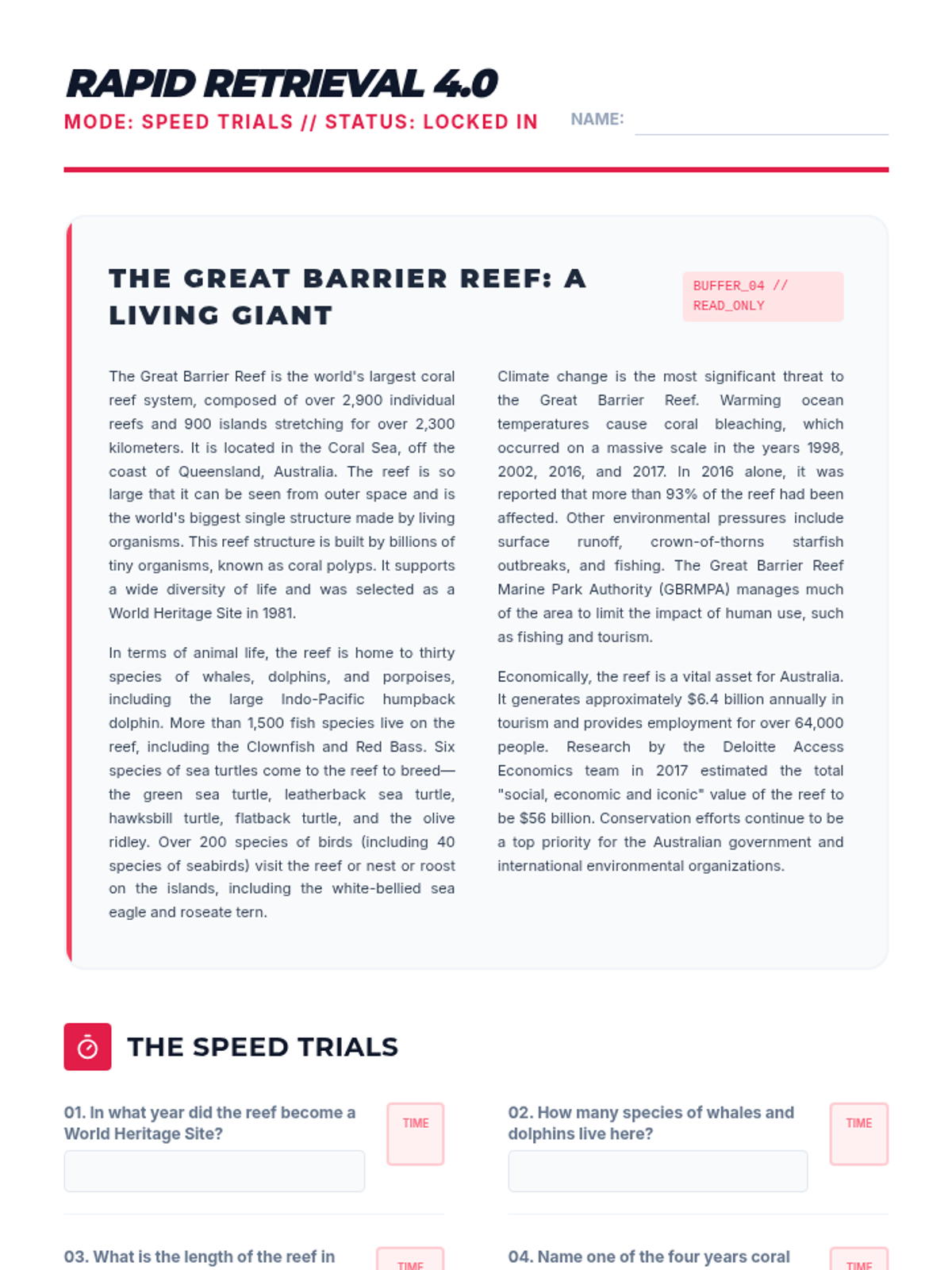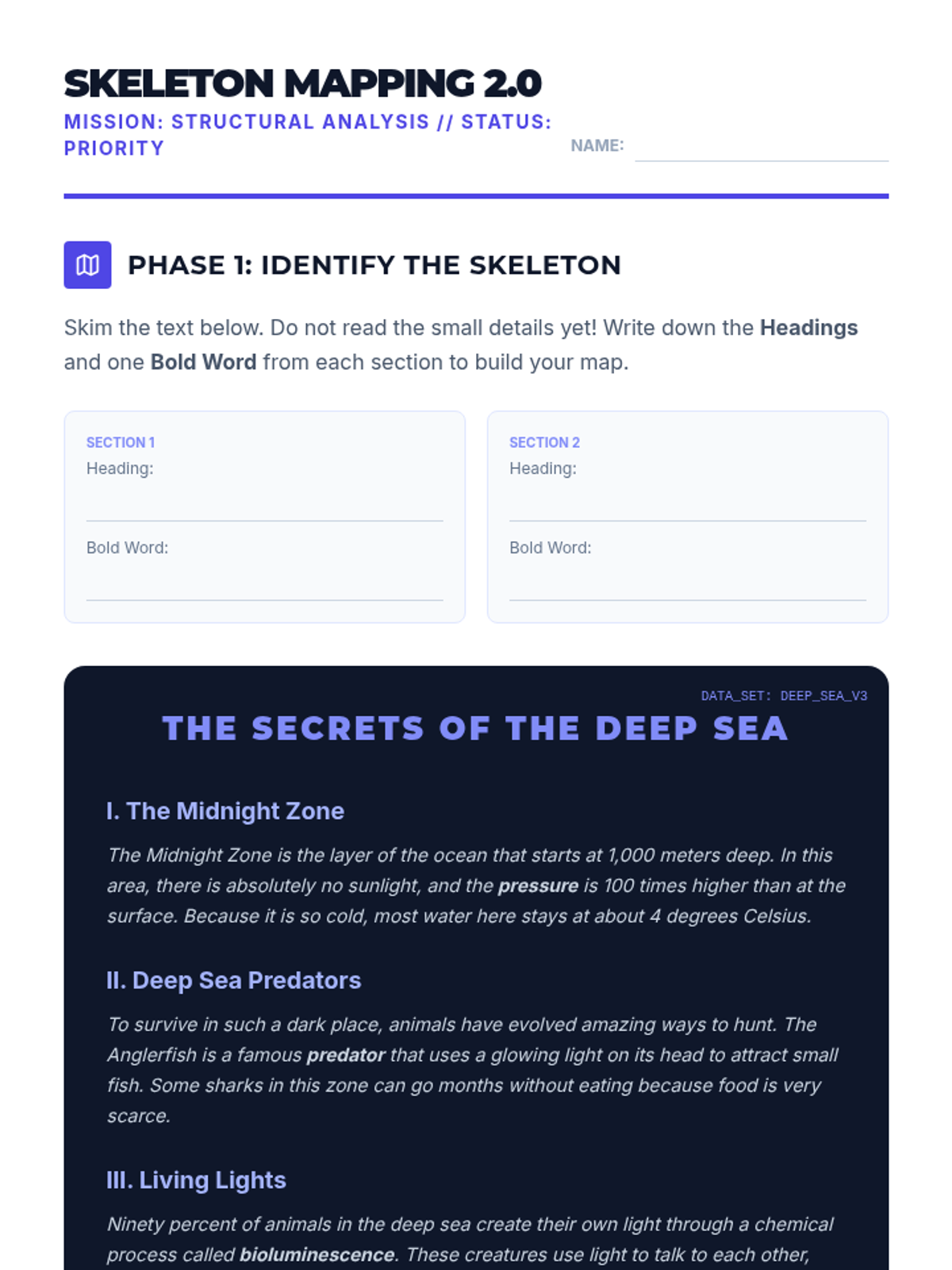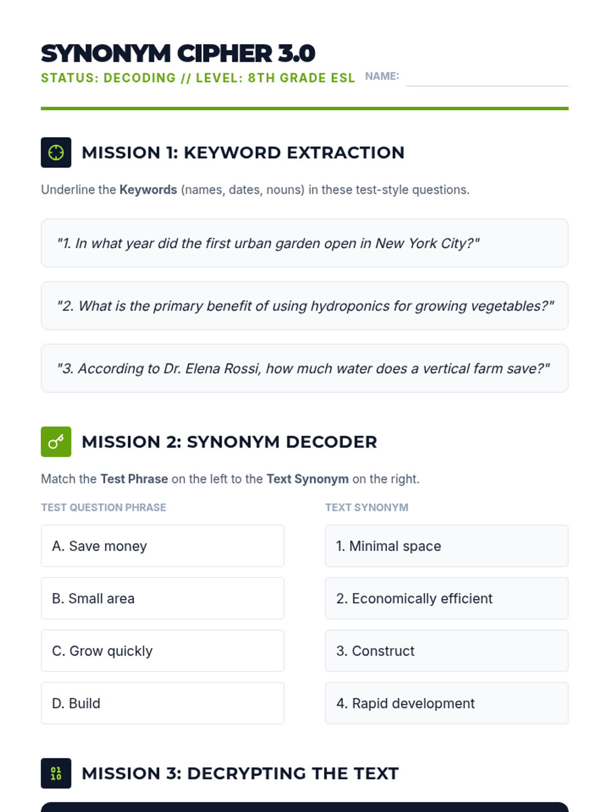 A comprehensive 5-lesson sequence for 8th-grade ESL students focusing on mastering skimming and scanning techniques to improve academic reading efficiency and test performance. Students learn to navigate text structures, identify keywords, recognize synonyms, and apply these strategies under timed conditions.