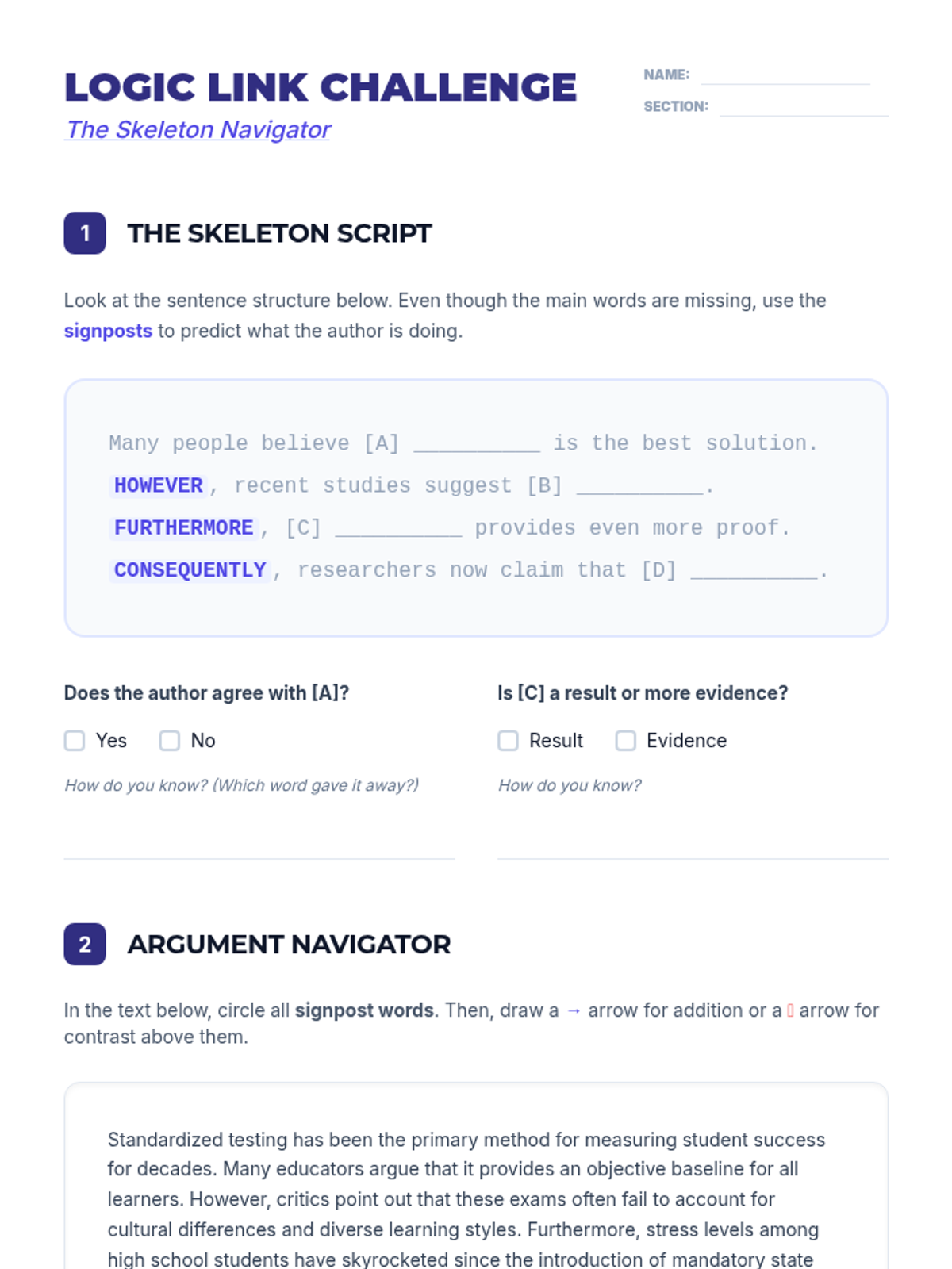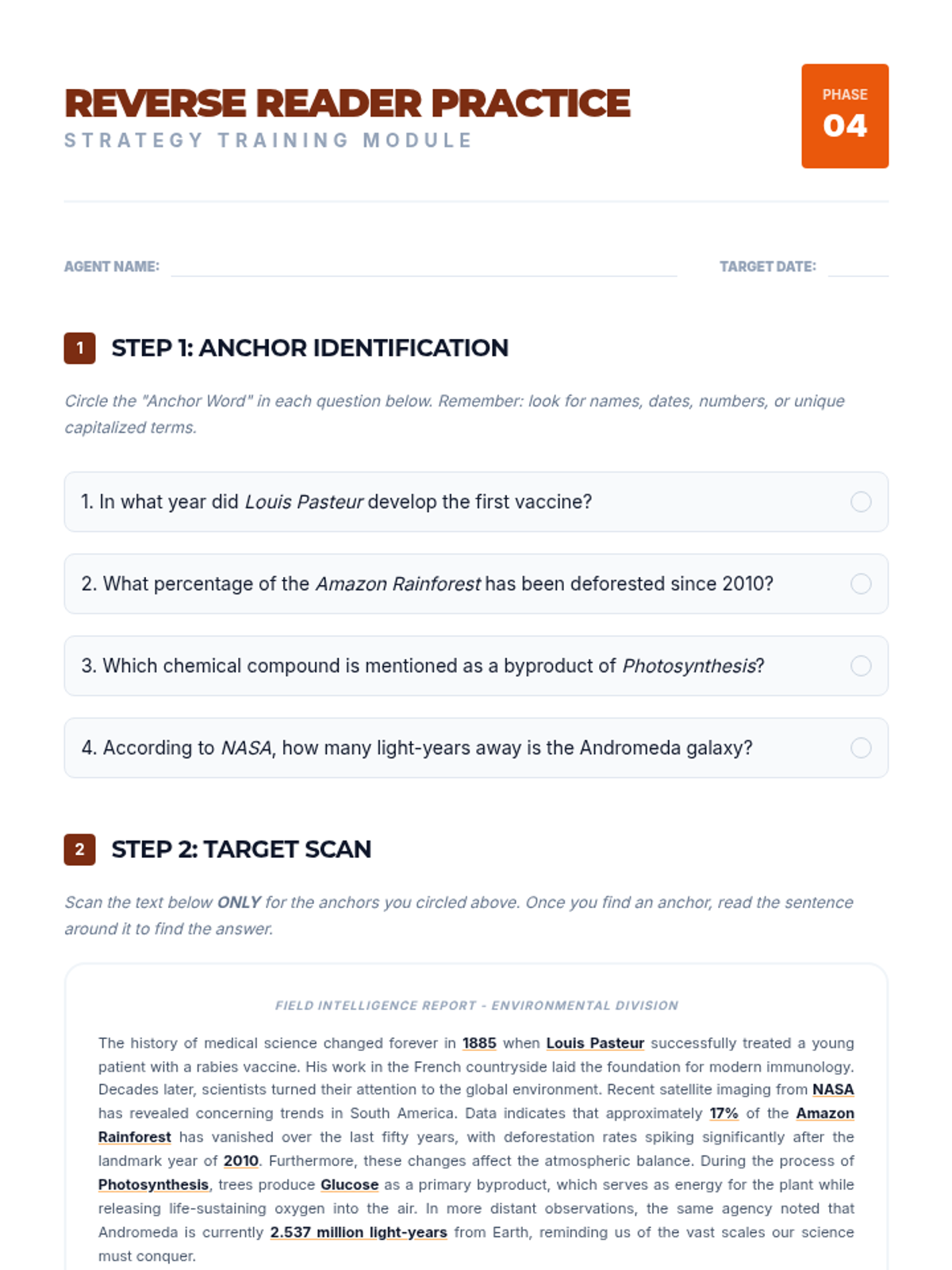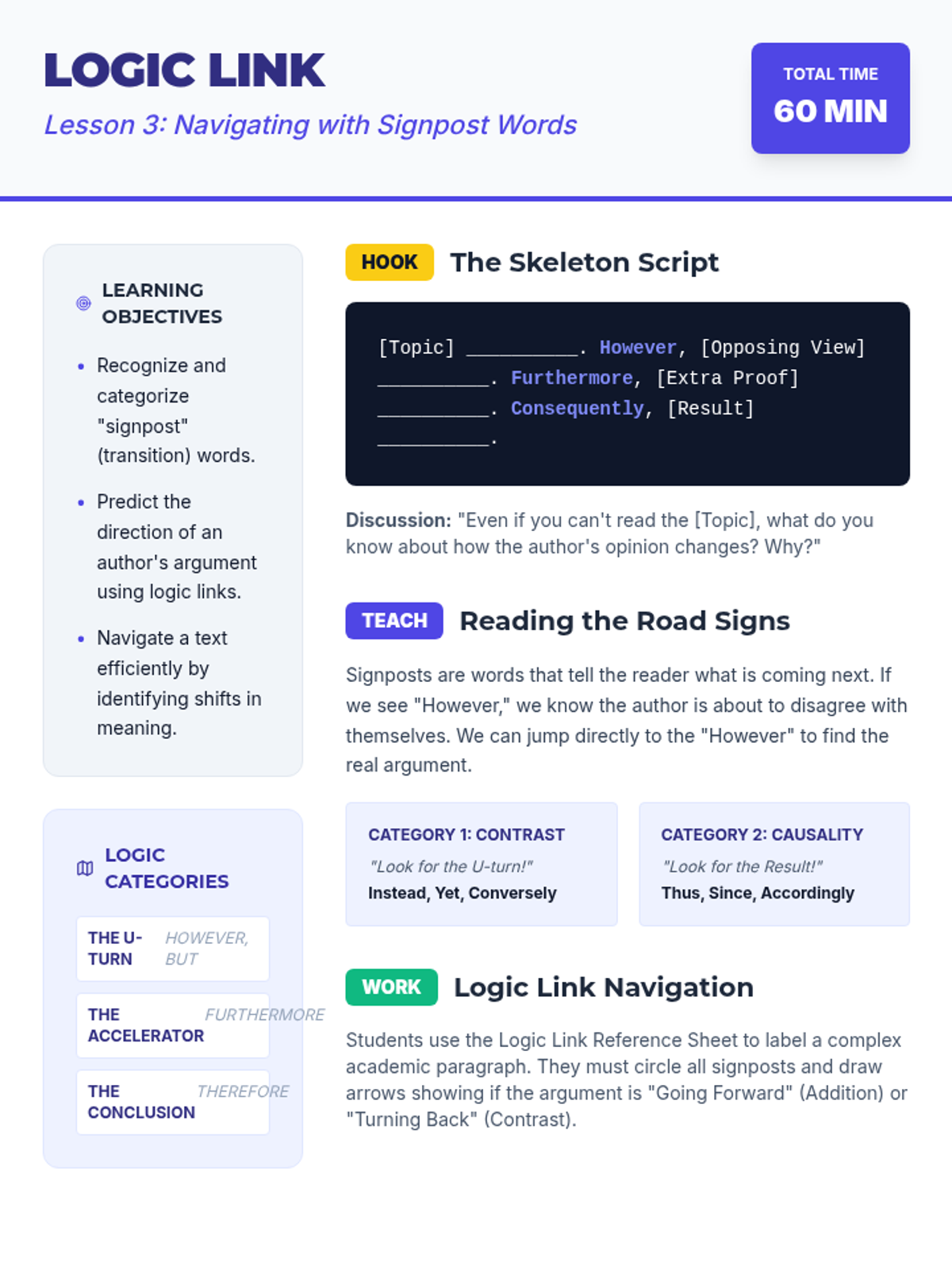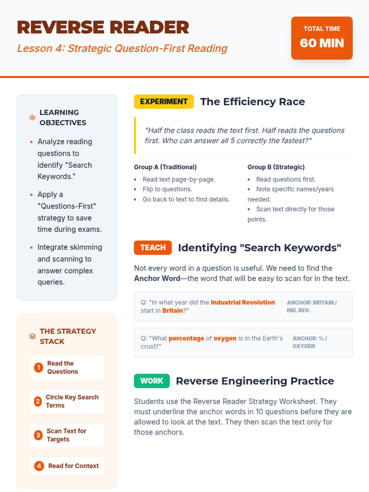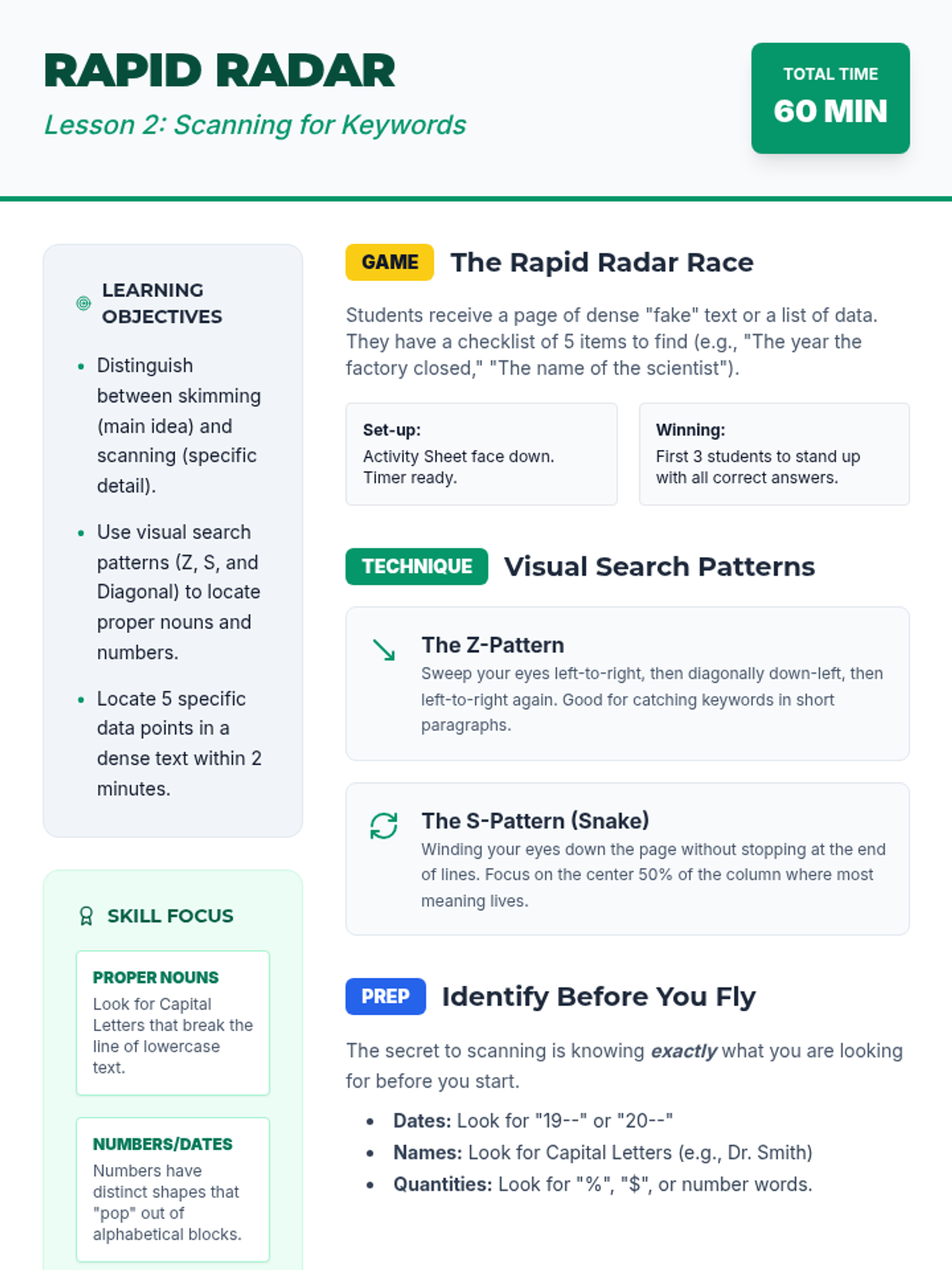 This sequence develops critical reading efficiency for 9th-grade ESL students, focusing on skimming for main ideas and scanning for specific details to succeed in timed academic exams. Students progress from grasping the 'gist' using text features to locating specific data points and utilizing signpost words to navigate complex arguments.