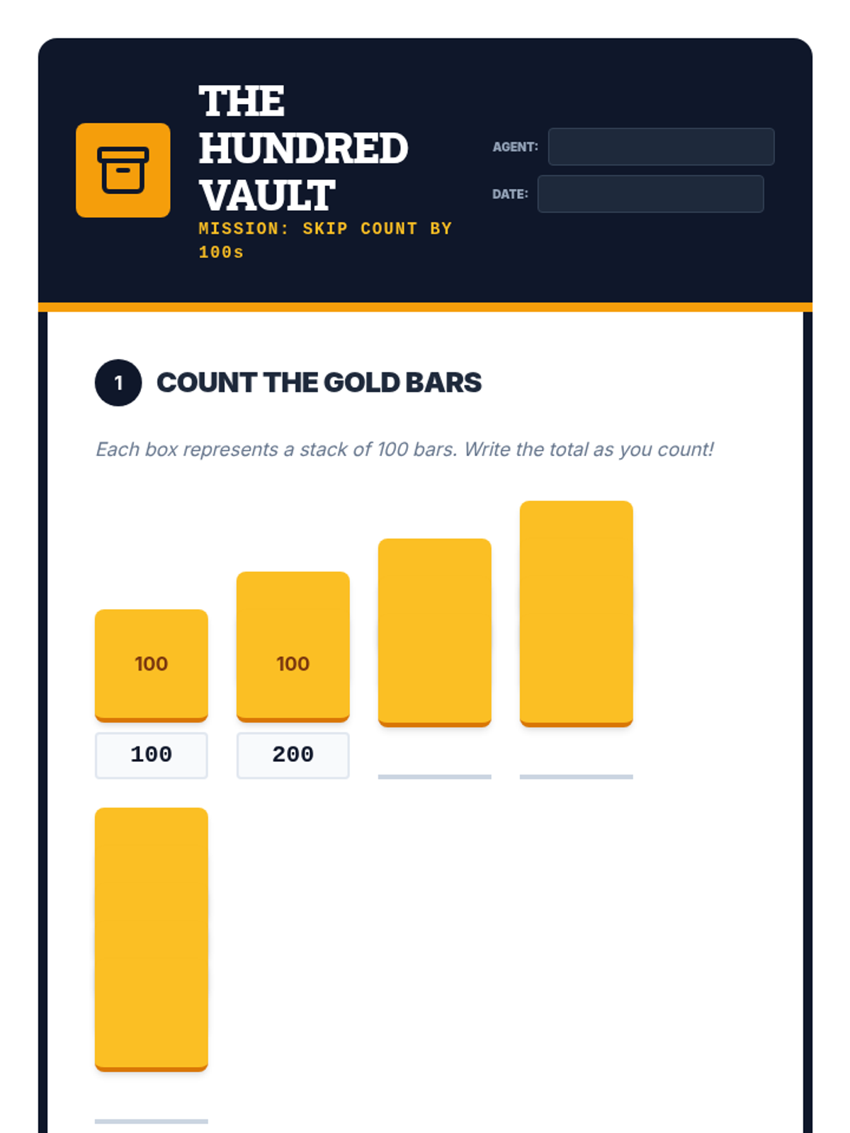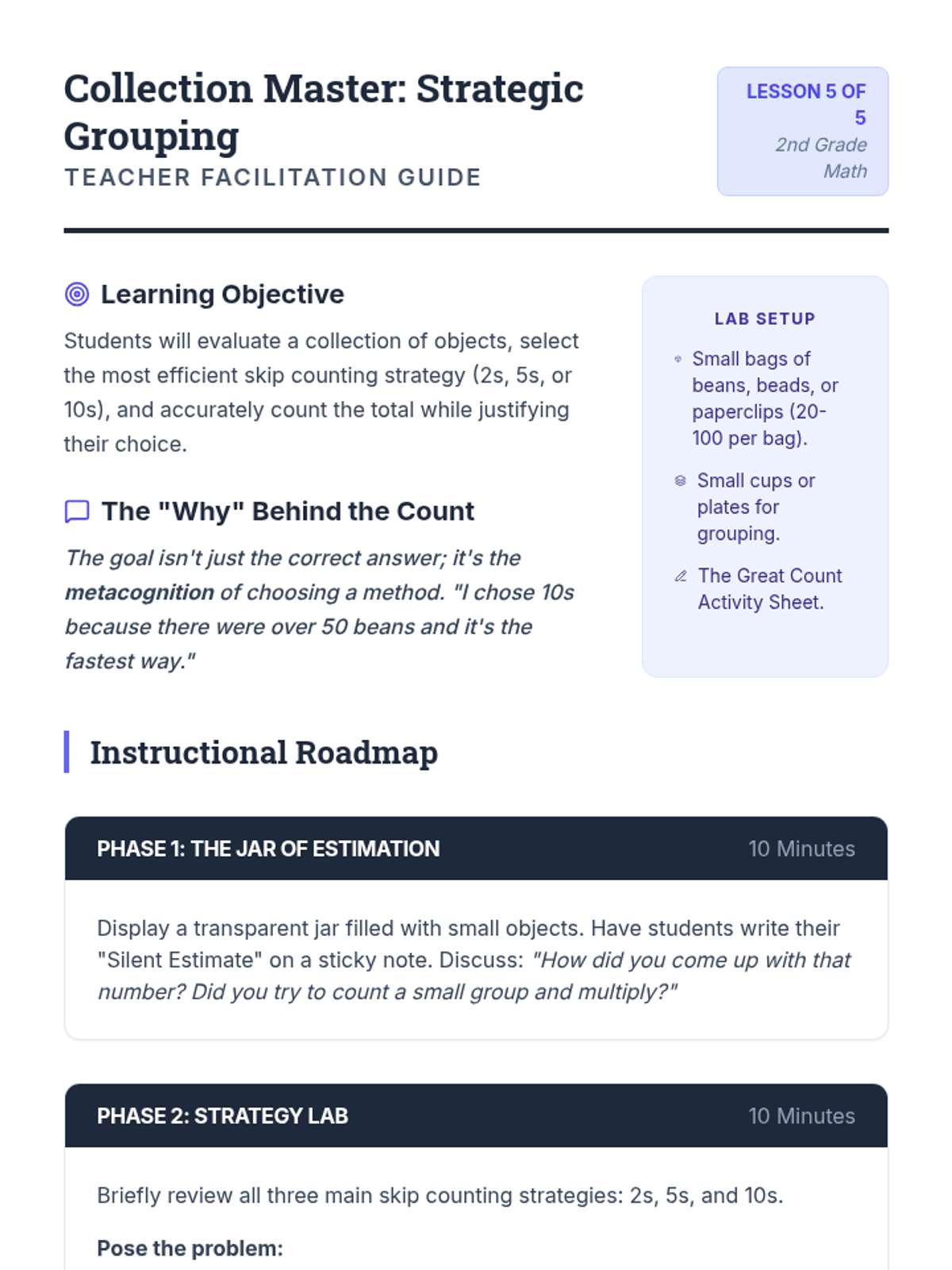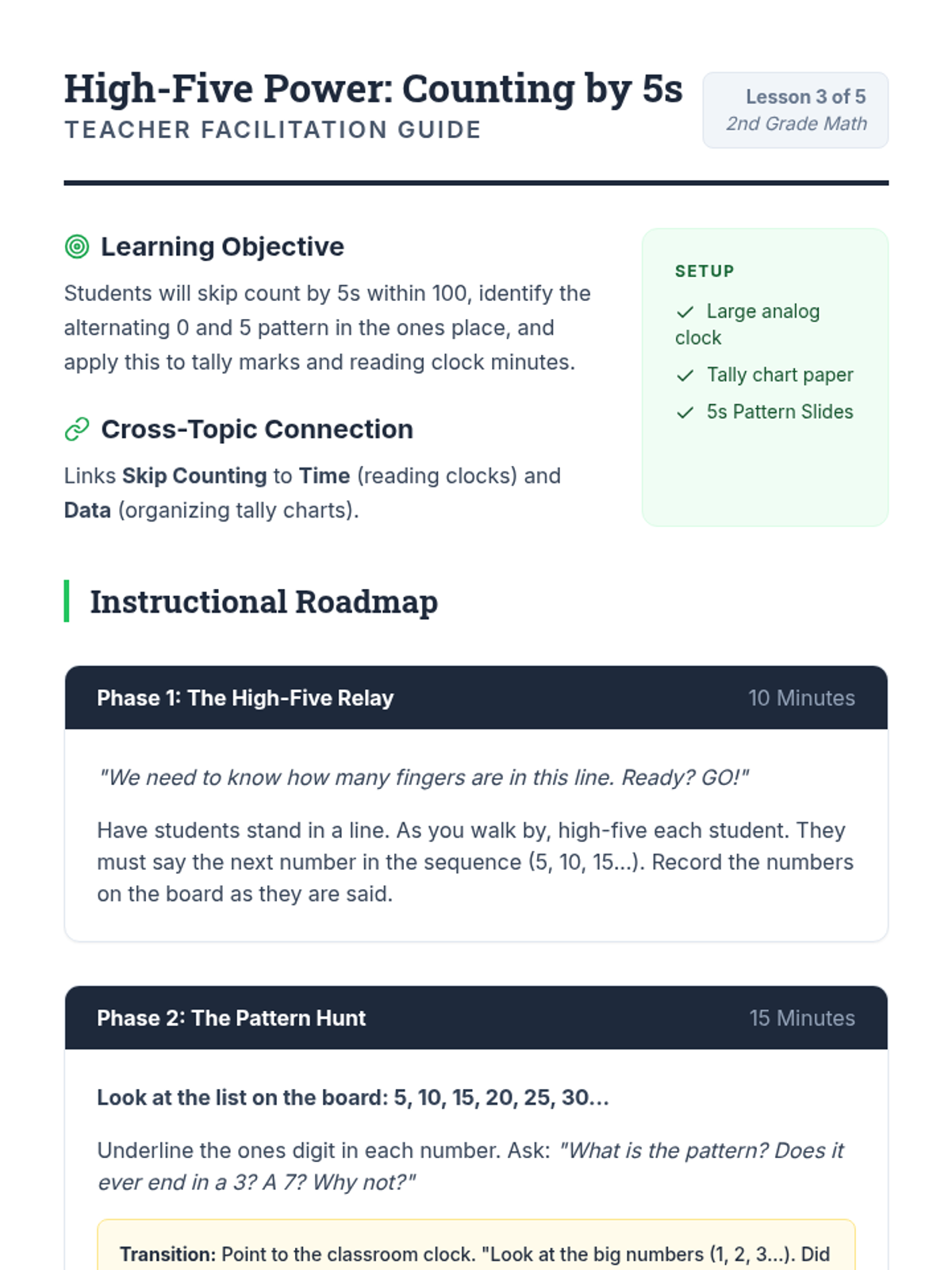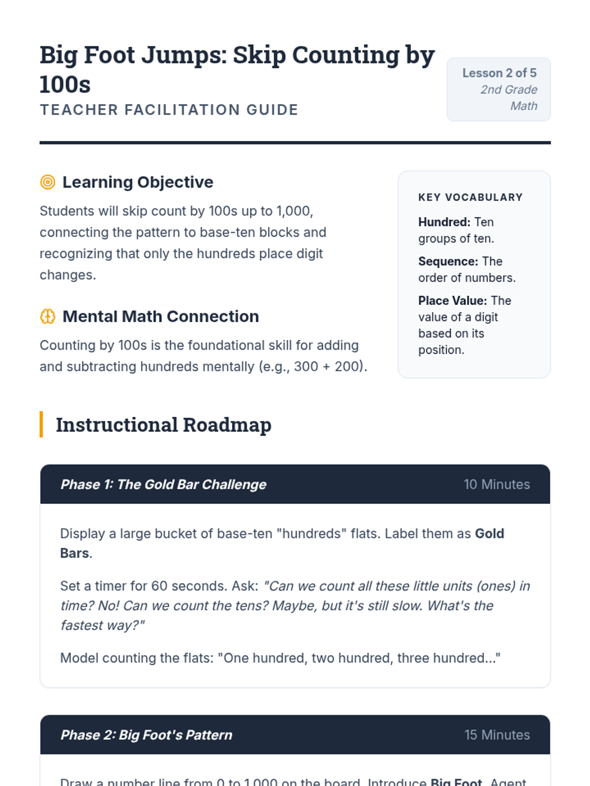 A comprehensive 2nd Grade math sequence focused on skip counting by 5s, 10s, and 100s. Students explore place value patterns, real-world applications like money and clocks, and develop efficient mental math strategies through inquiry-based 'detective' missions.
