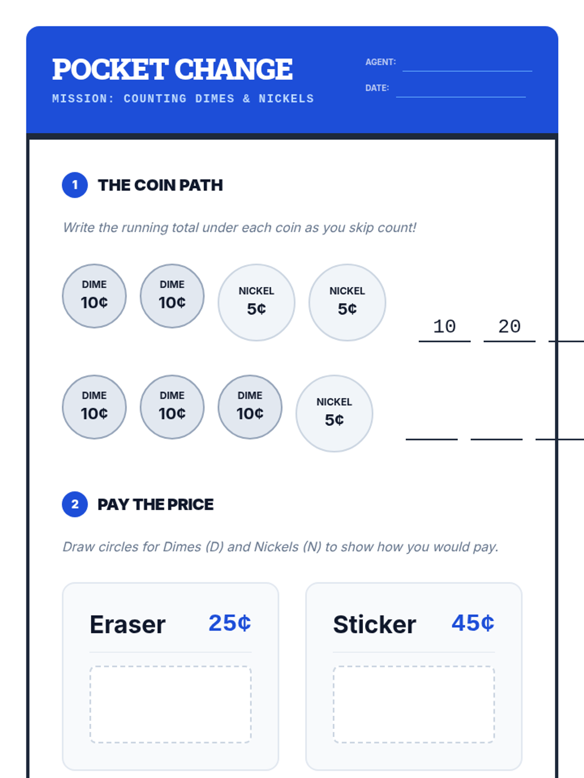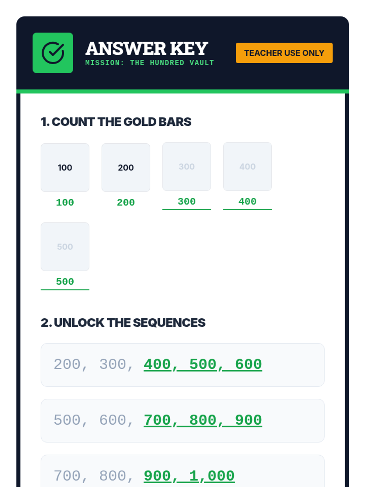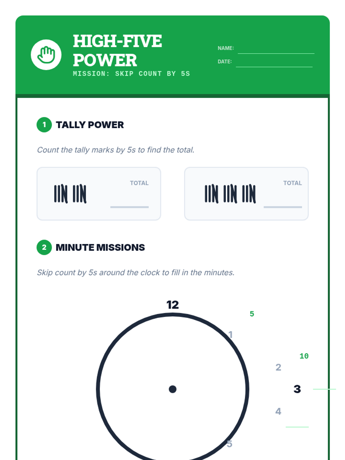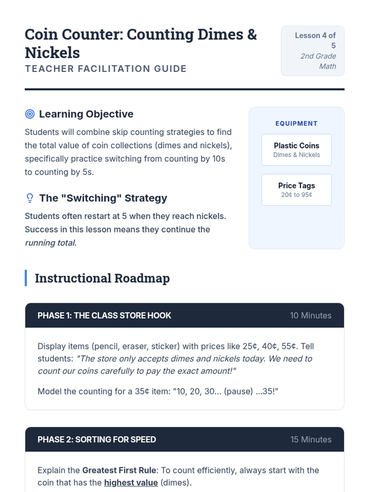 A comprehensive 2nd Grade math sequence focused on skip counting by 5s, 10s, and 100s. Students explore place value patterns, real-world applications like money and clocks, and develop efficient mental math strategies through inquiry-based 'detective' missions.
