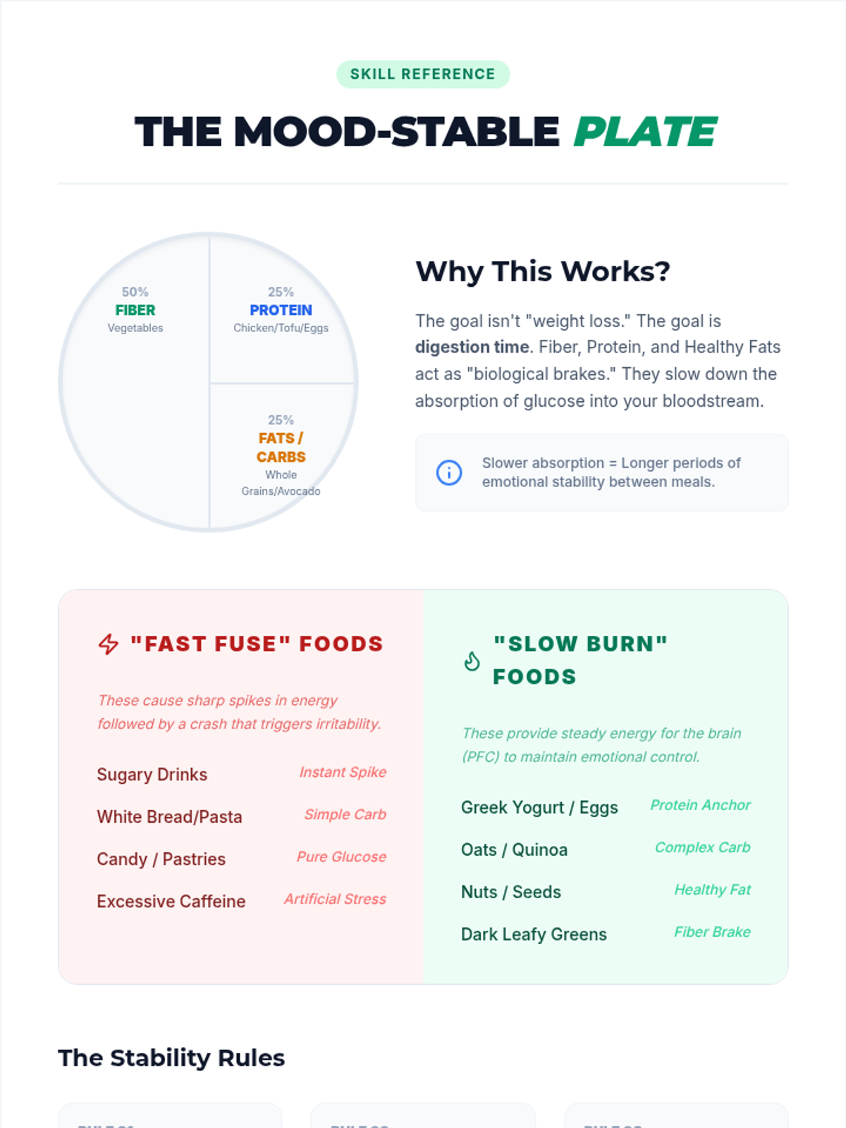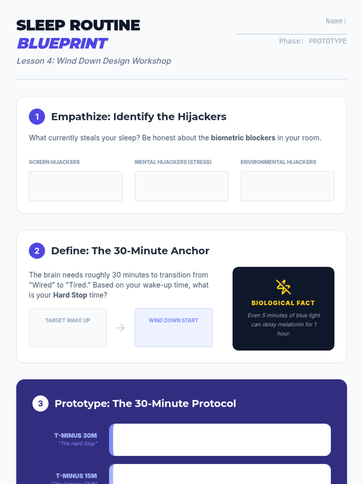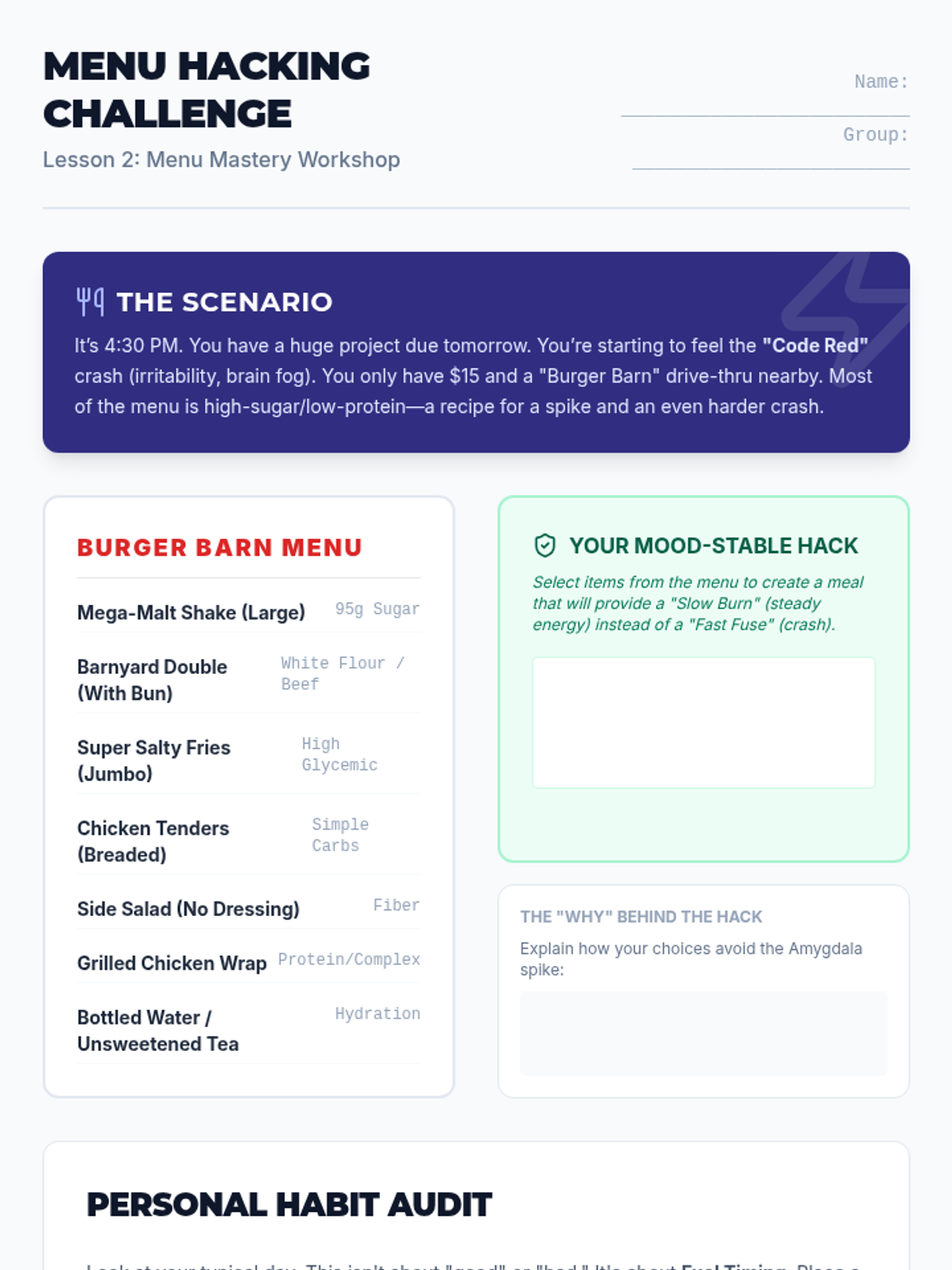 An 11th-grade workshop-style sequence focused on the PLEASE skills of Eating and Sleep. Students analyze the neuroscience of blood sugar and sleep architecture to create personalized, realistic routines for emotional stability.