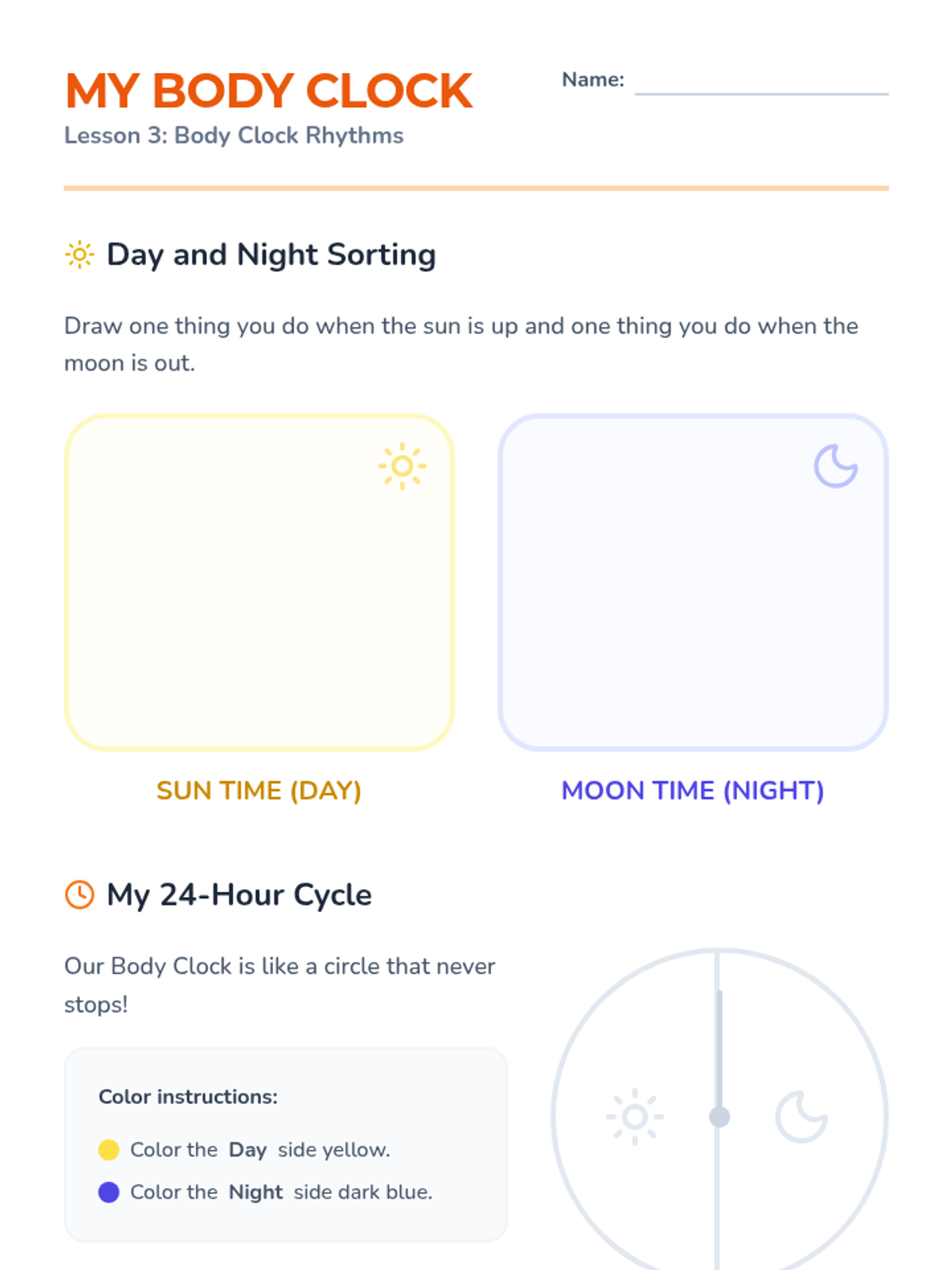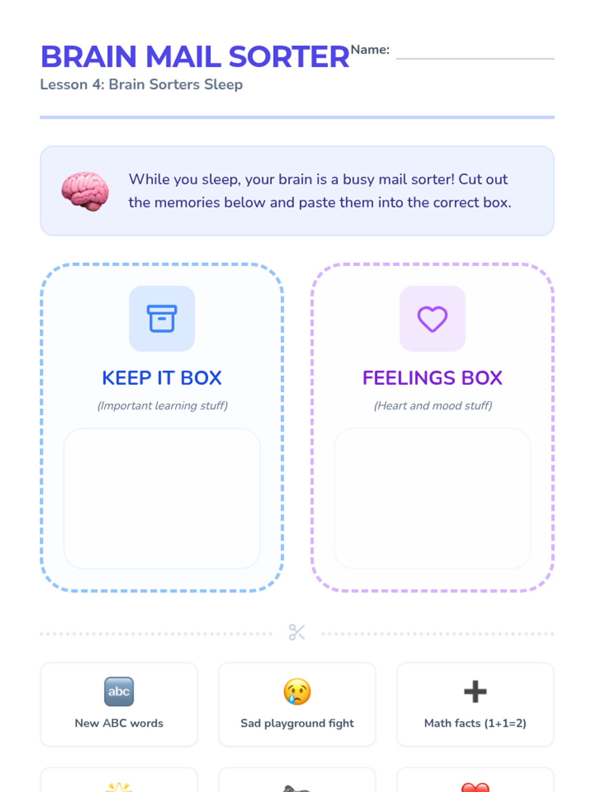 An inquiry-based exploration for 1st graders into why sleep is vital for energy, mood, and brain function. Students use analogies like 'body batteries' and 'mail sorting brains' to understand restoration and growth.