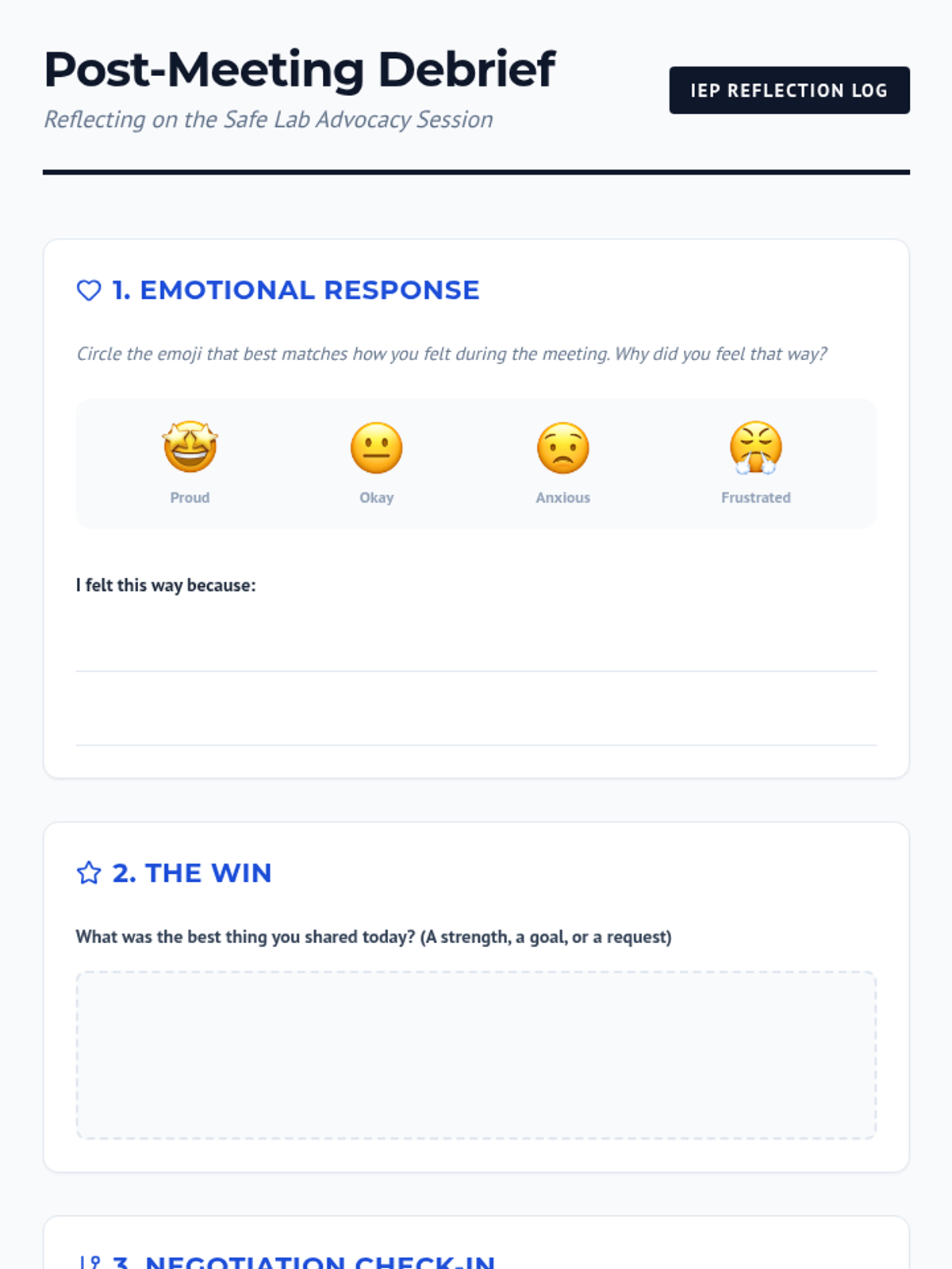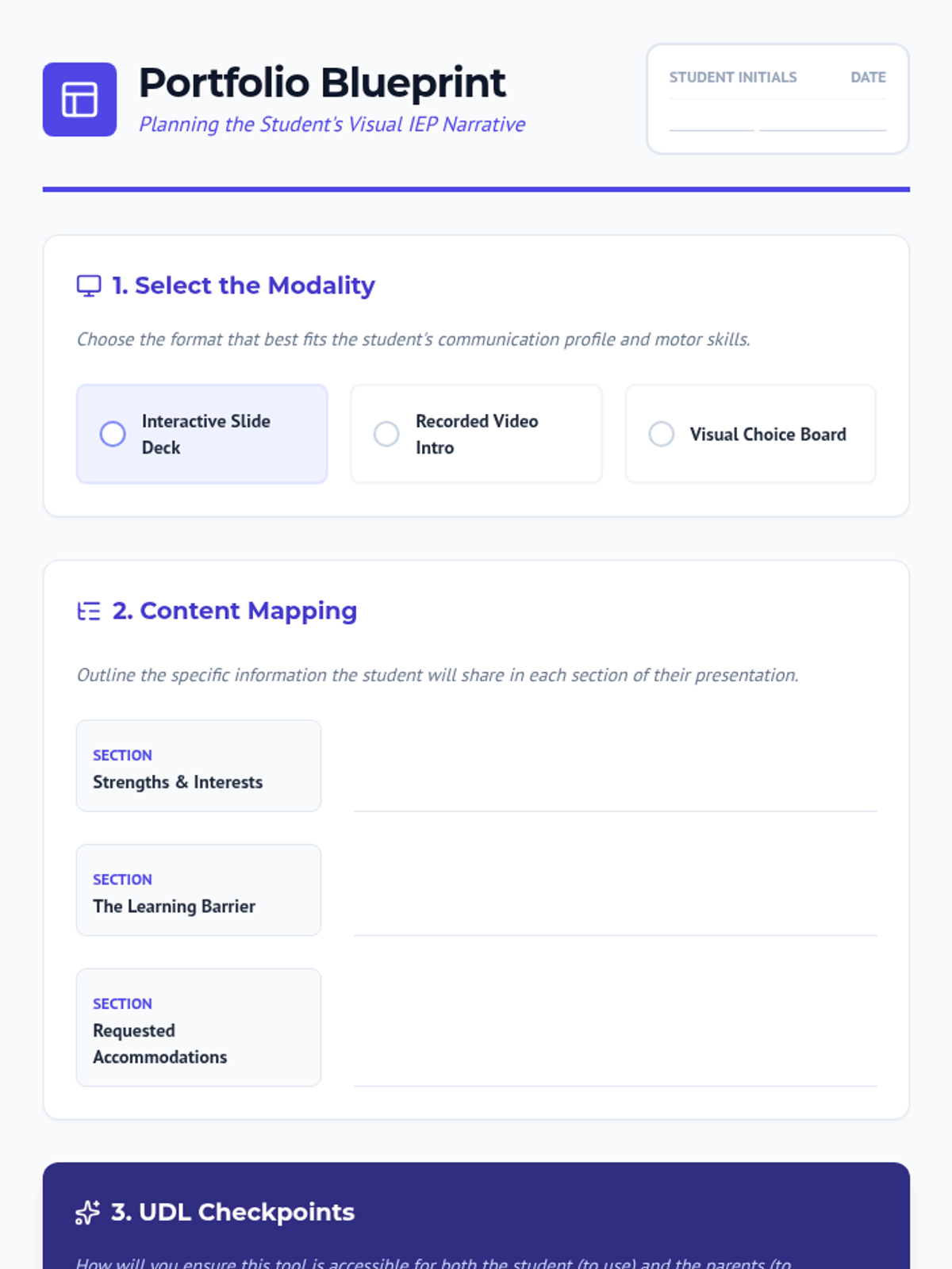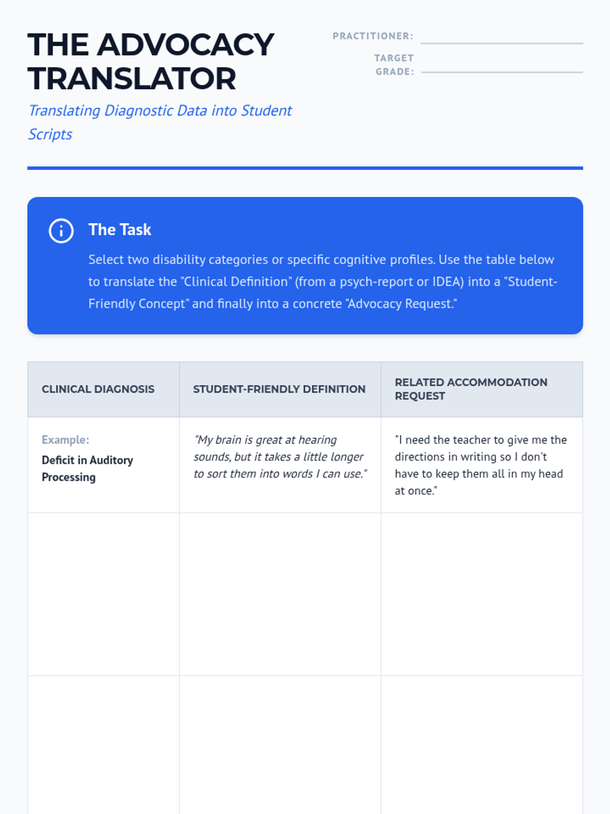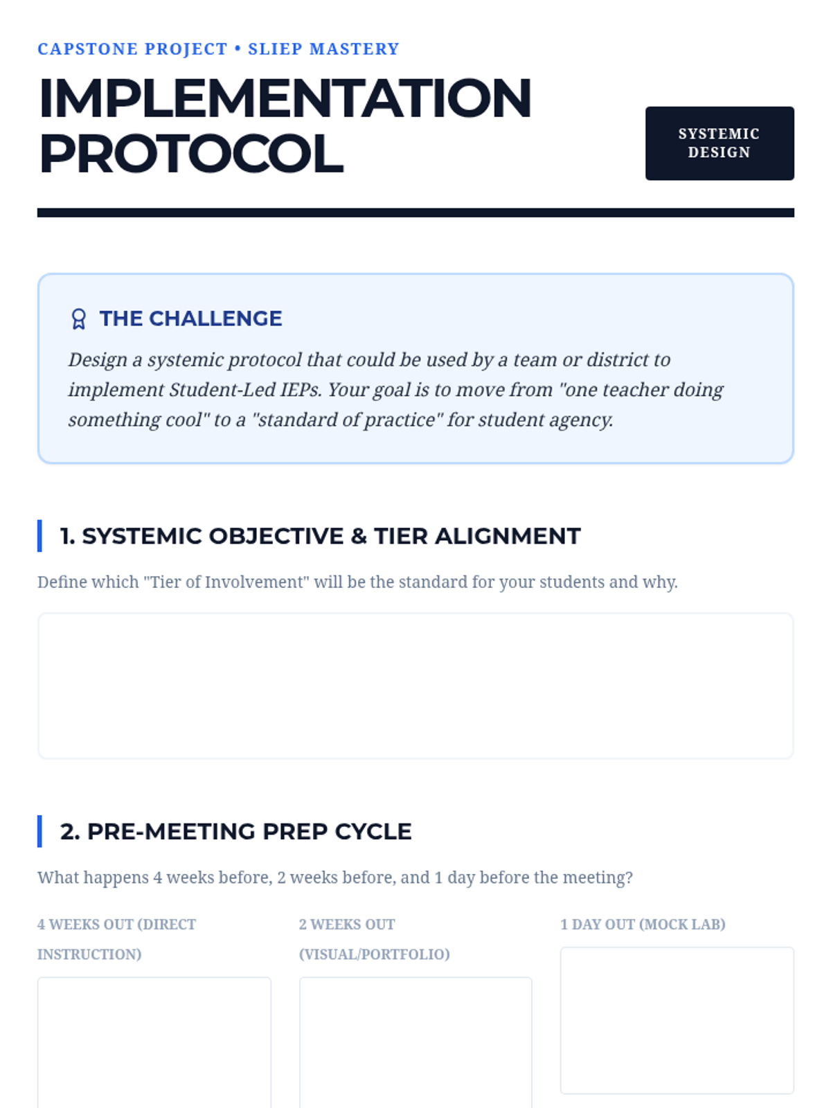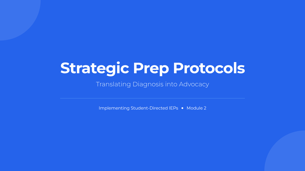 A comprehensive sequence for graduate students to master the implementation of Student-Led IEPs (SLIEPs). This sequence explores the continuum of student involvement, preparation protocols, visual advocacy aids, meeting facilitation techniques, and post-meeting reflection to empower students as self-advocates for their own accommodations.