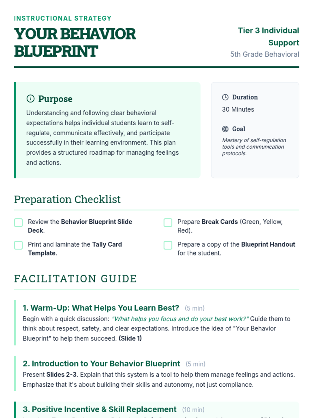 A comprehensive 8-lesson intervention using the Prevent, Teach, Reinforce (PTR) model to help students transition from defiant avoidance to self-regulated break-taking.