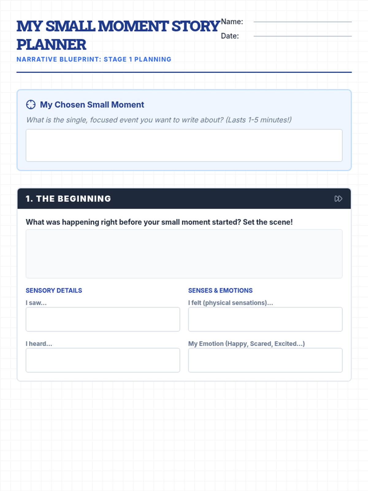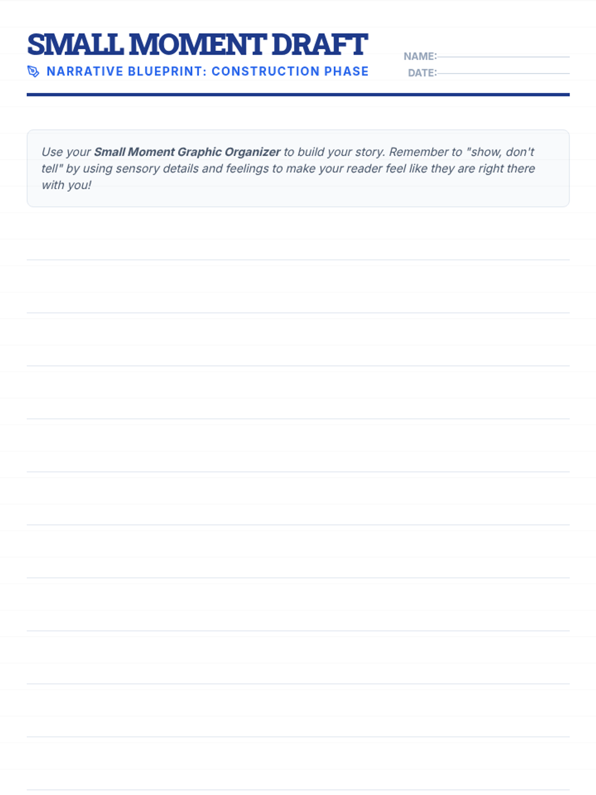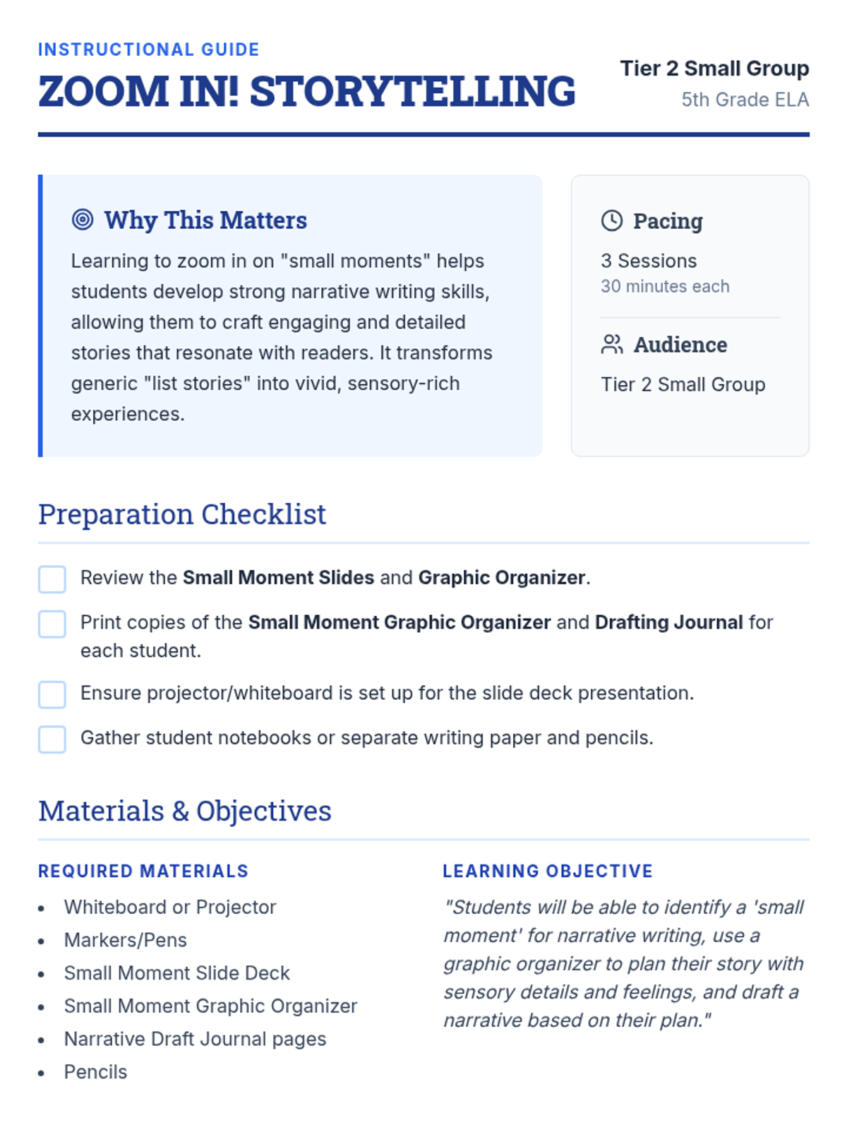 This instructional sequence provides targeted Tier 2 and Tier 3 supports for 5th-grade students, focusing on narrative writing skills and individual behavioral self-regulation strategies using a 'blueprint' thematic approach.