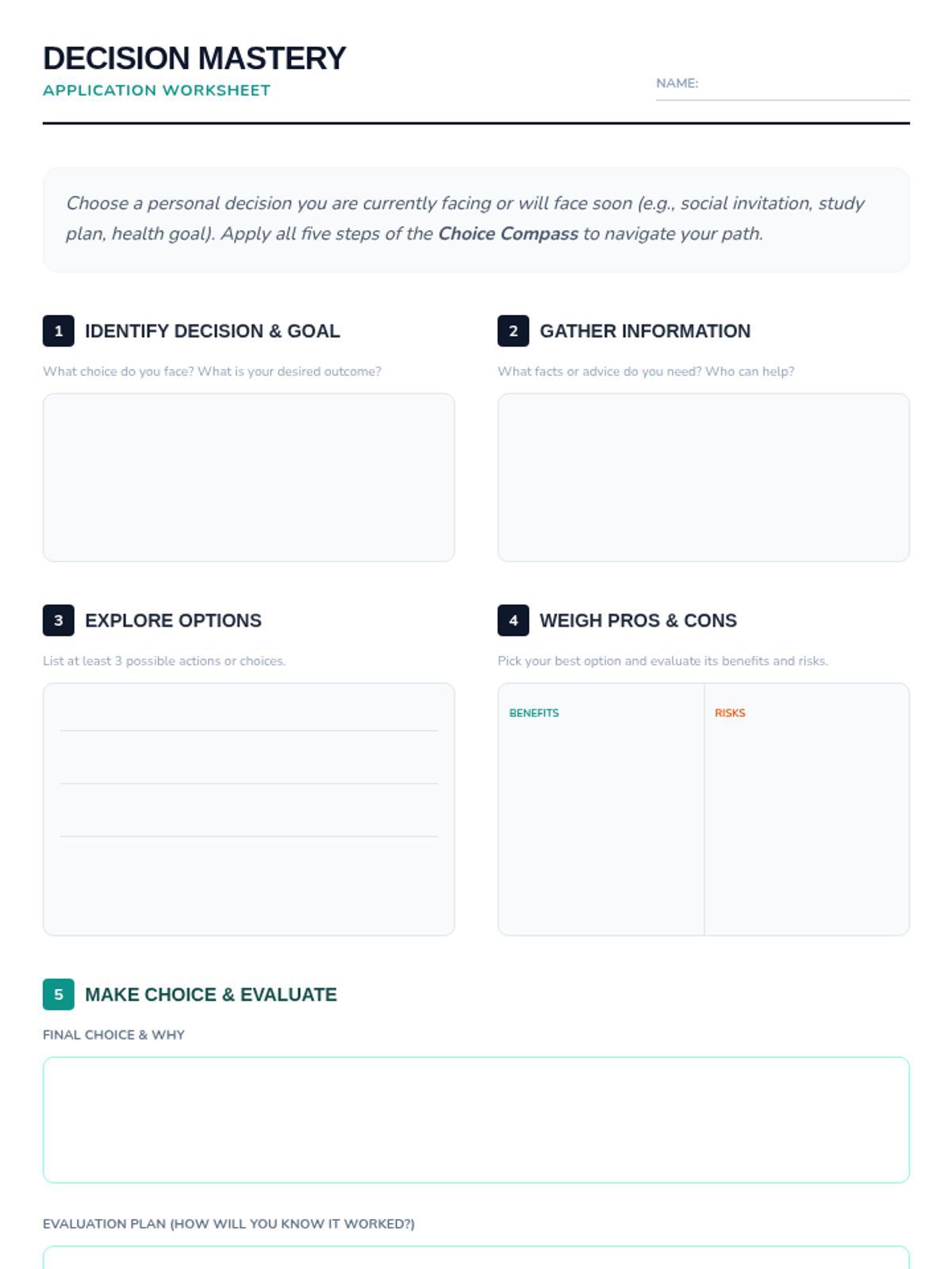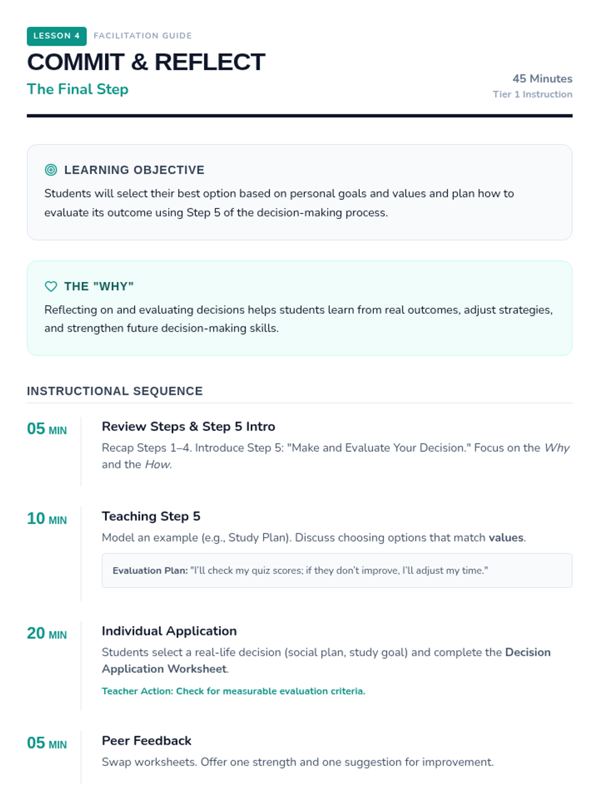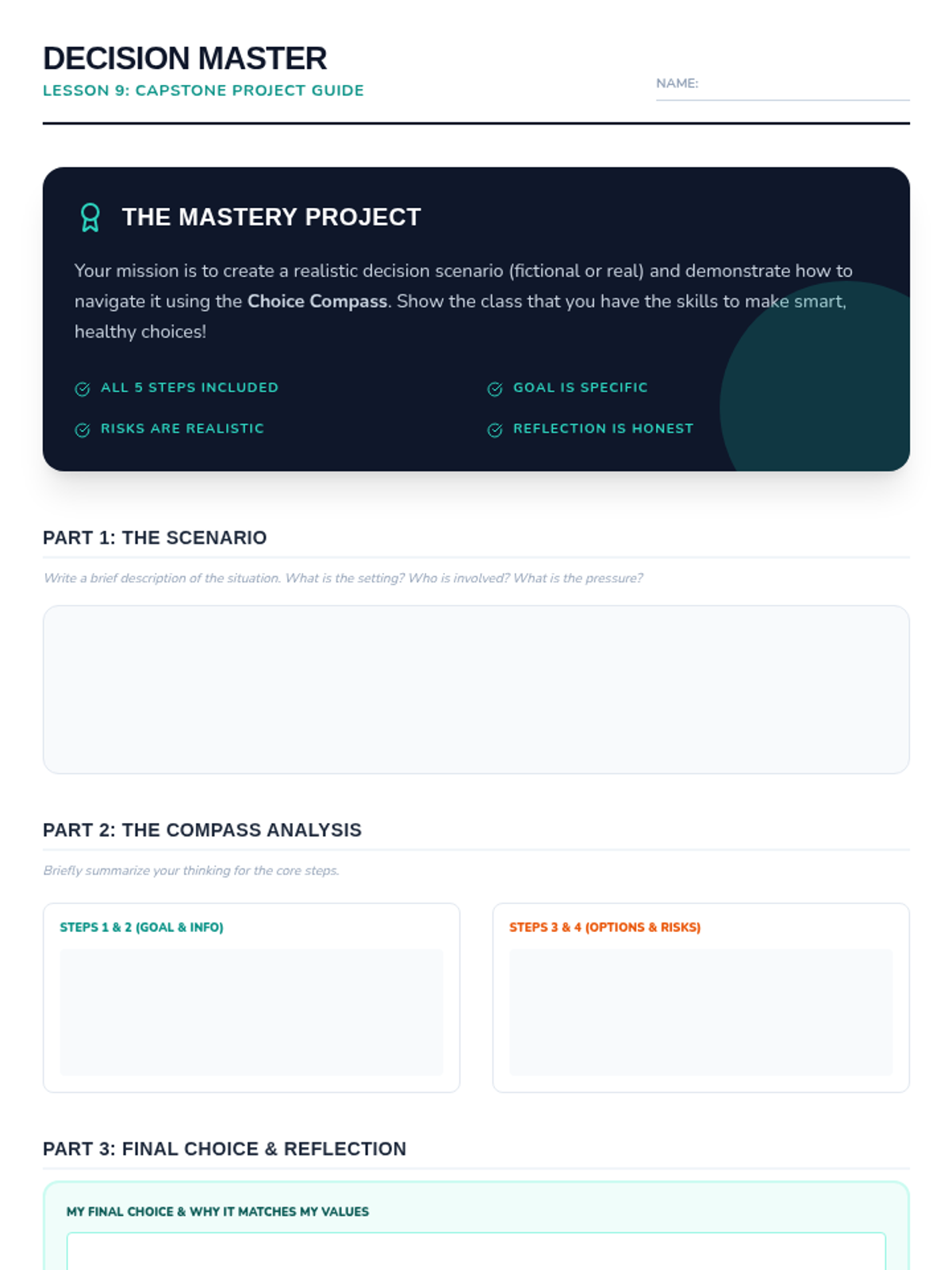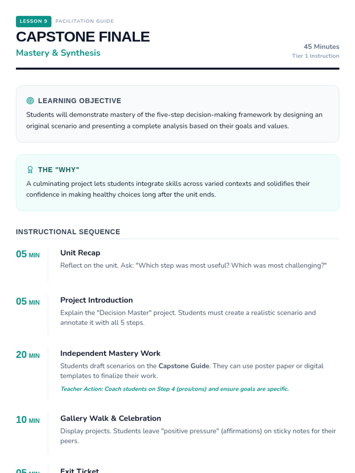 A comprehensive 9-lesson 7th-grade health unit focusing on a structured five-step decision-making process applied to substance use, peer pressure, and healthy lifestyle habits.