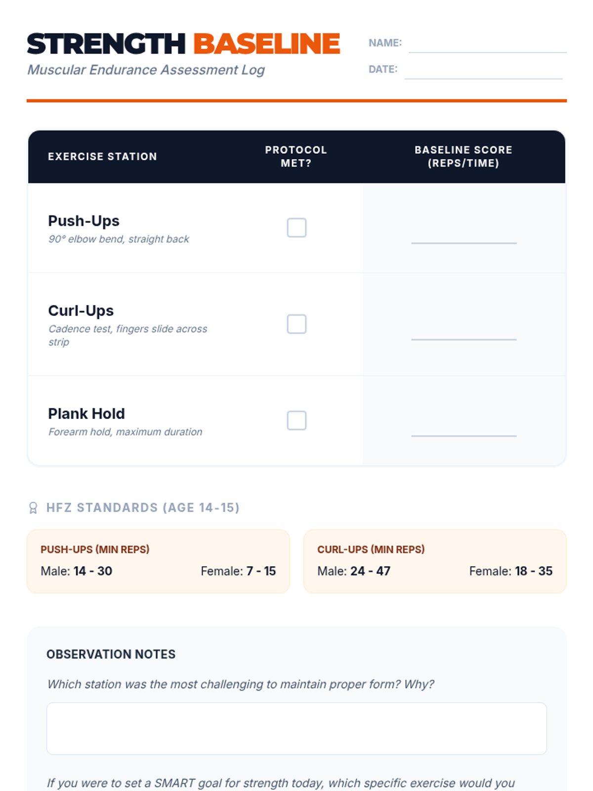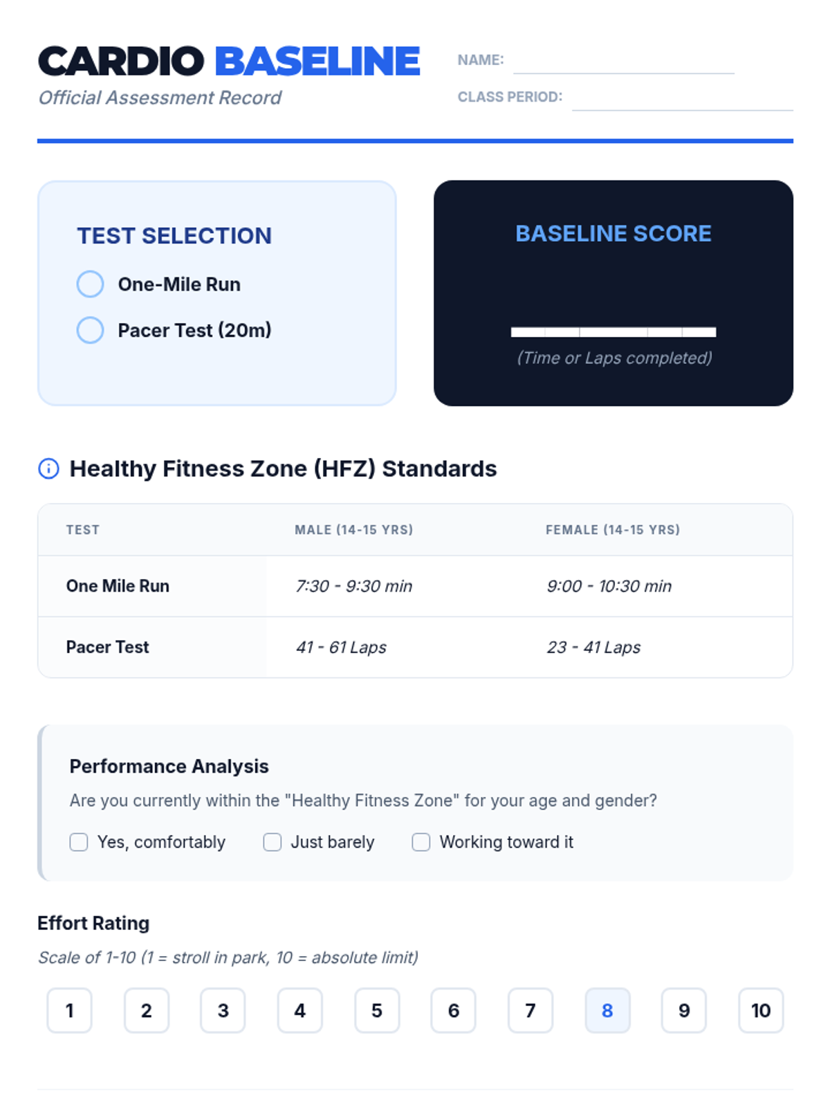 A comprehensive 9th-grade Physical Education unit that guides students through the transition from vague aspirations to data-driven fitness planning. Students will learn the SMART framework, conduct physical assessments, analyze their personal data, and codify their commitment in a formal fitness contract.
