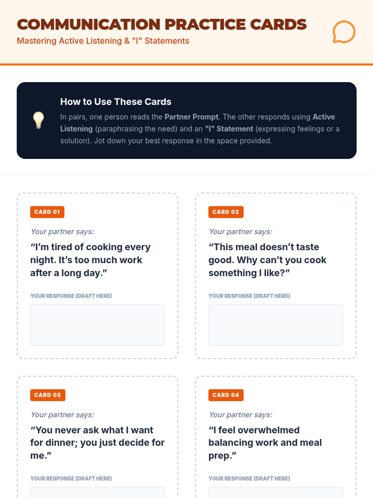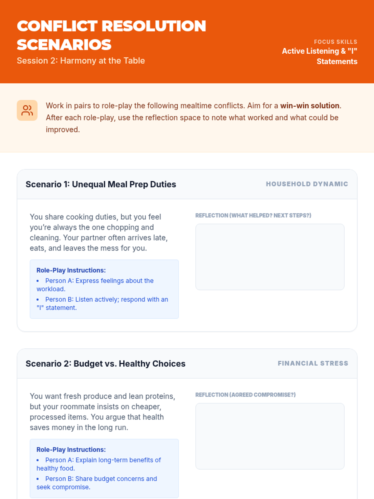 A two-session adult workshop sequence that combines practical nutrition education with interpersonal conflict resolution skills. Participants learn to navigate food labels, plan quick healthy meals, and manage mealtime disagreements using effective communication techniques.