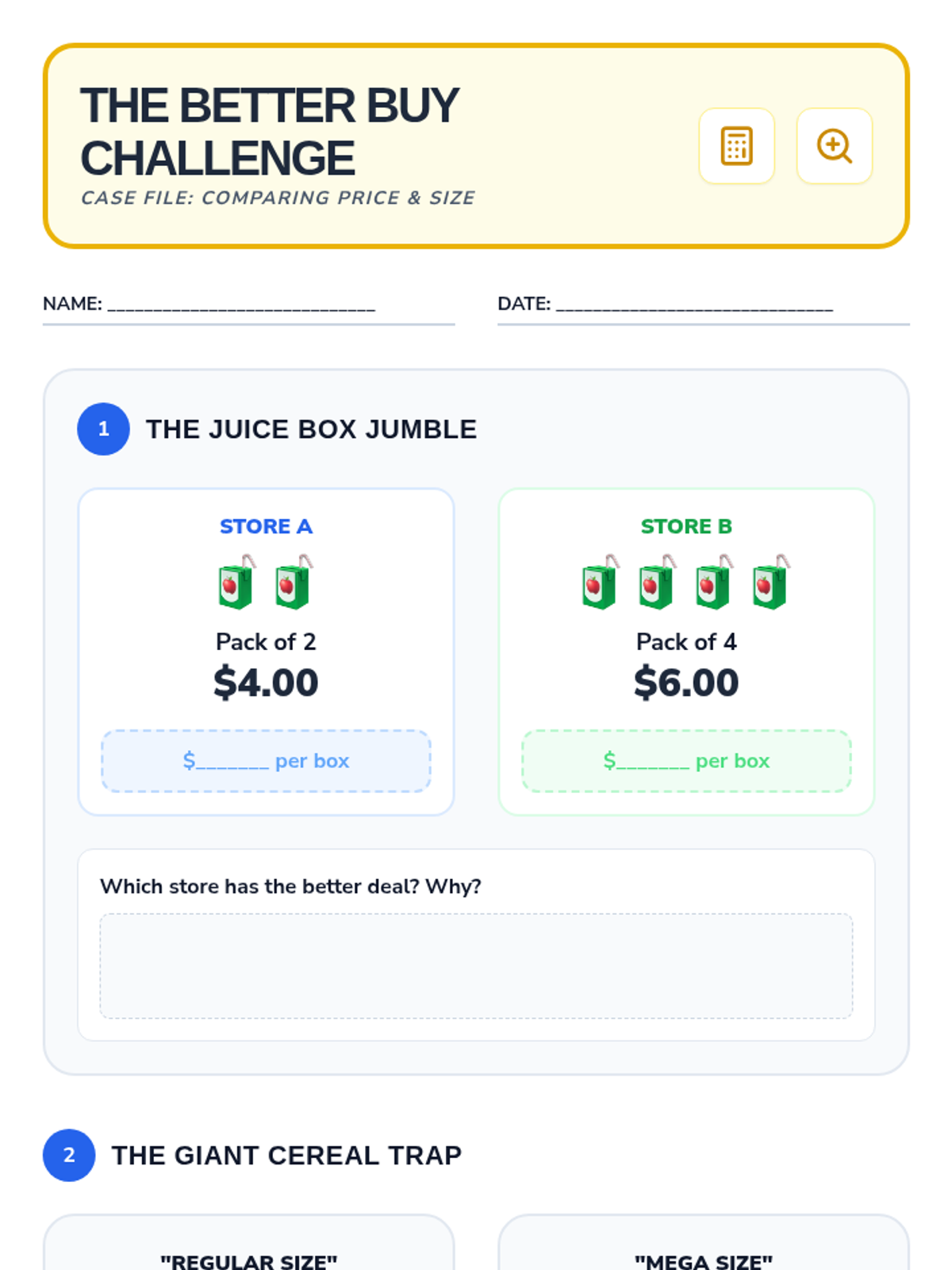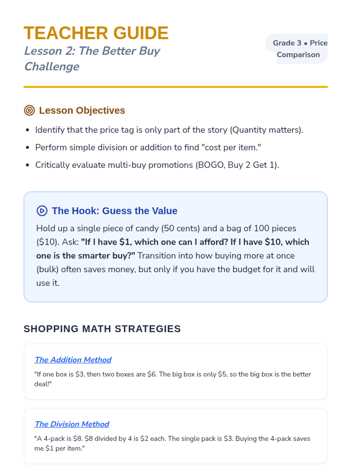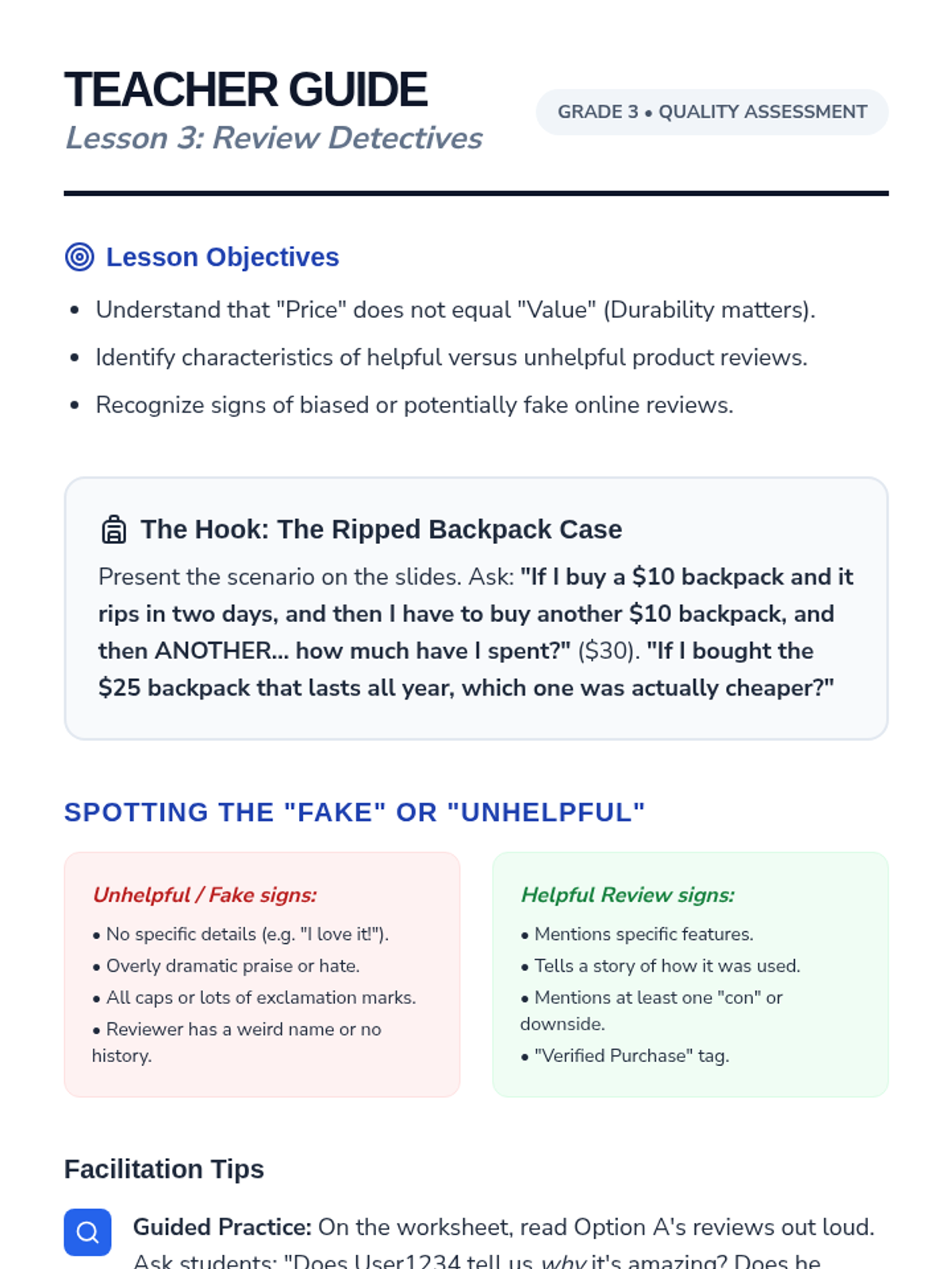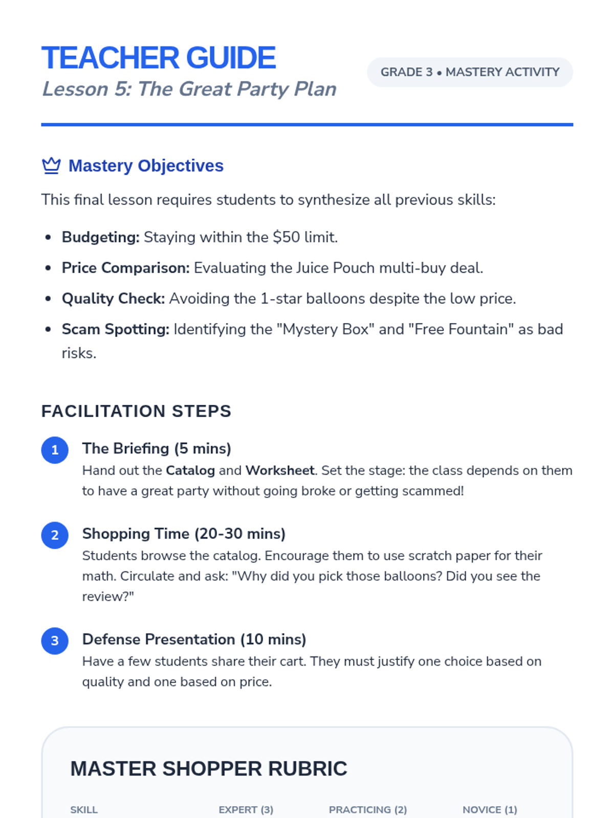 This sequence teaches 3rd-grade students how to make smart consumer choices by distinguishing needs from wants, comparing prices and quality, and identifying potential scams. Through hands-on simulations and critical thinking exercises, students develop the skills to manage a budget effectively and protect themselves in a digital marketplace.