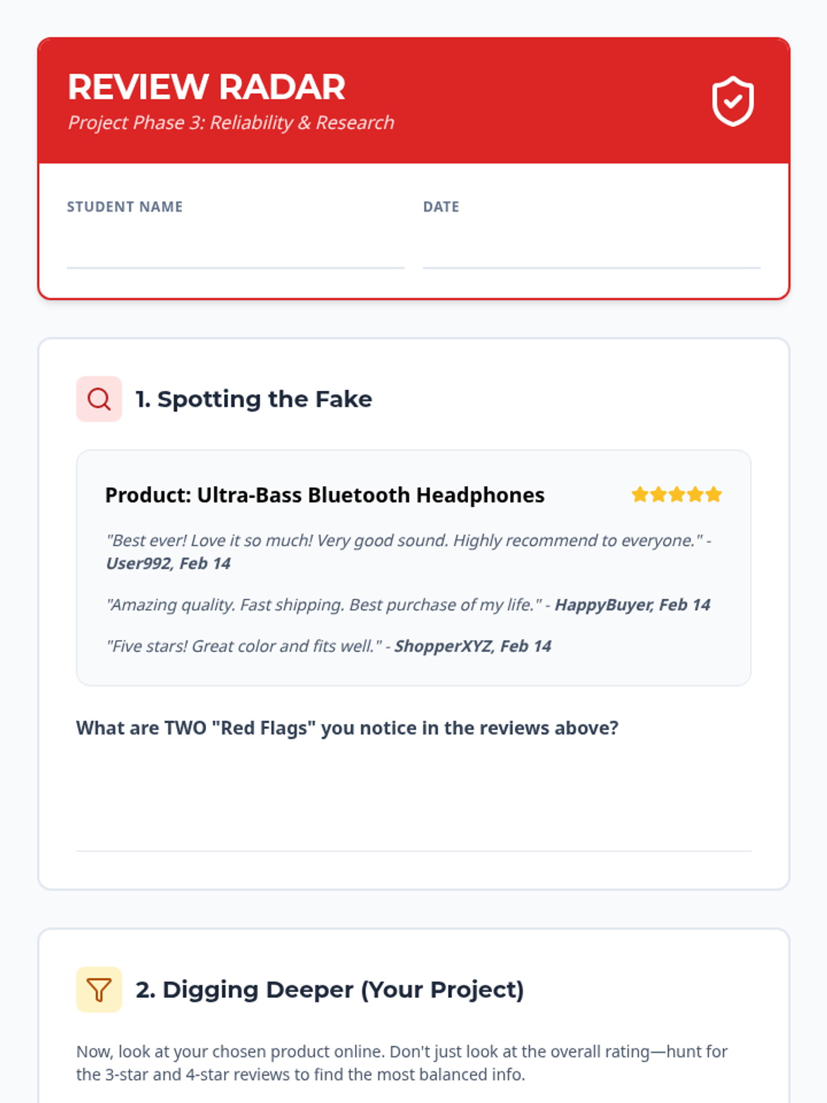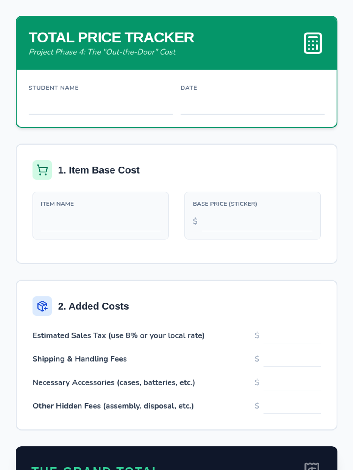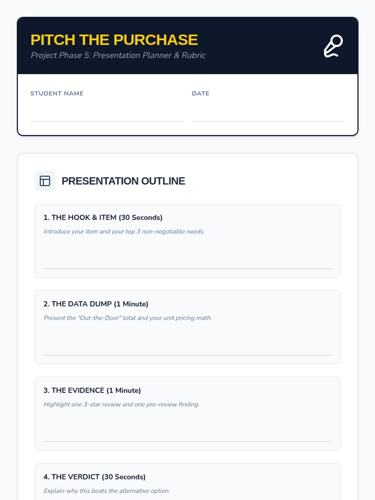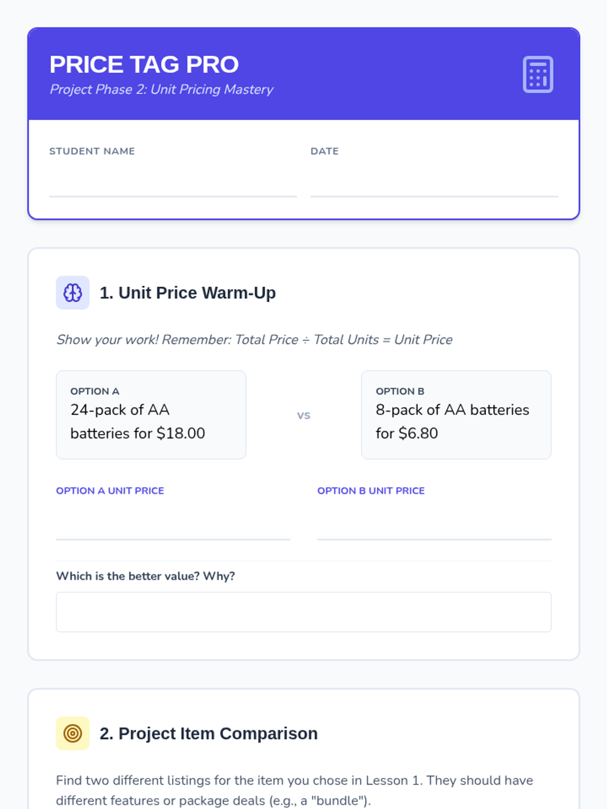 A 5-lesson project-based sequence for 7th graders focusing on comparison shopping, unit pricing, review analysis, and total cost calculation. Students learn to determine true value through a simulated 'big ticket' purchase project.