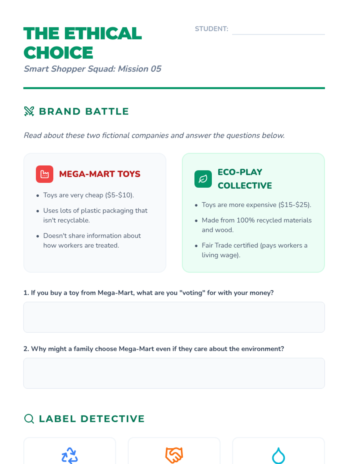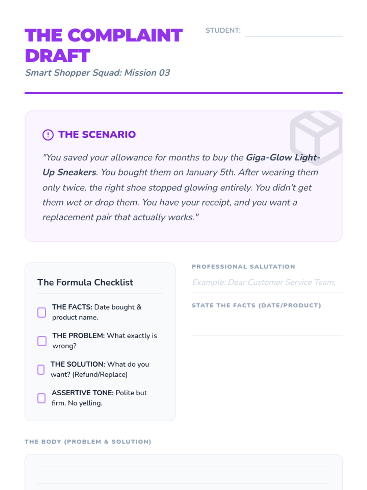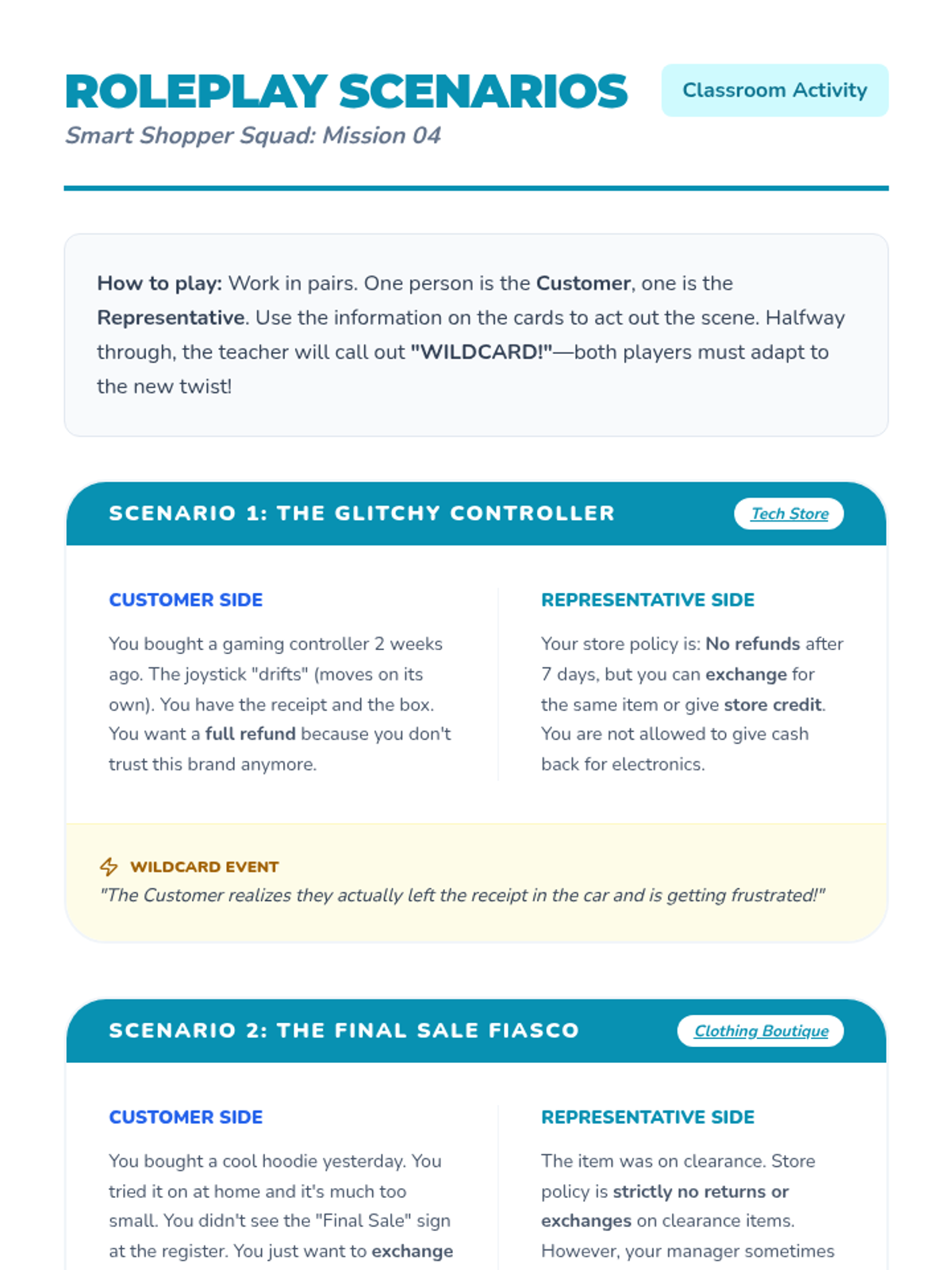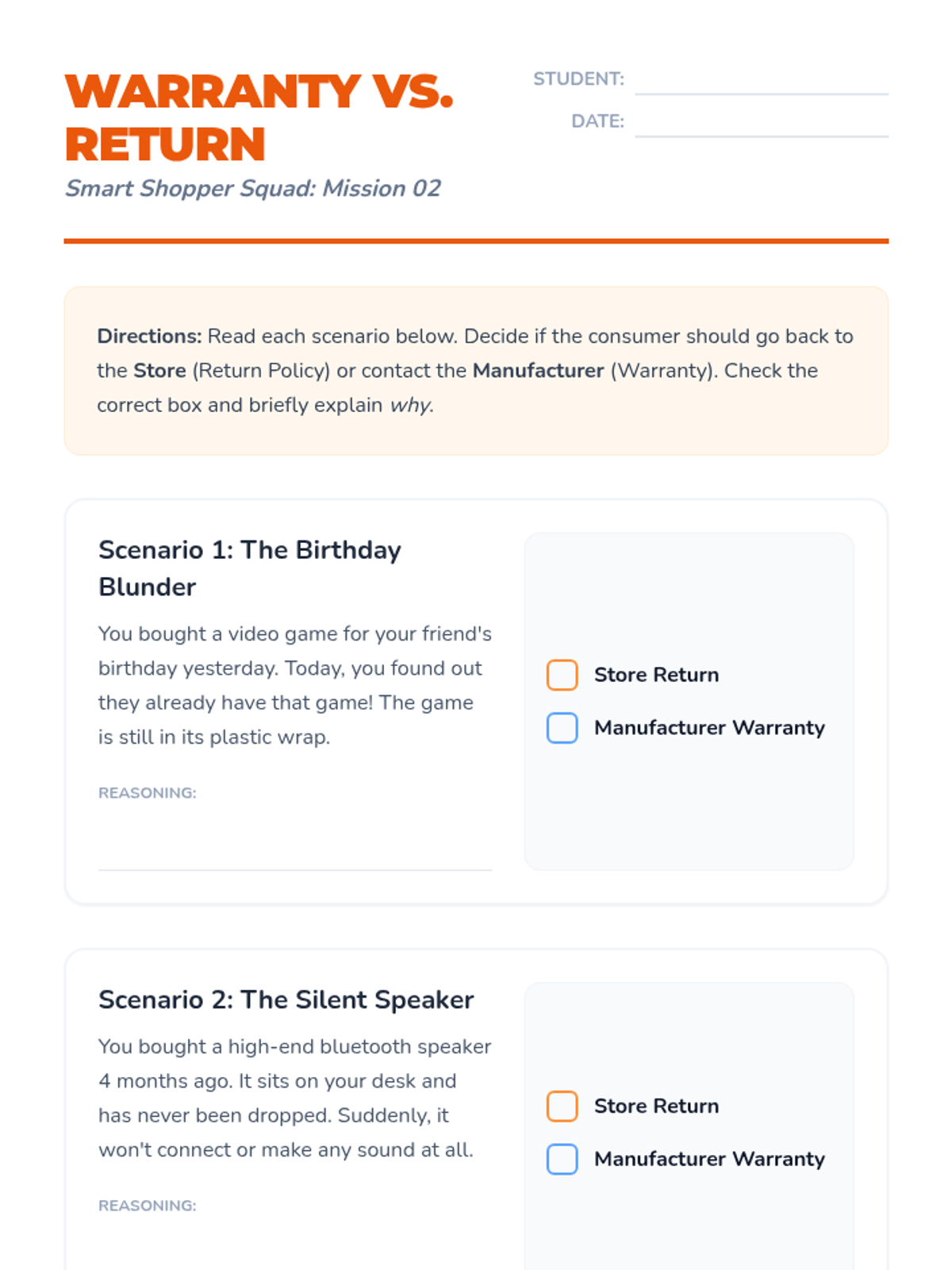 This sequence teaches 5th-grade students about their rights and responsibilities as consumers after a purchase. Students learn to navigate return policies, understand warranties, practice assertive communication, and explore the ethical impact of their spending choices.