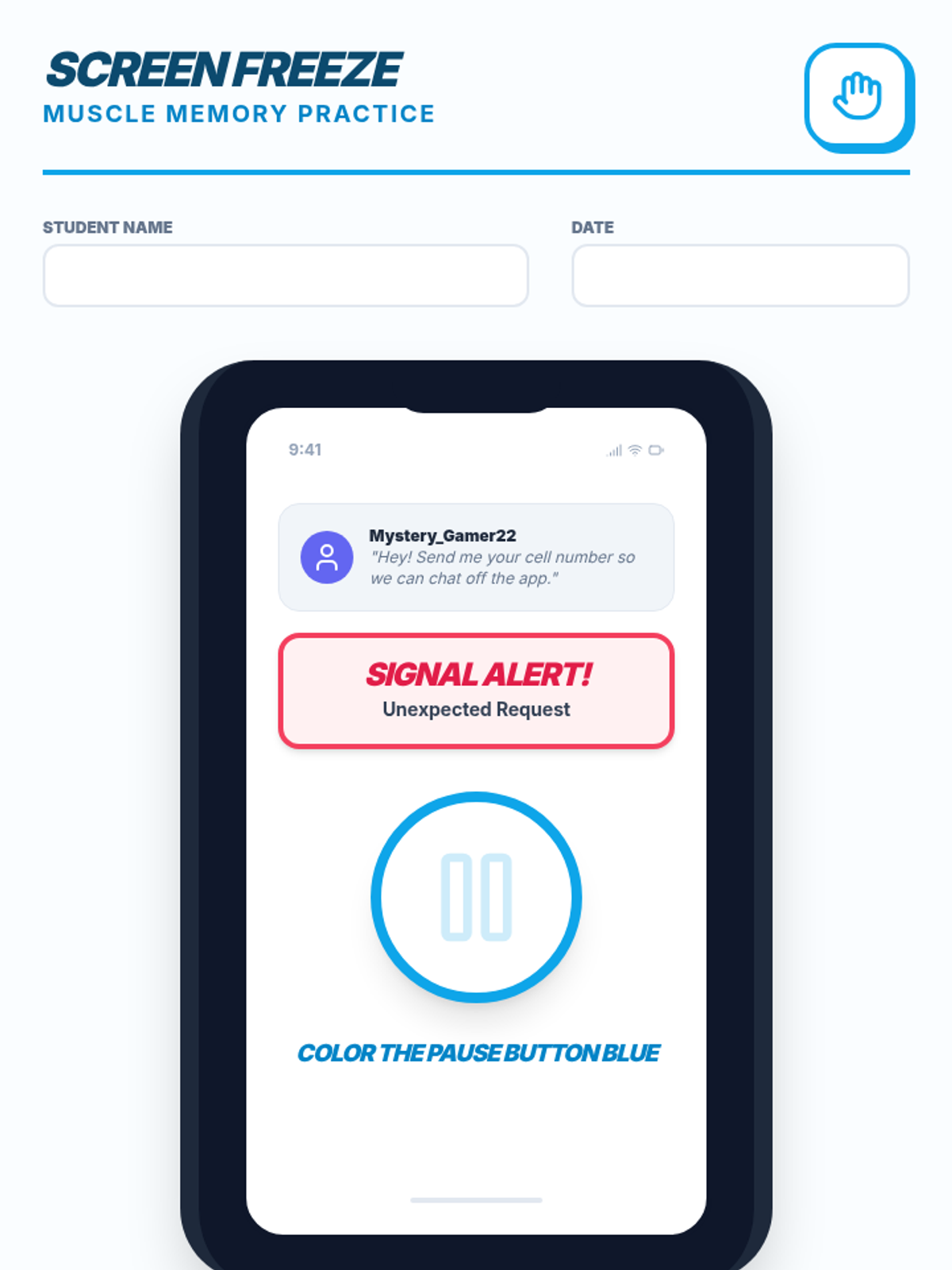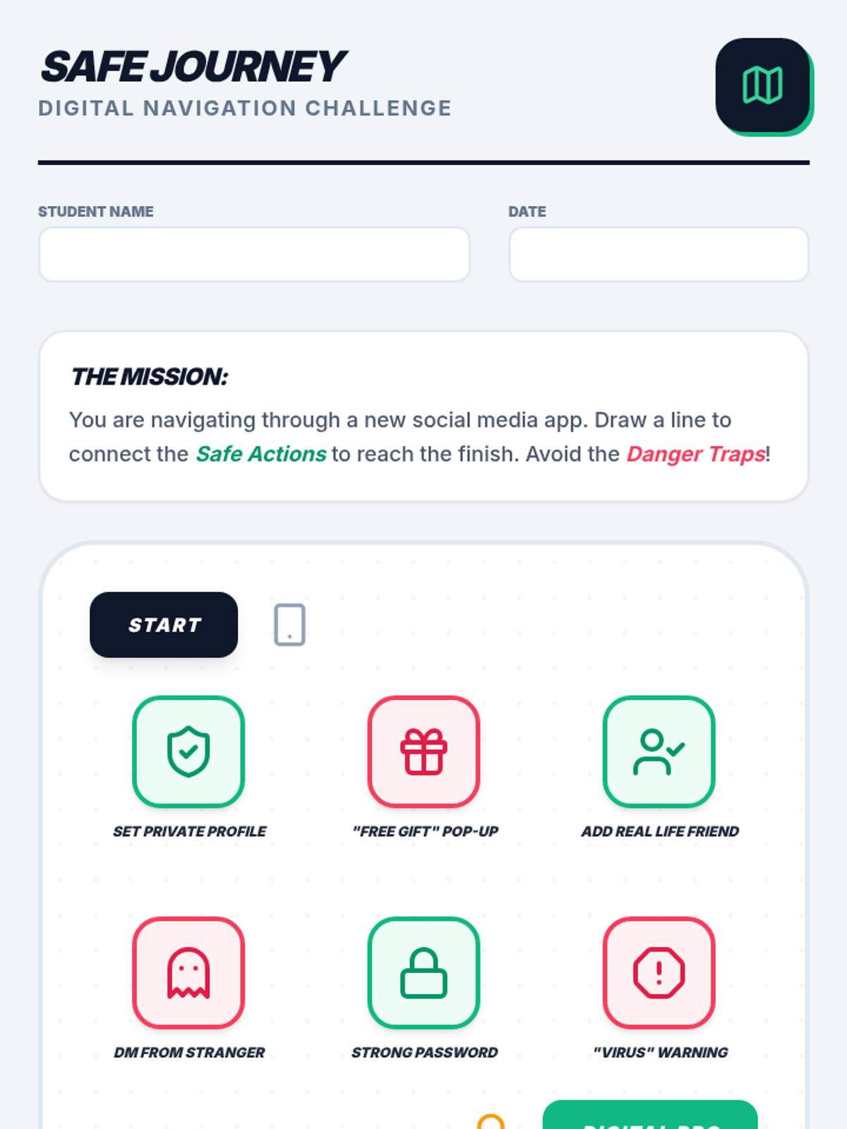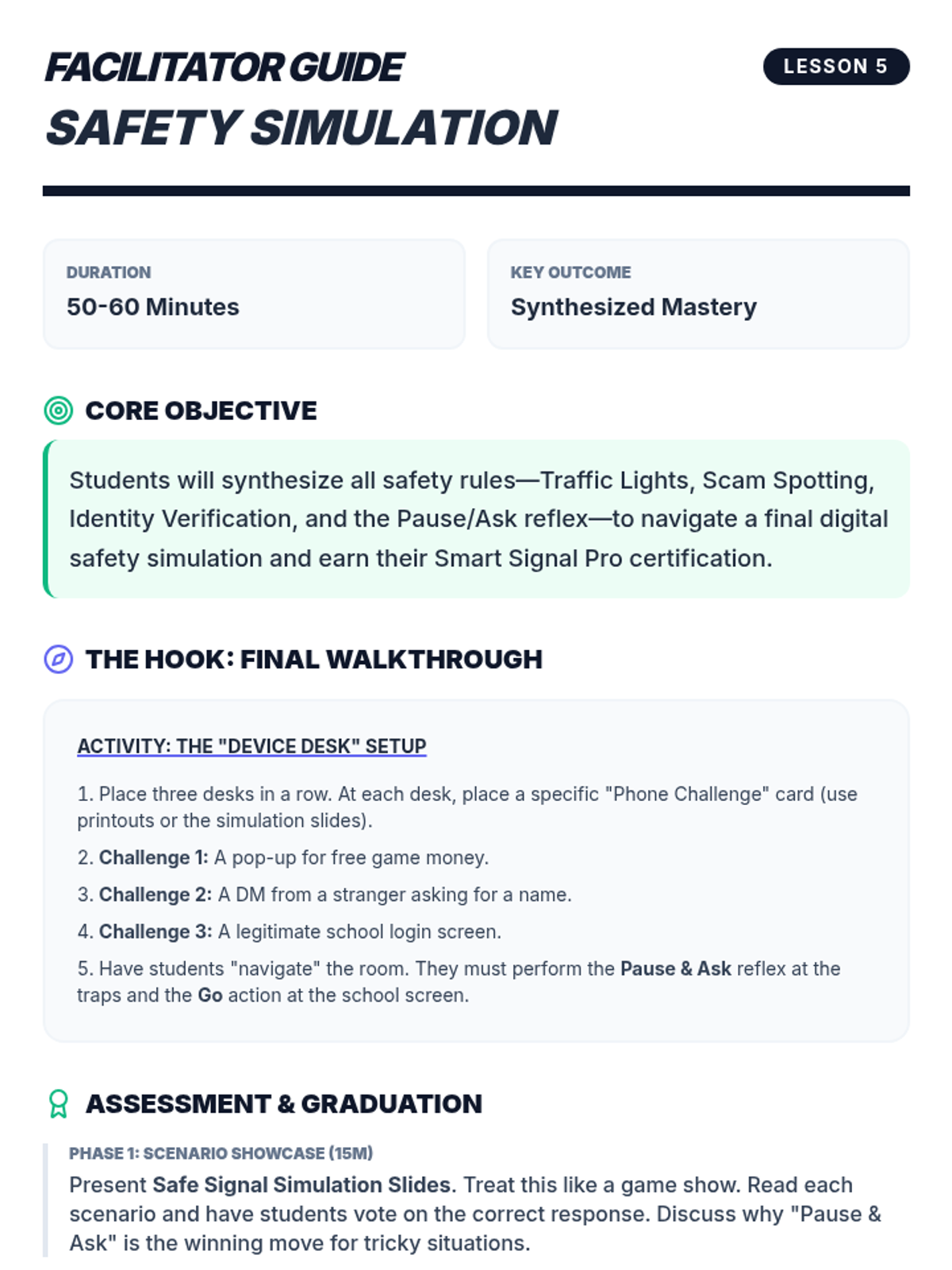 This life skills sequence for high schoolers with low cognitive abilities uses a traffic light model (Green, Yellow, Red) to teach digital safety. Students learn to navigate teen-relevant scenarios like social media requests, online shopping ads, and interacting with strangers in gaming or apps, focusing on the 'Pause and Ask' reflex.