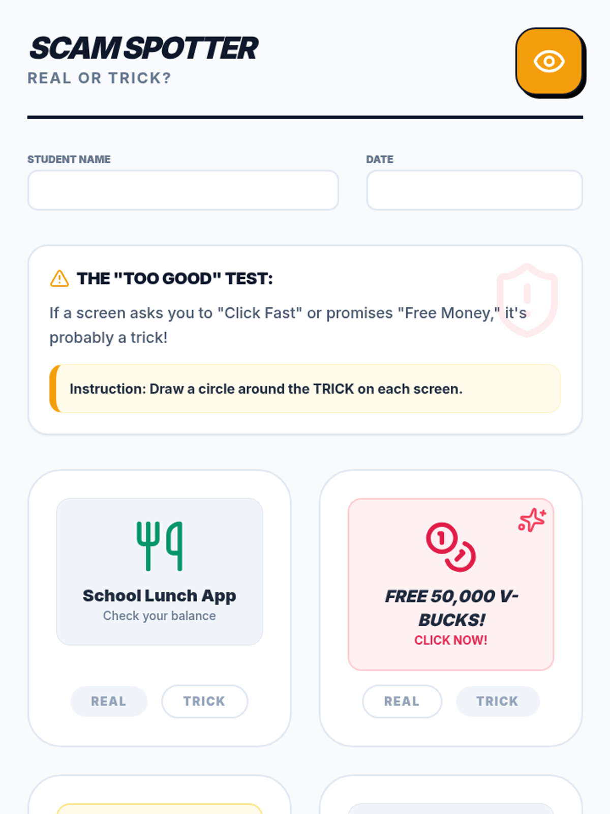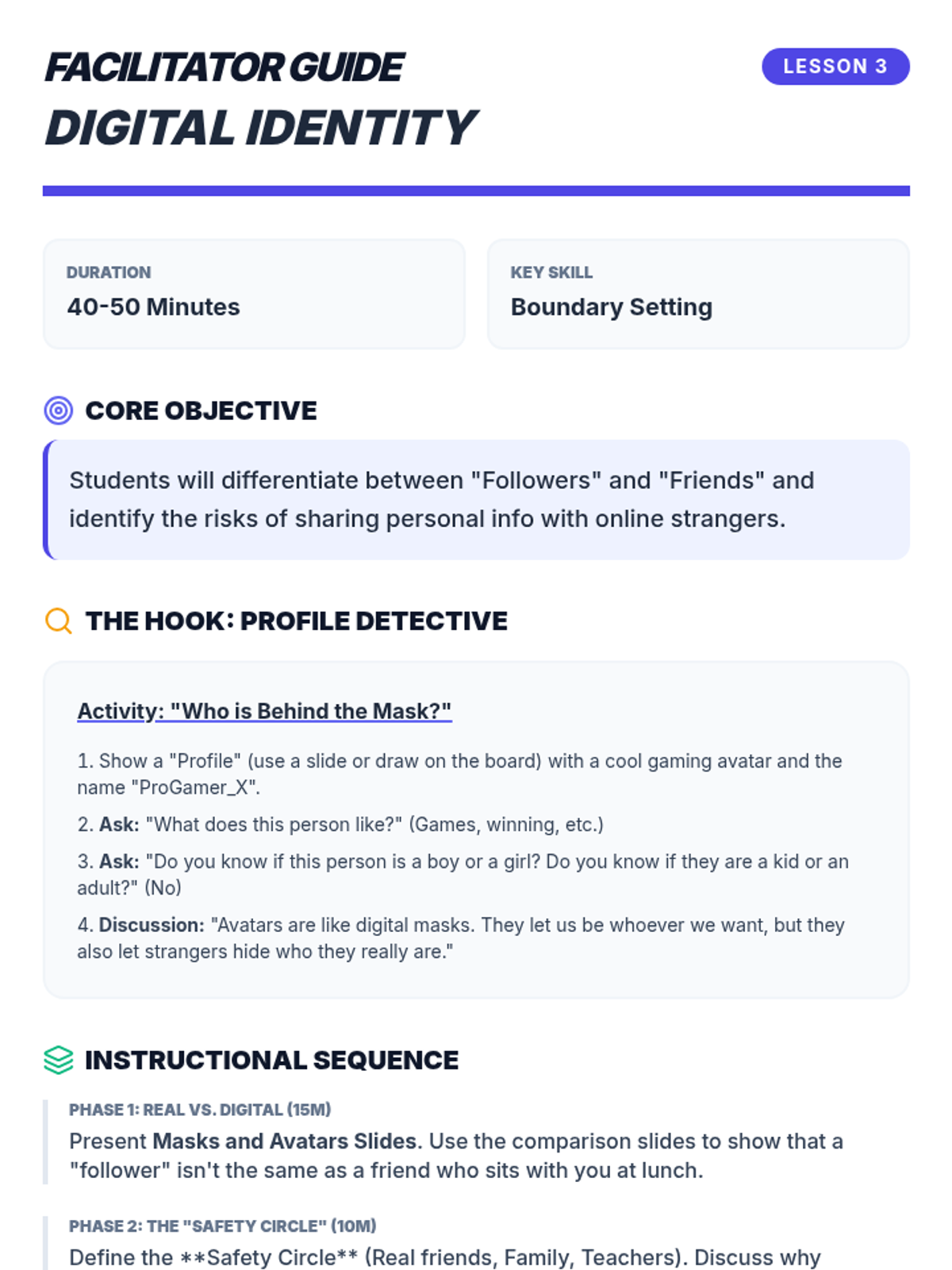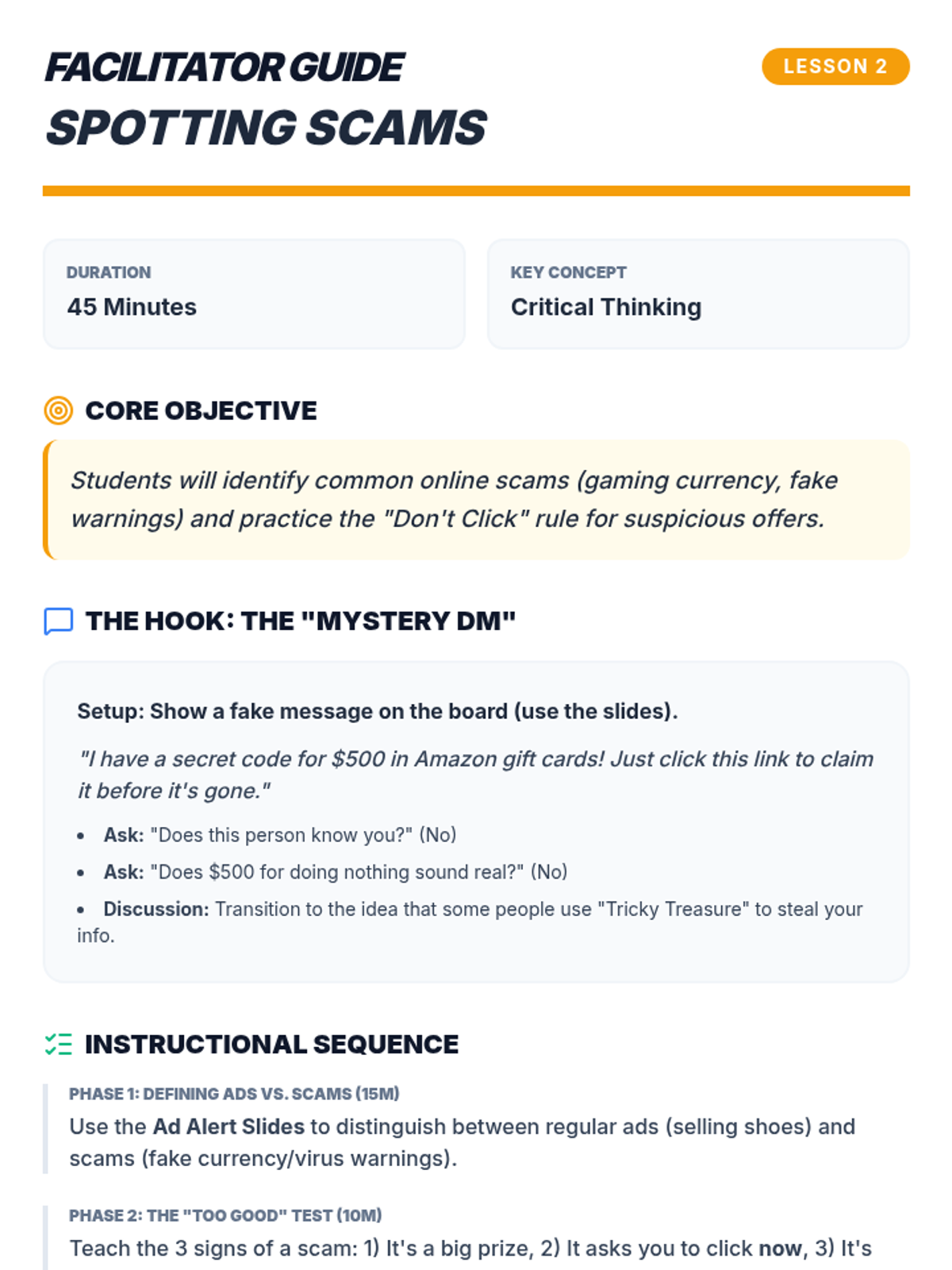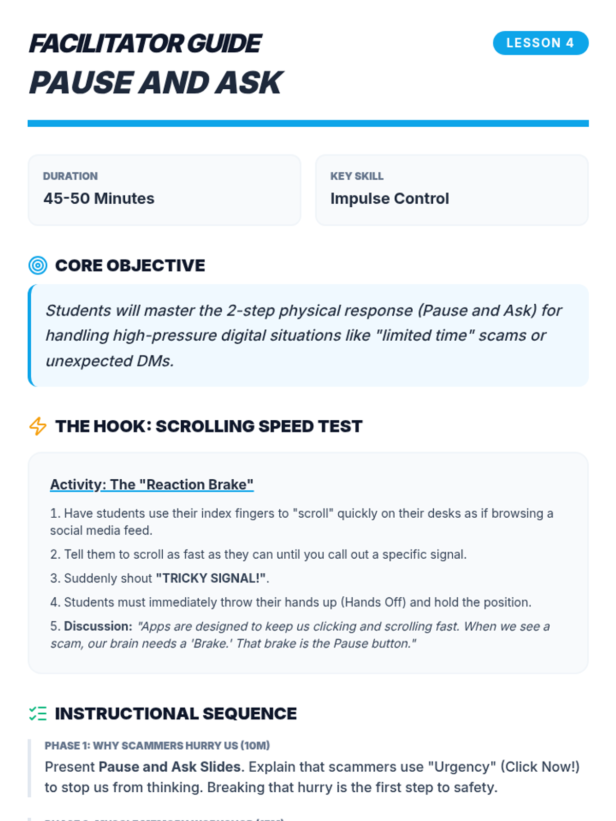 This life skills sequence for high schoolers with low cognitive abilities uses a traffic light model (Green, Yellow, Red) to teach digital safety. Students learn to navigate teen-relevant scenarios like social media requests, online shopping ads, and interacting with strangers in gaming or apps, focusing on the 'Pause and Ask' reflex.