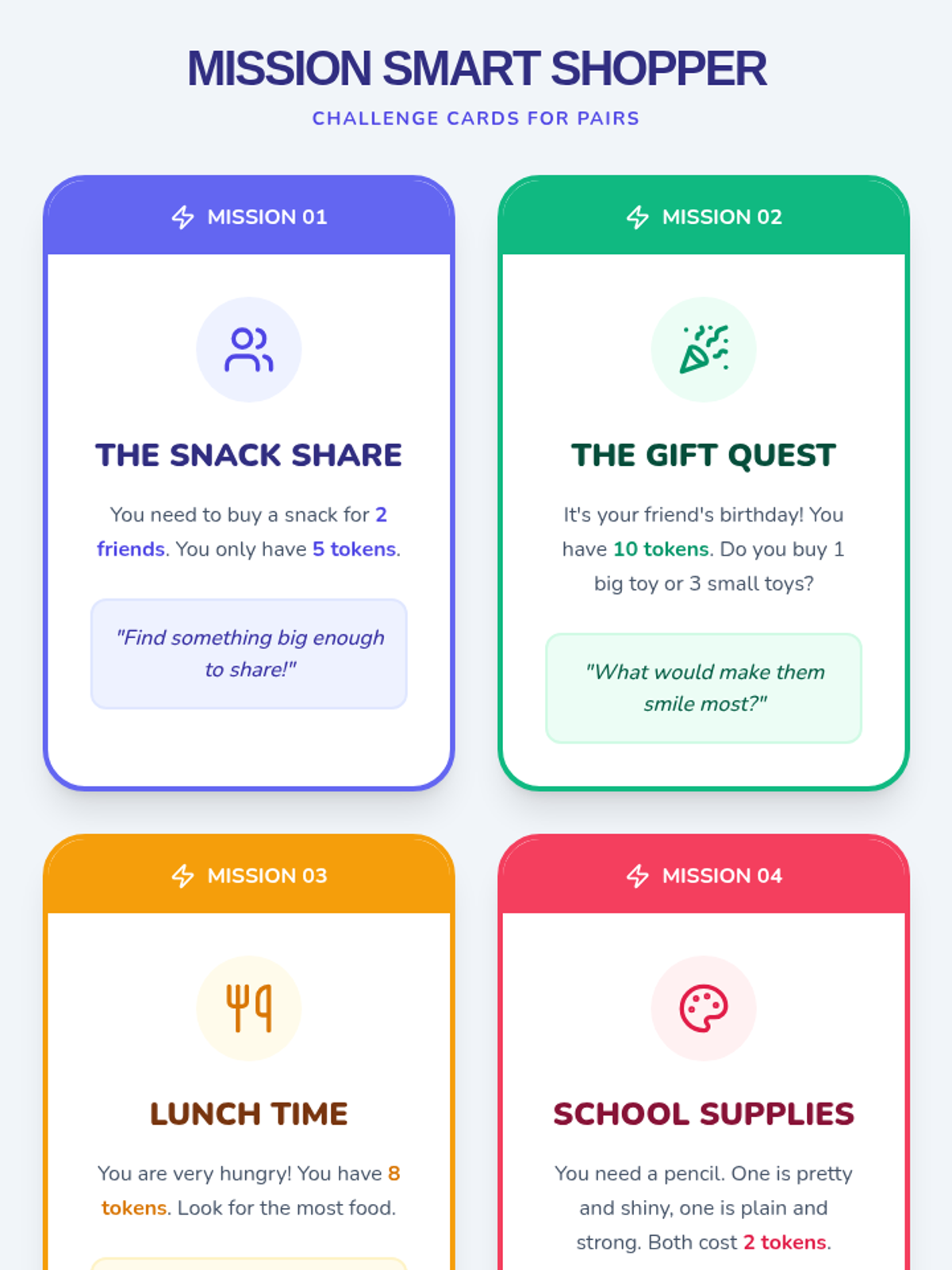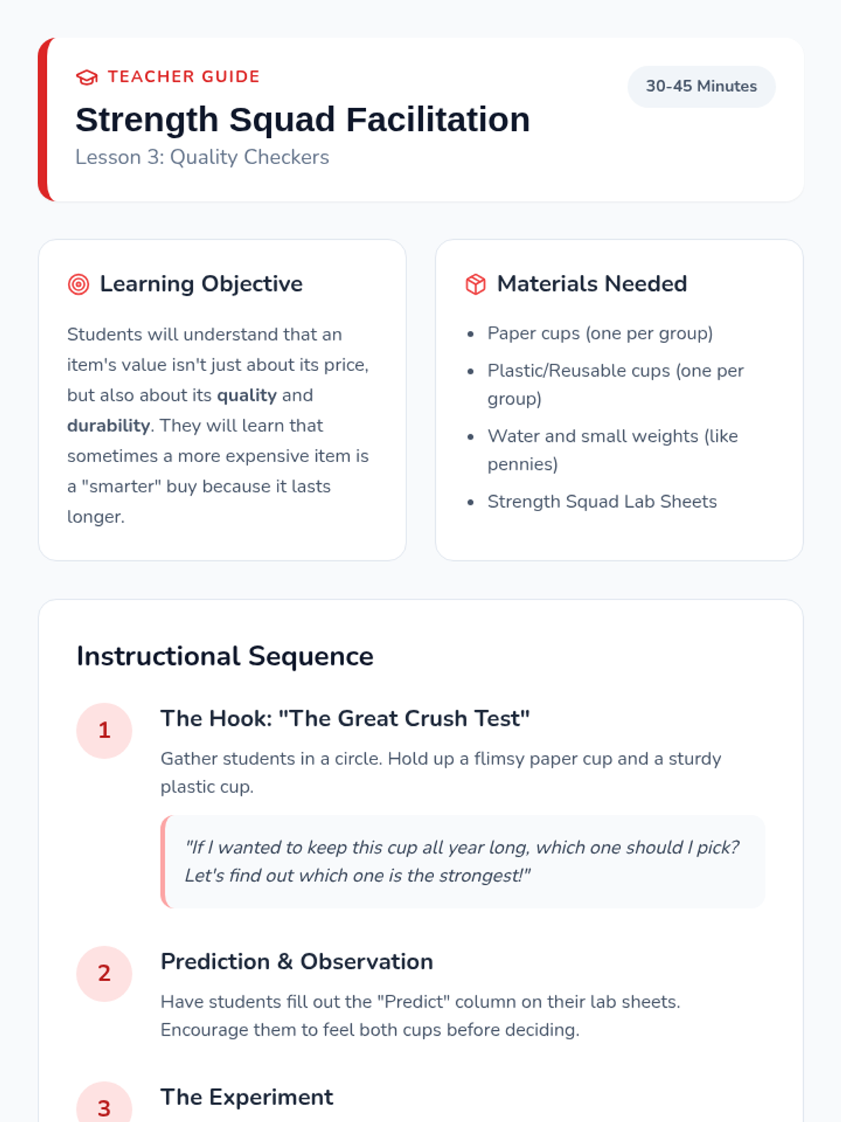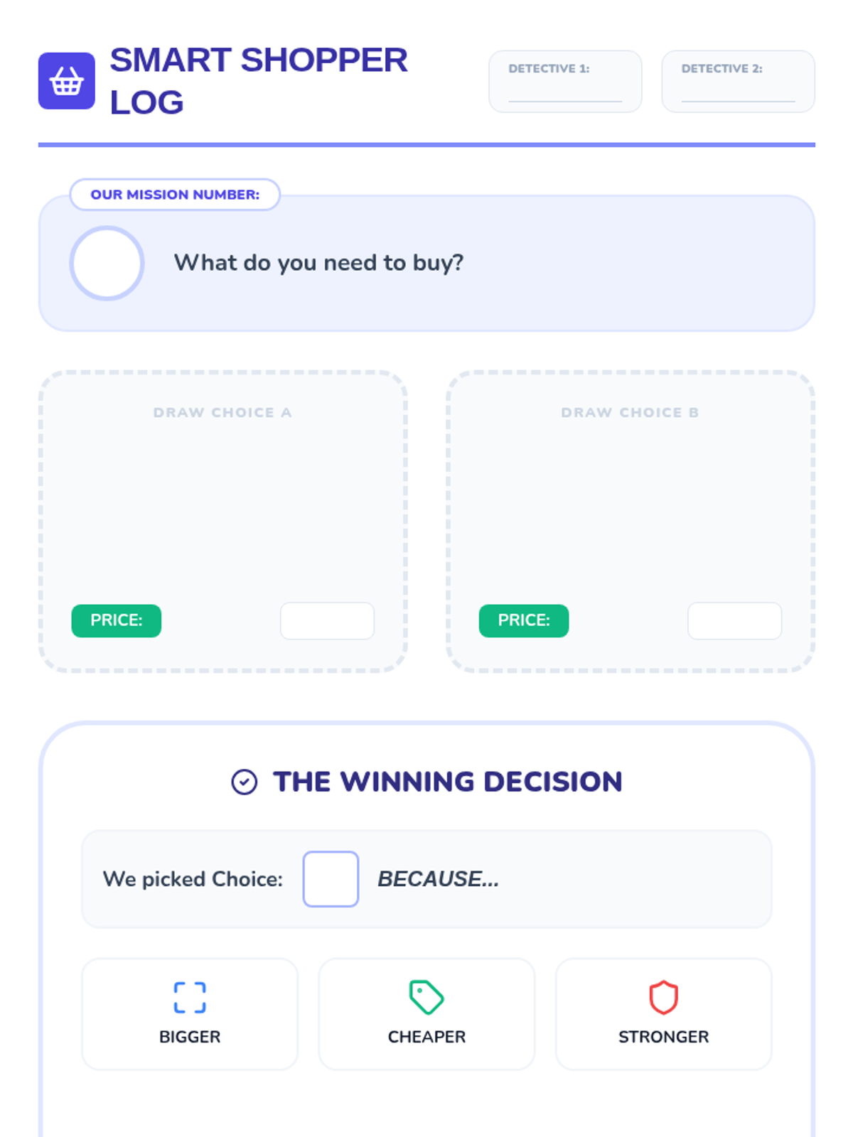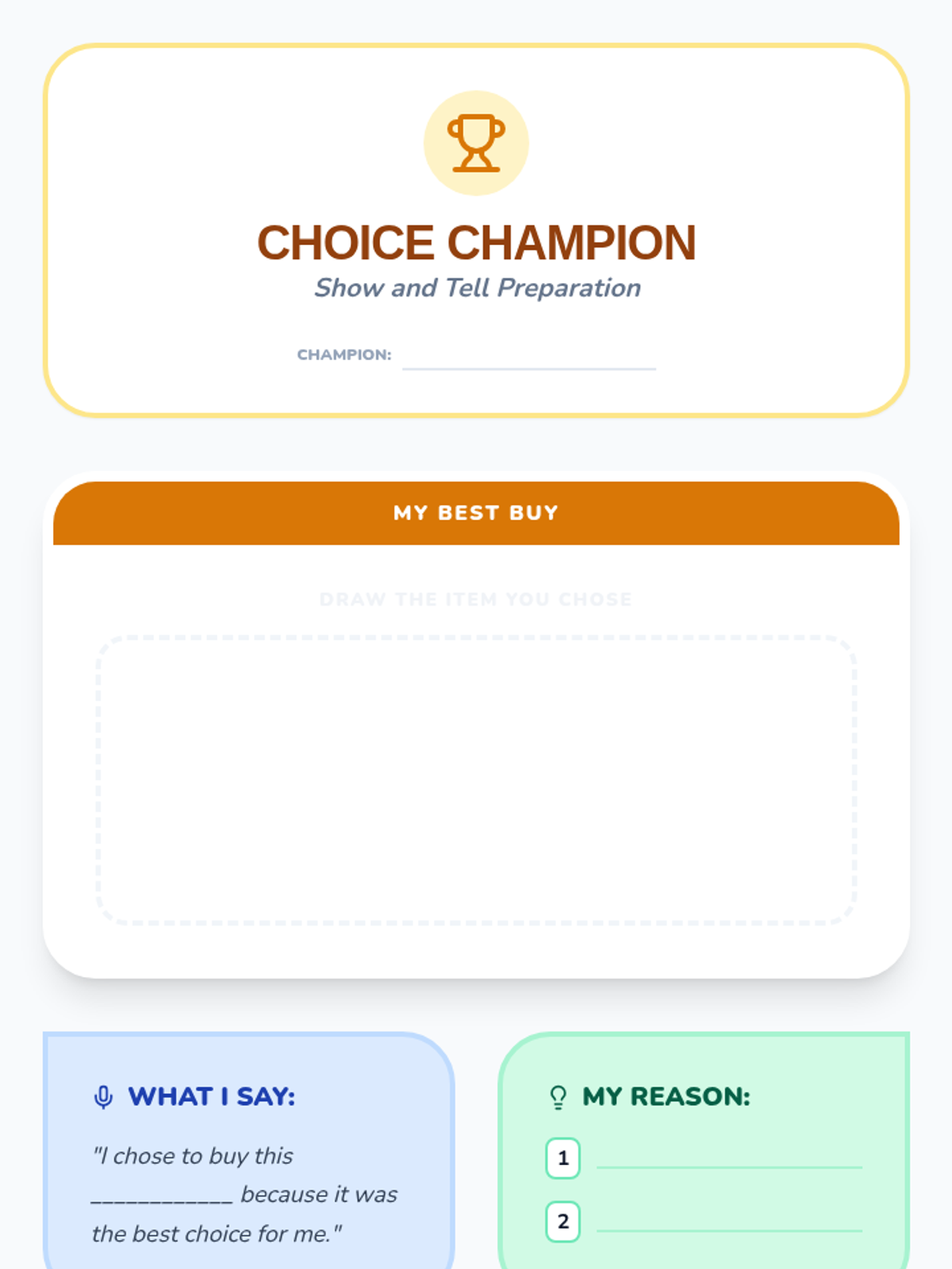 A Kindergarten sequence focused on teaching students how to compare attributes, prices, and quality to make smart financial decisions. Through hands-on 'lab' activities and simulations, students learn to justify their spending choices based on value rather than just impulse.