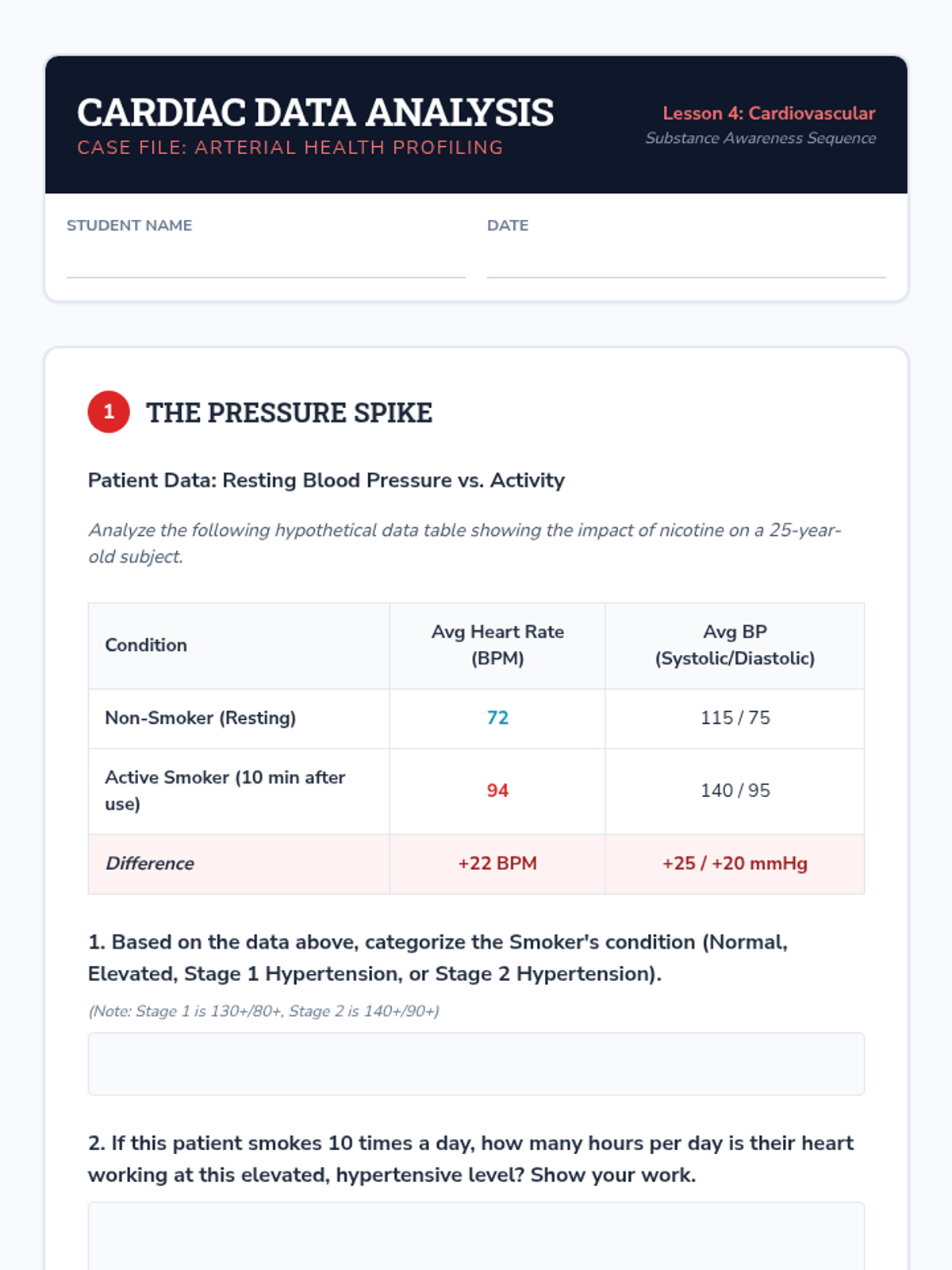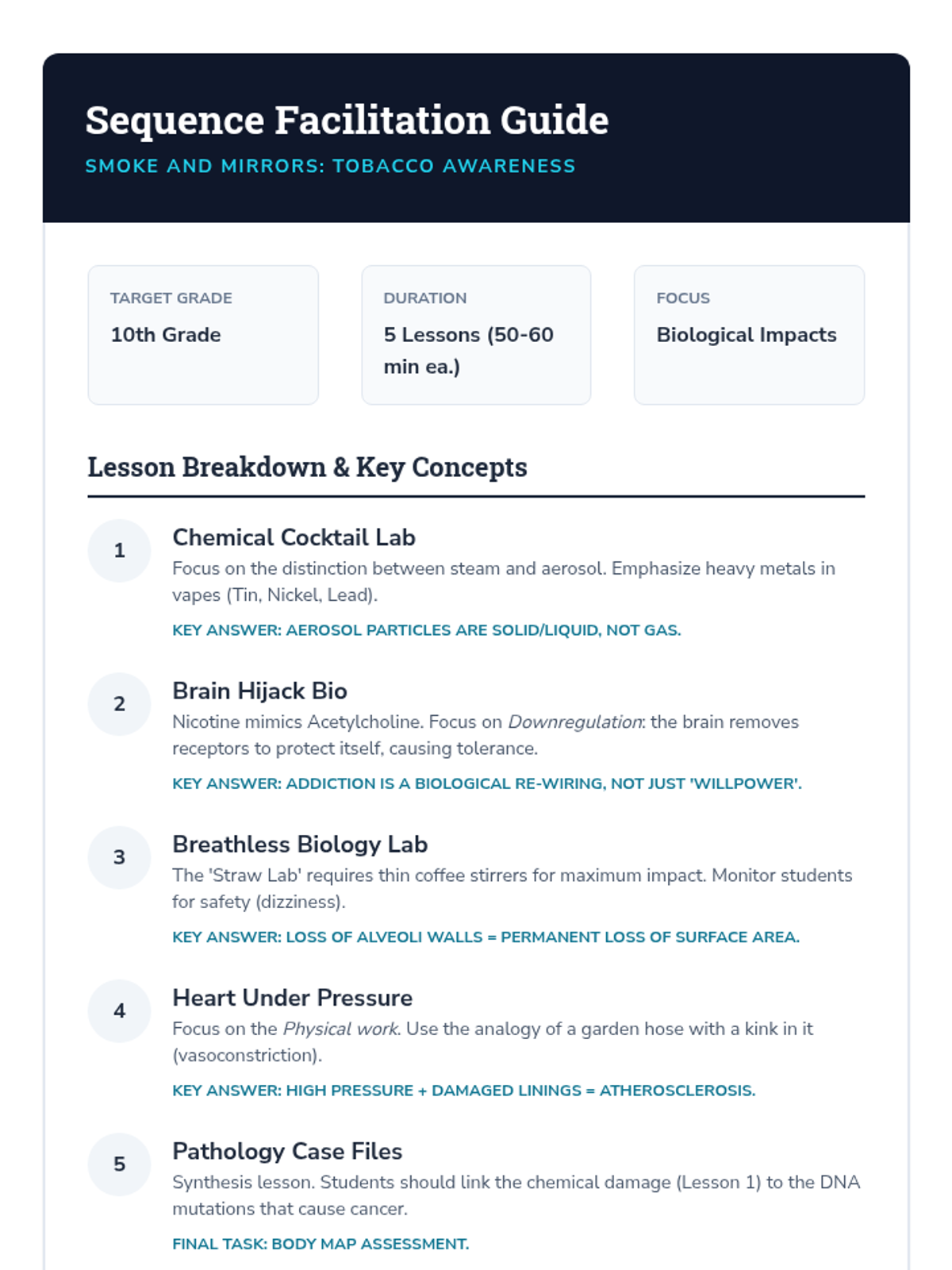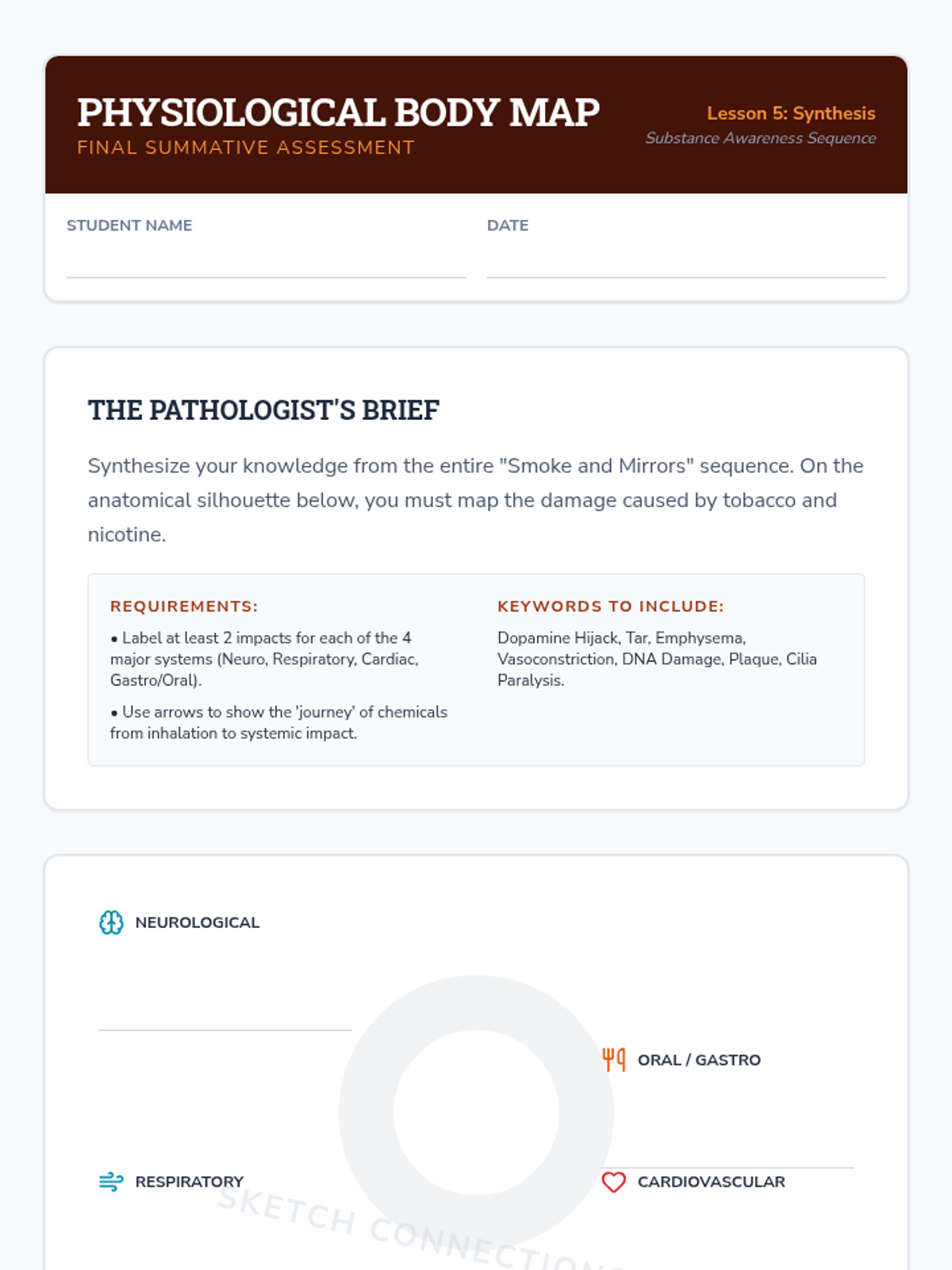 This sequence takes students on a biological journey through the human body to understand the physiological impacts of tobacco and nicotine. Students will investigate chemical compositions, neurological pathways, respiratory mechanics, and cardiovascular consequences to evaluate long-term health trajectories.