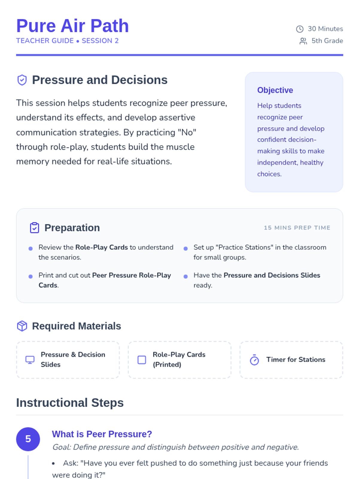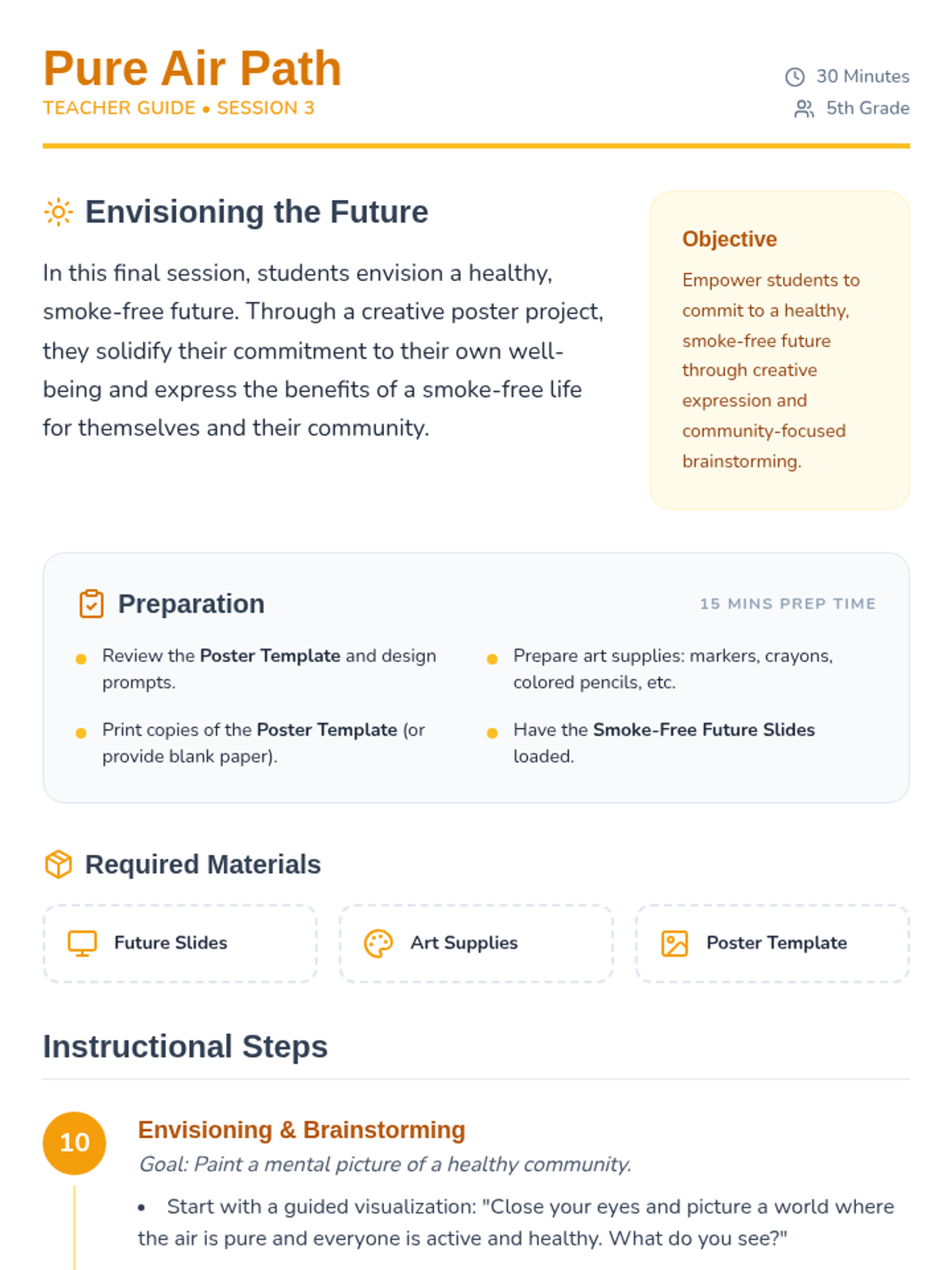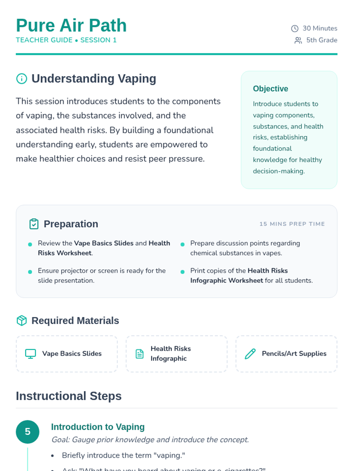 A comprehensive 3-session program for 5th graders focused on vape cessation education, resisting peer pressure, and committing to a healthy, smoke-free future.