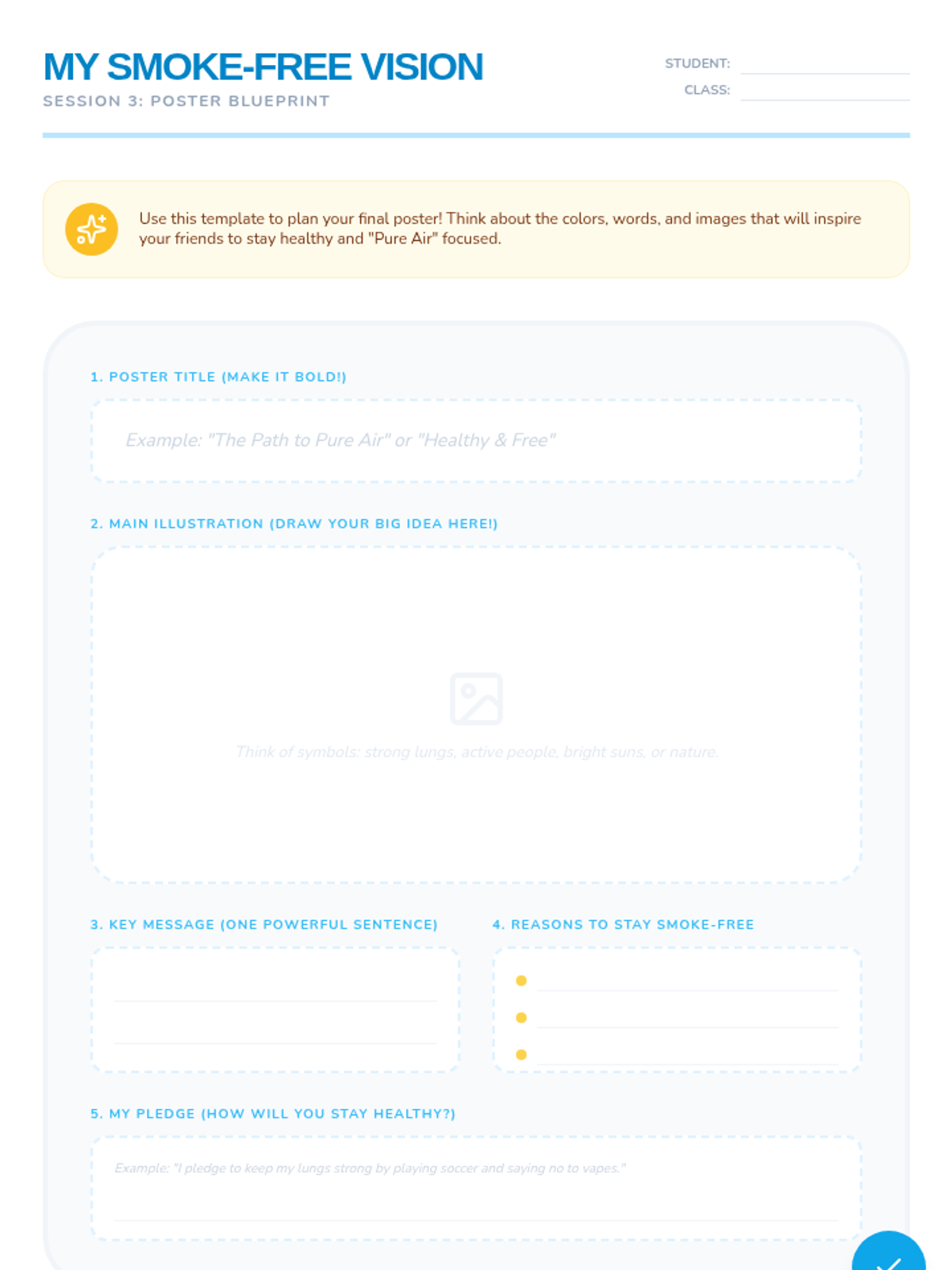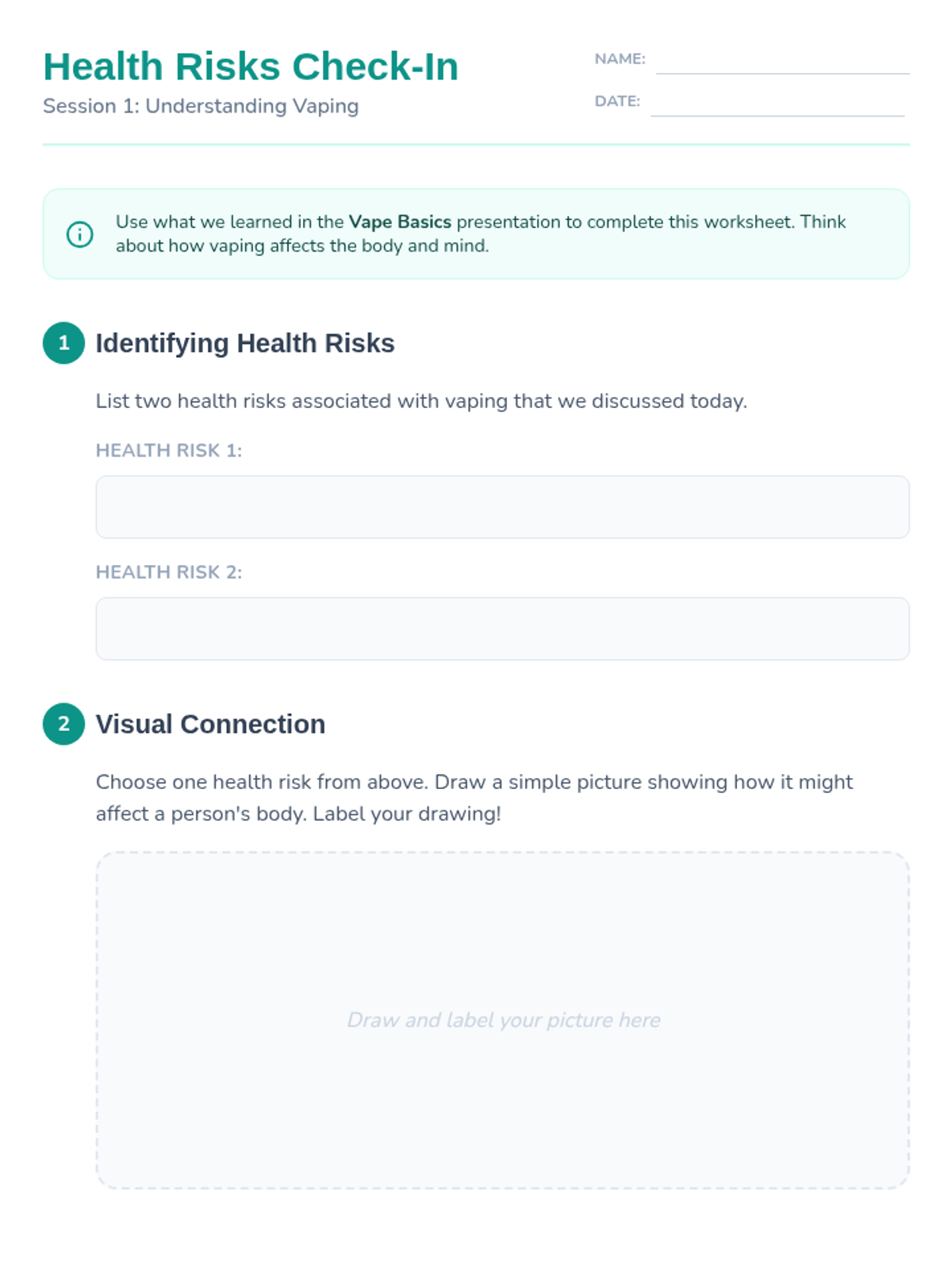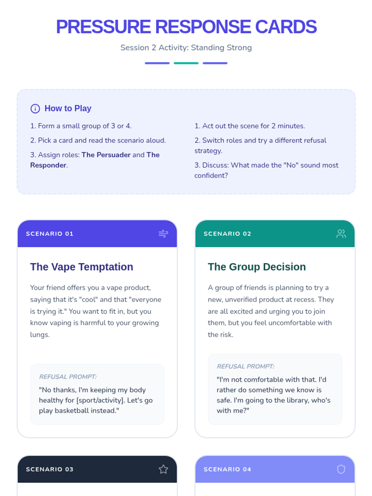 A comprehensive 3-session program for 5th graders focused on vape cessation education, resisting peer pressure, and committing to a healthy, smoke-free future.
