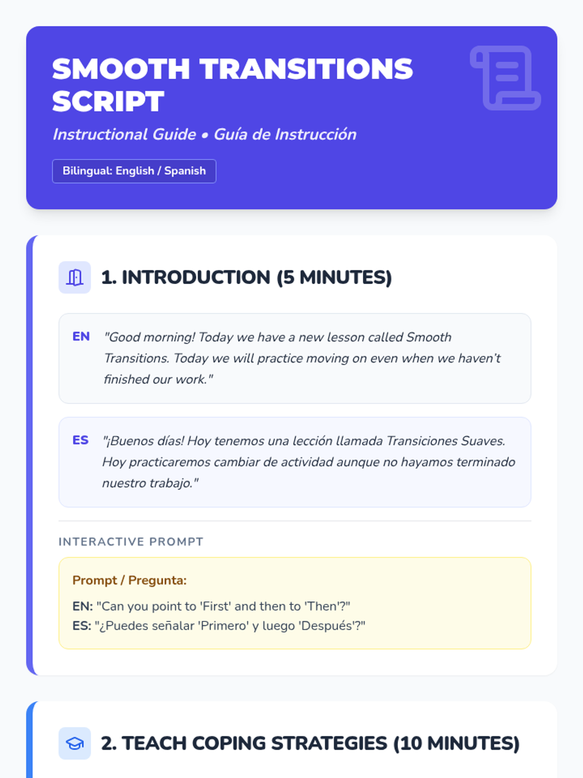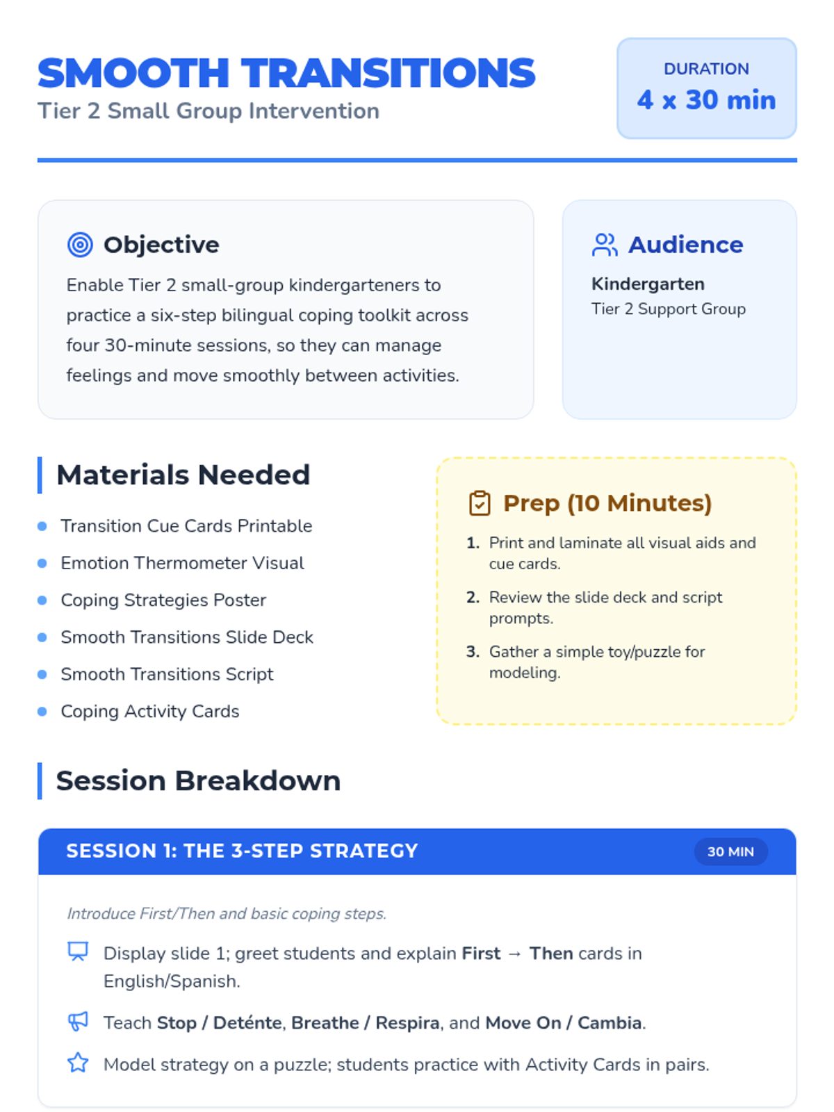 A specialized intervention series designed to help young learners navigate classroom transitions with emotional regulation and bilingual support.