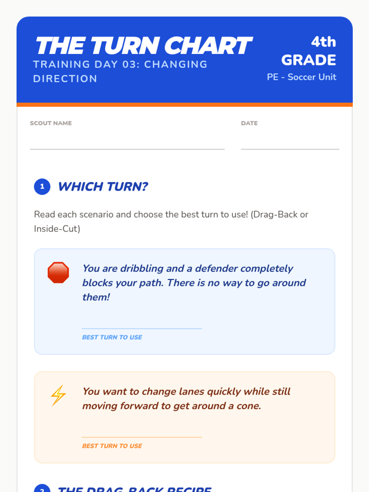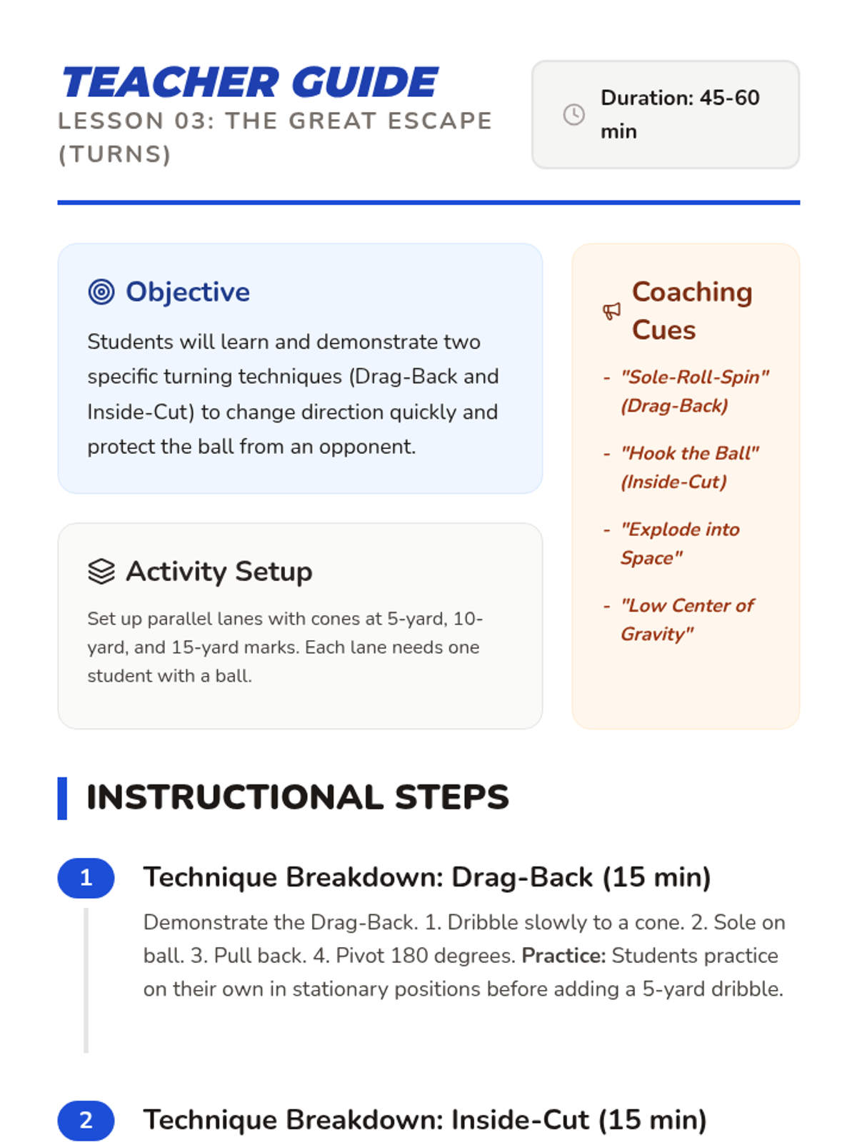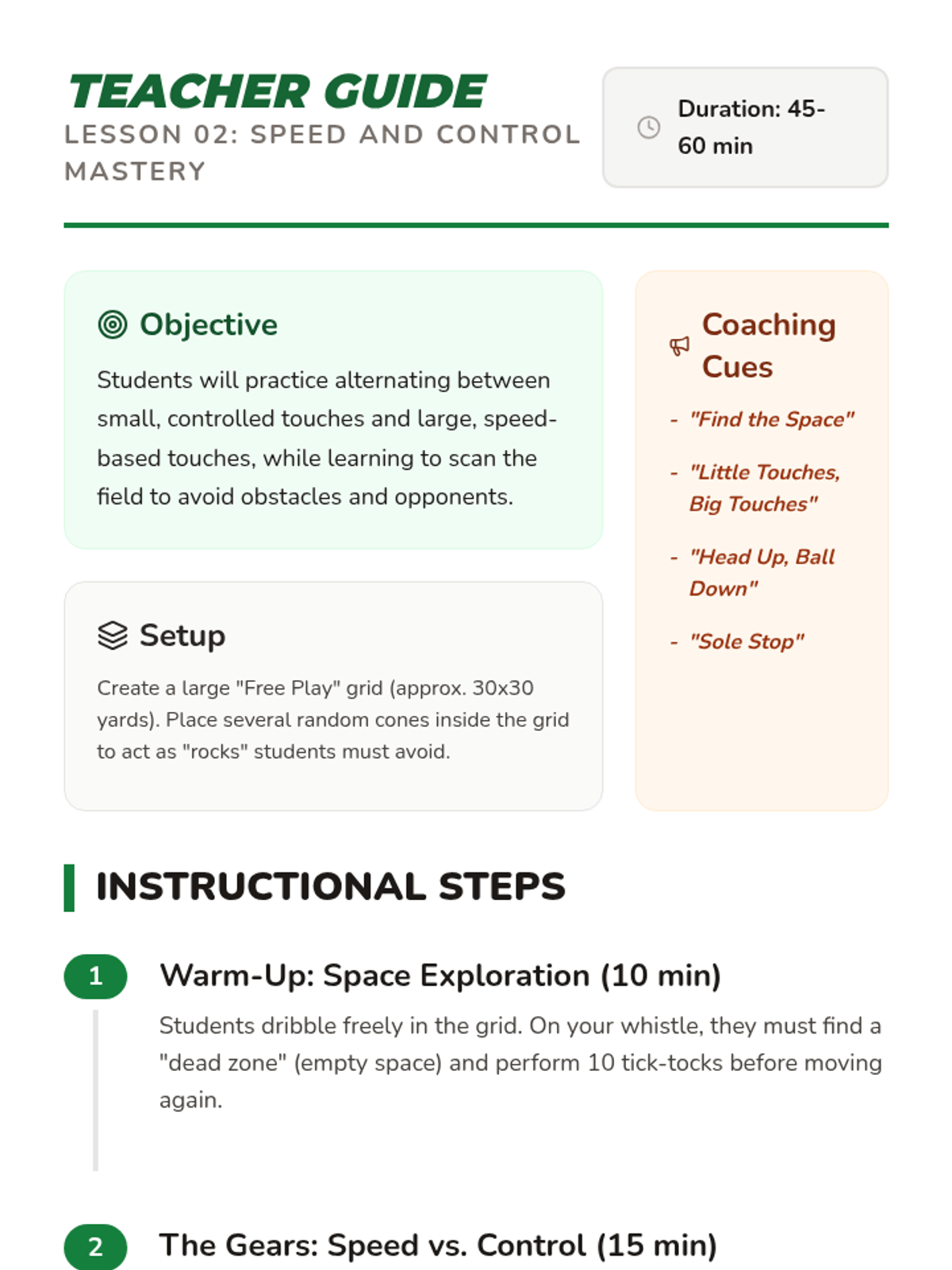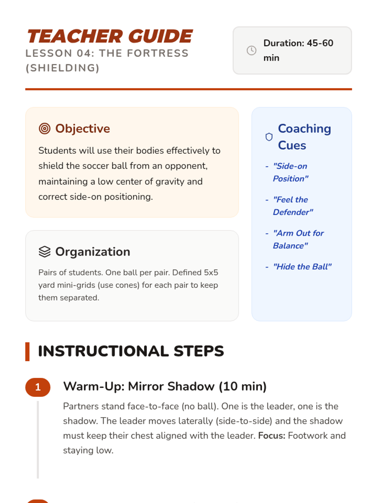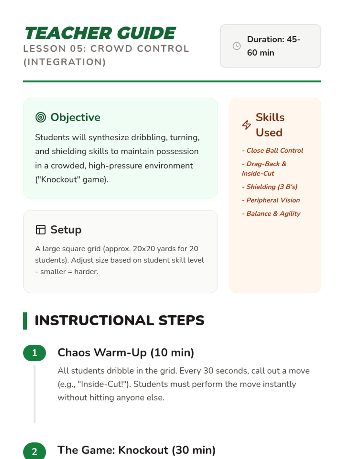 A 5-lesson sequence for 4th-grade physical education focusing on soccer dribbling and ball control. Students progress from basic footwork to advanced shielding and navigating tight spaces.