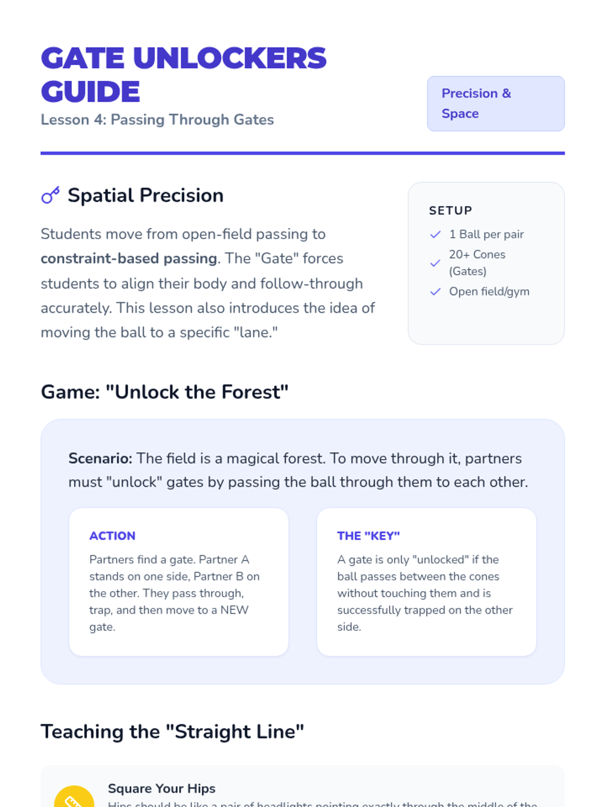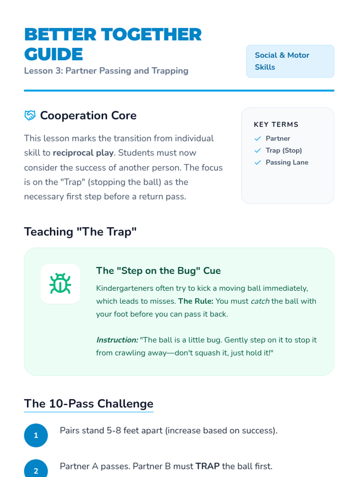 A Kindergarten physical education sequence focused on teaching the foundational motor skills of soccer passing, trapping, and partner cooperation through engaging, game-based activities.
