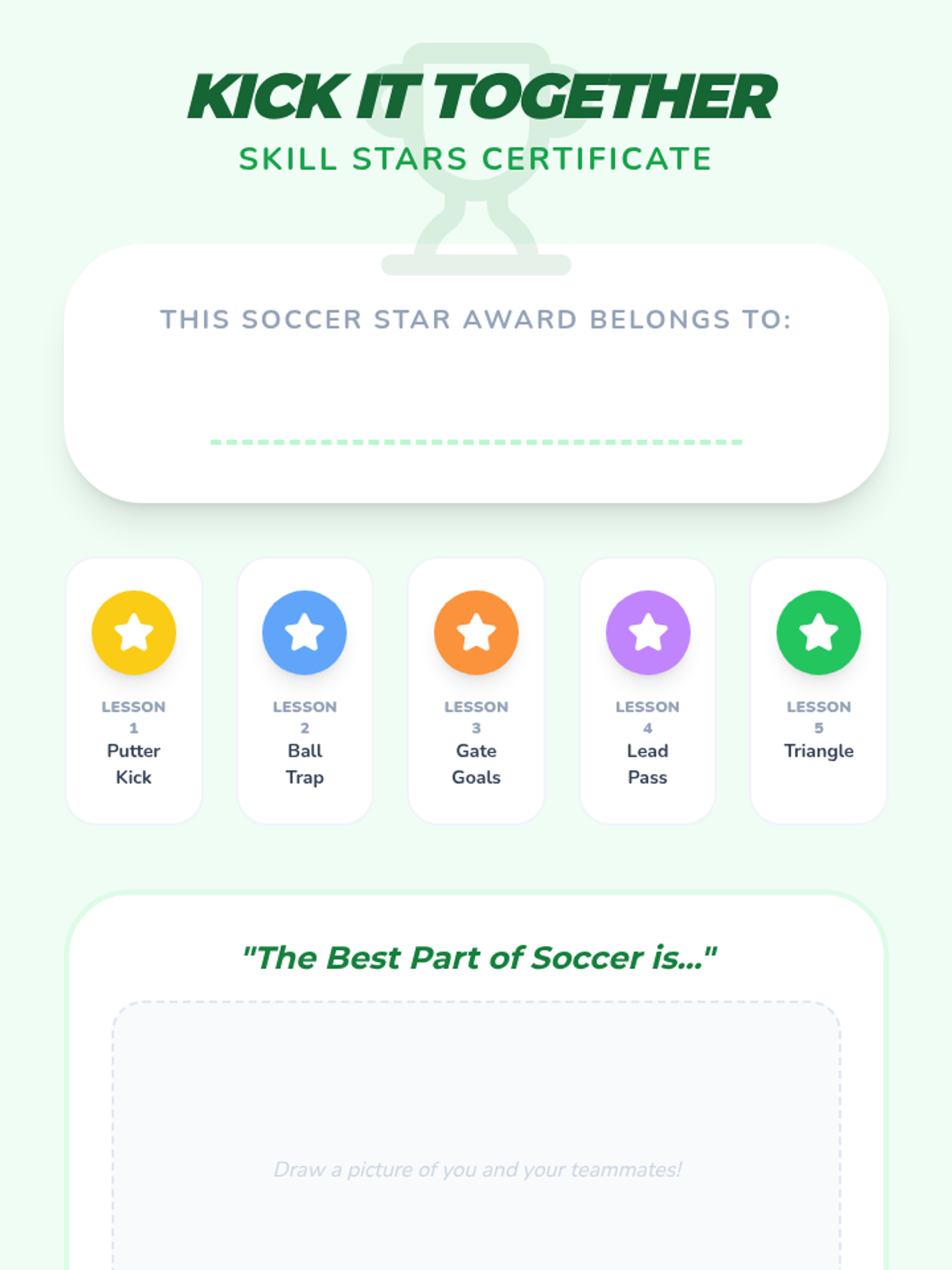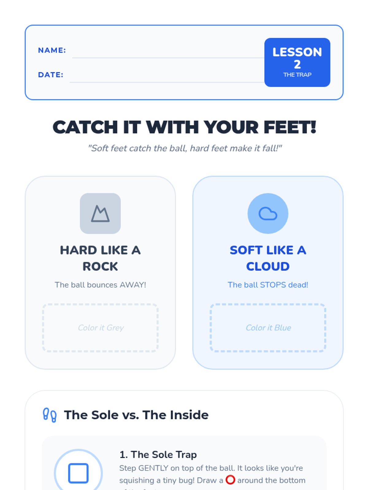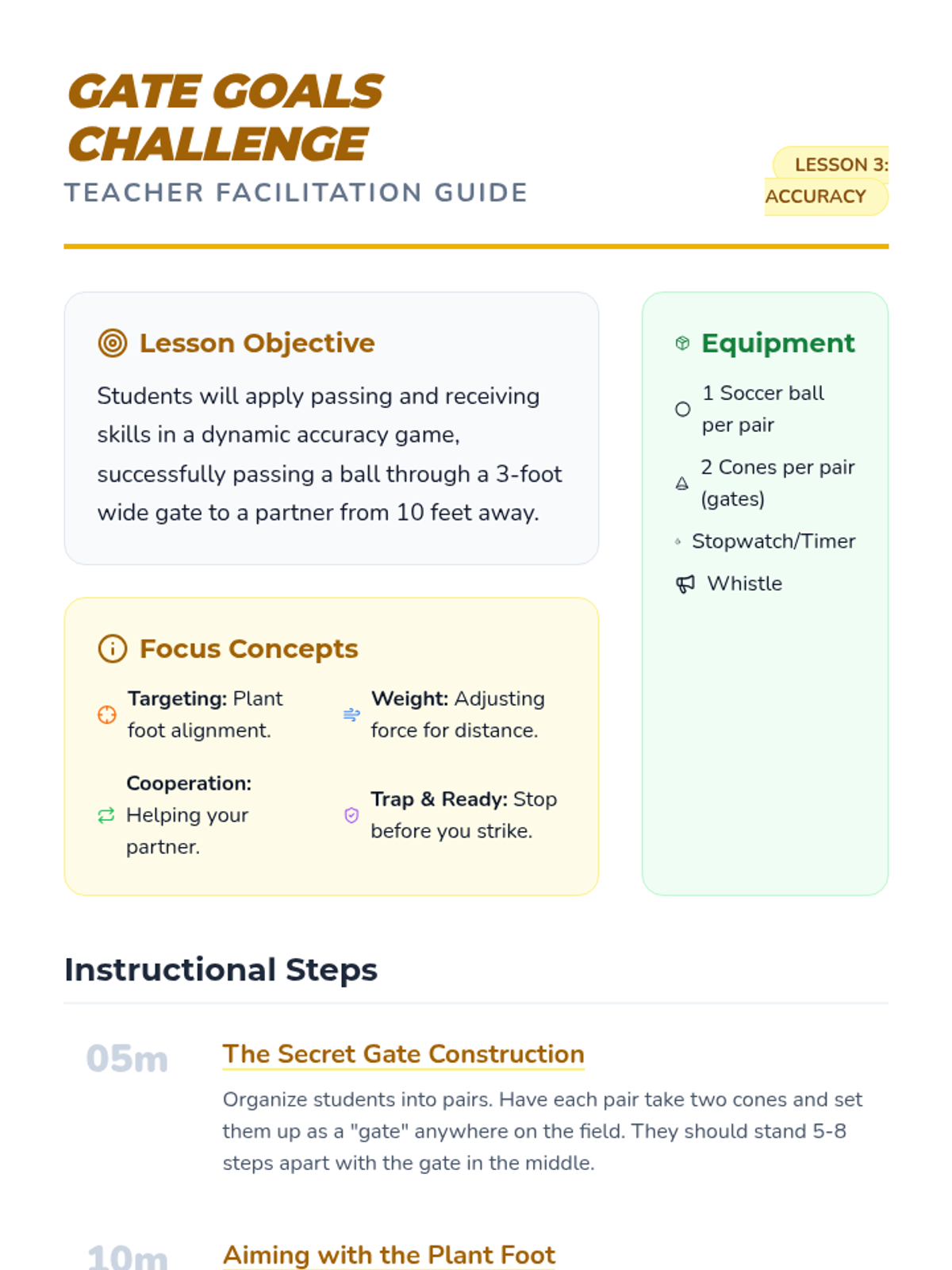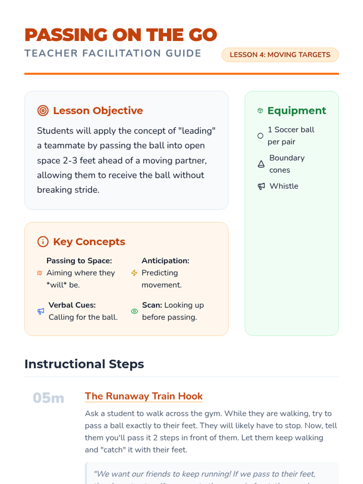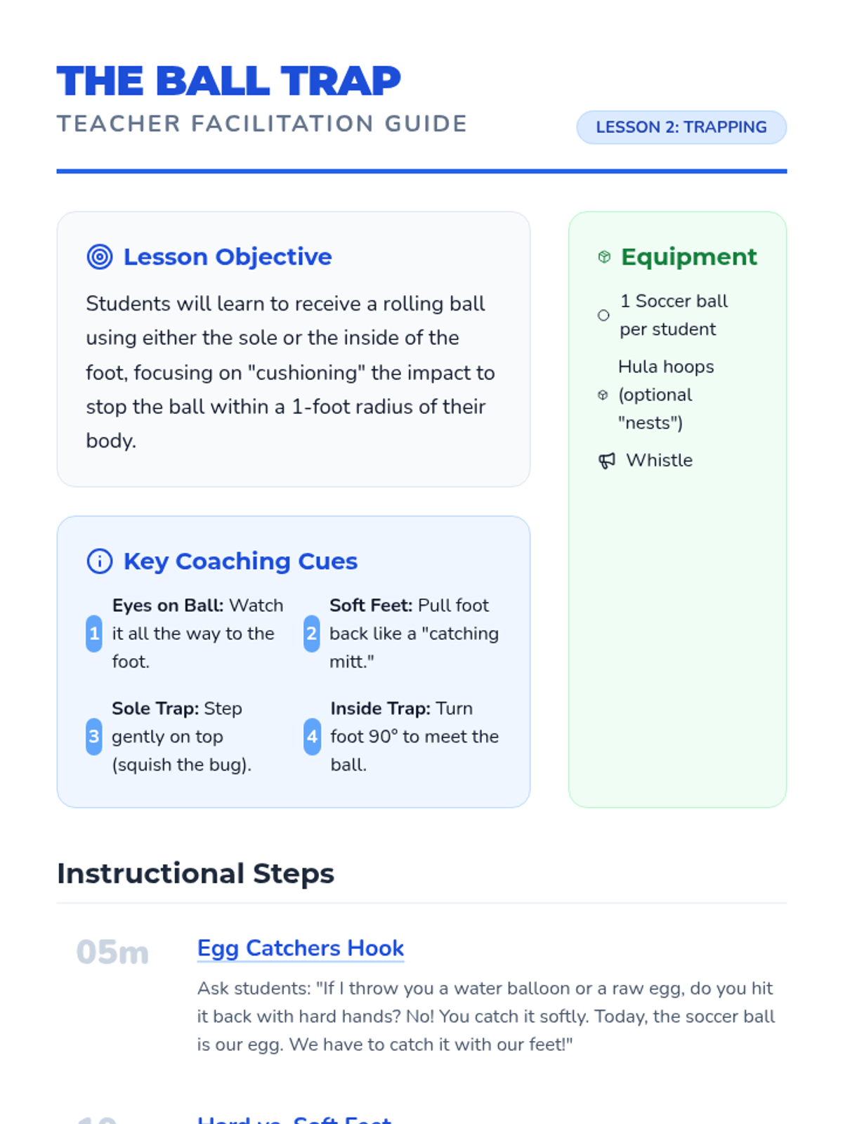 A 1st-grade physical education sequence focused on cooperative soccer skills, specifically the mechanics of passing with the inside of the foot and receiving (trapping) the ball. Students progress from static drills to moving targets and group play.