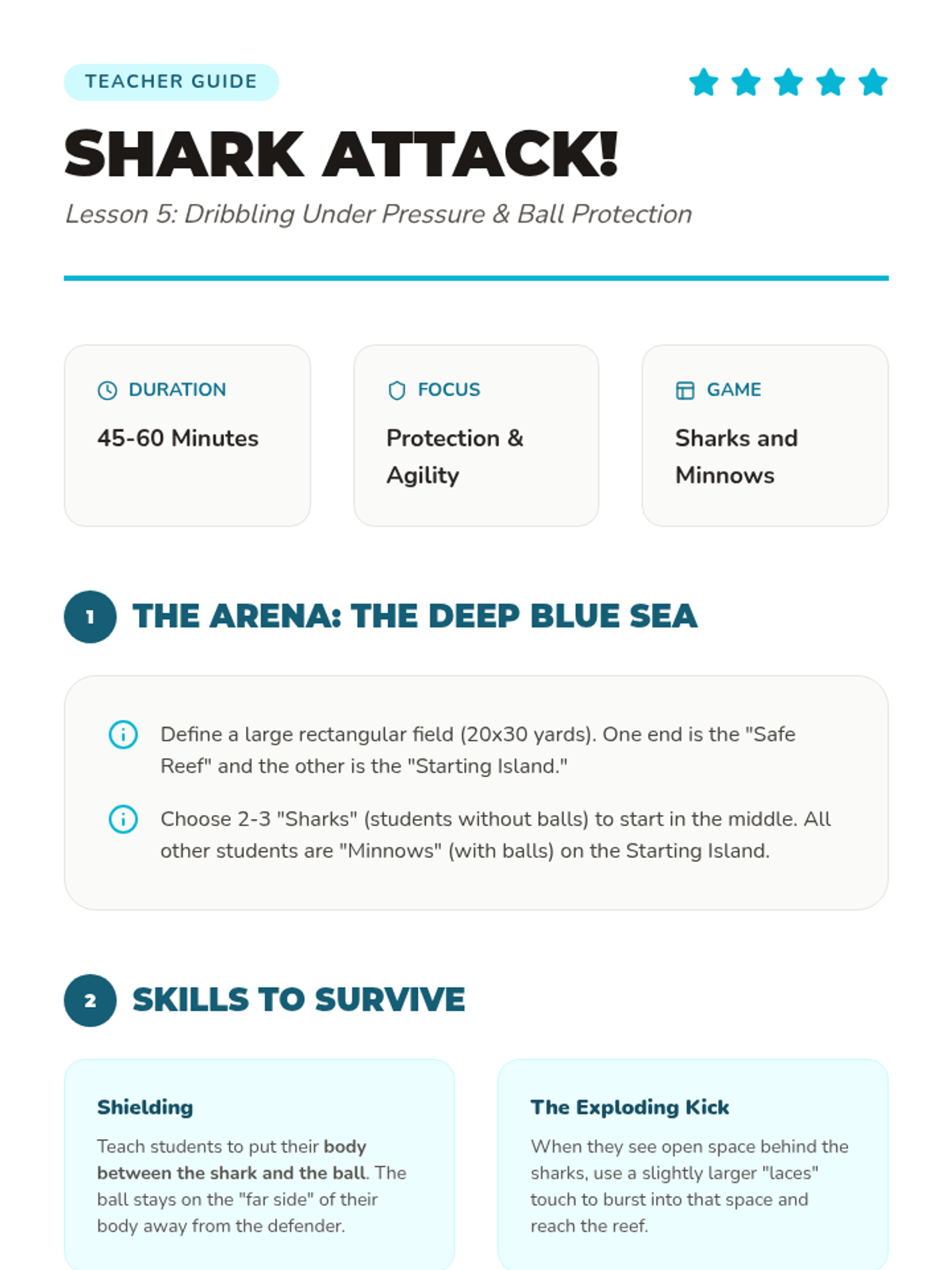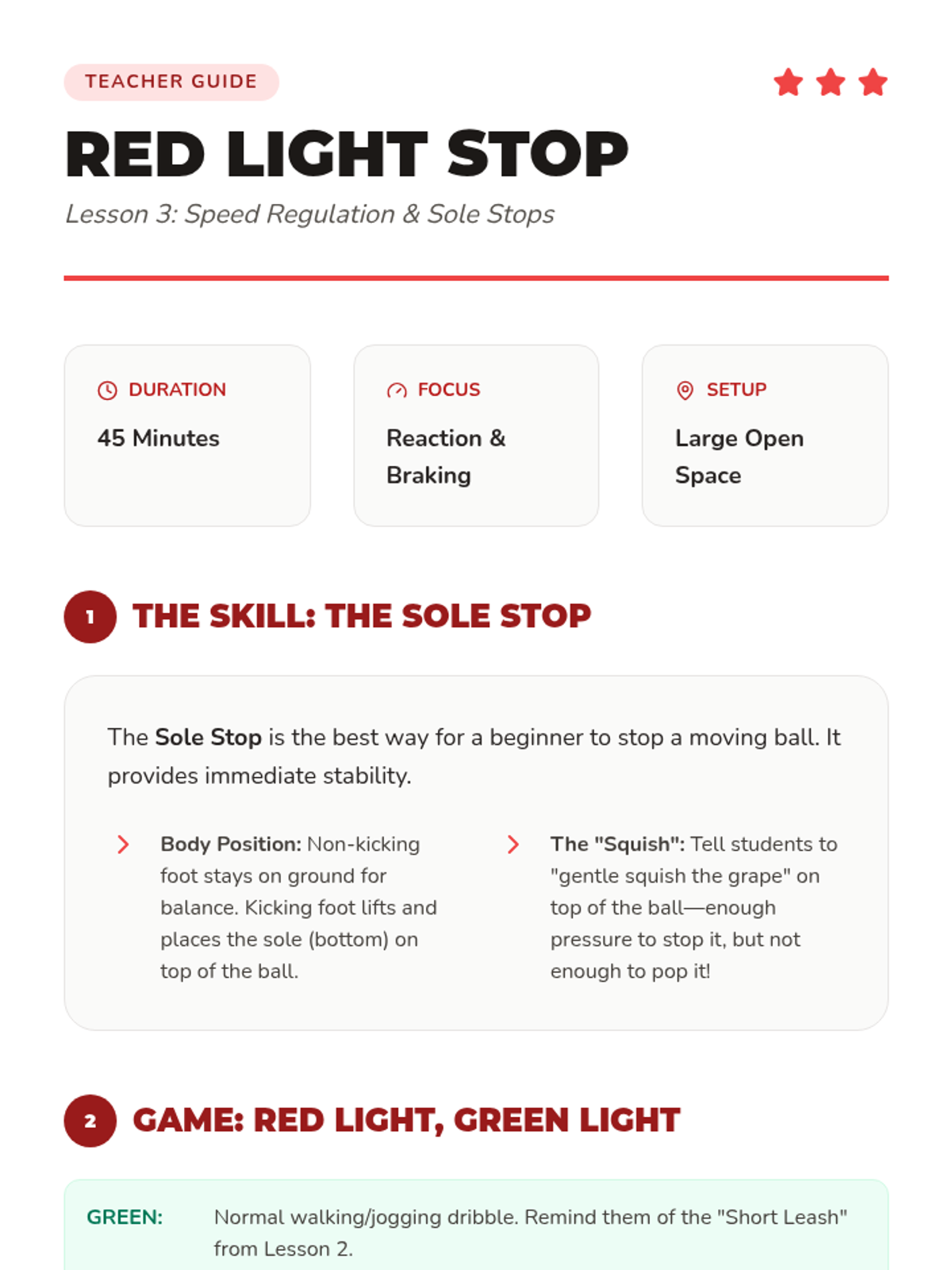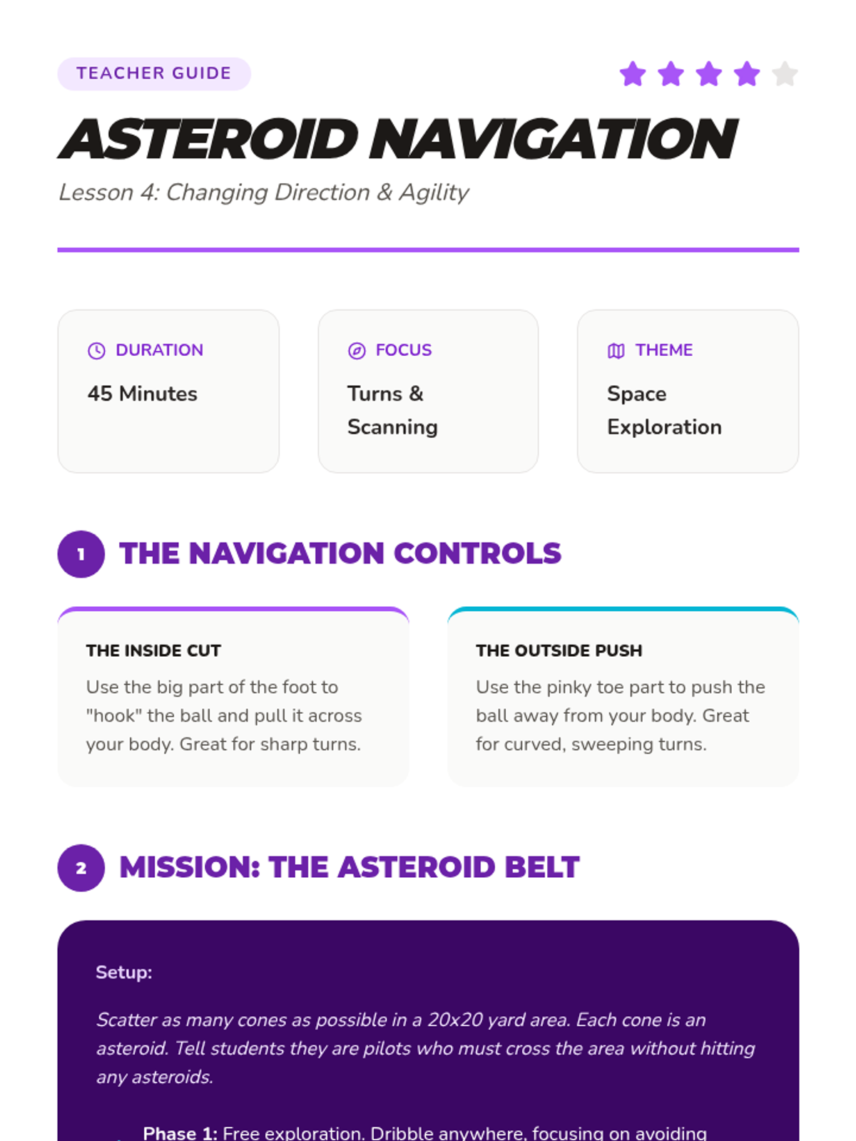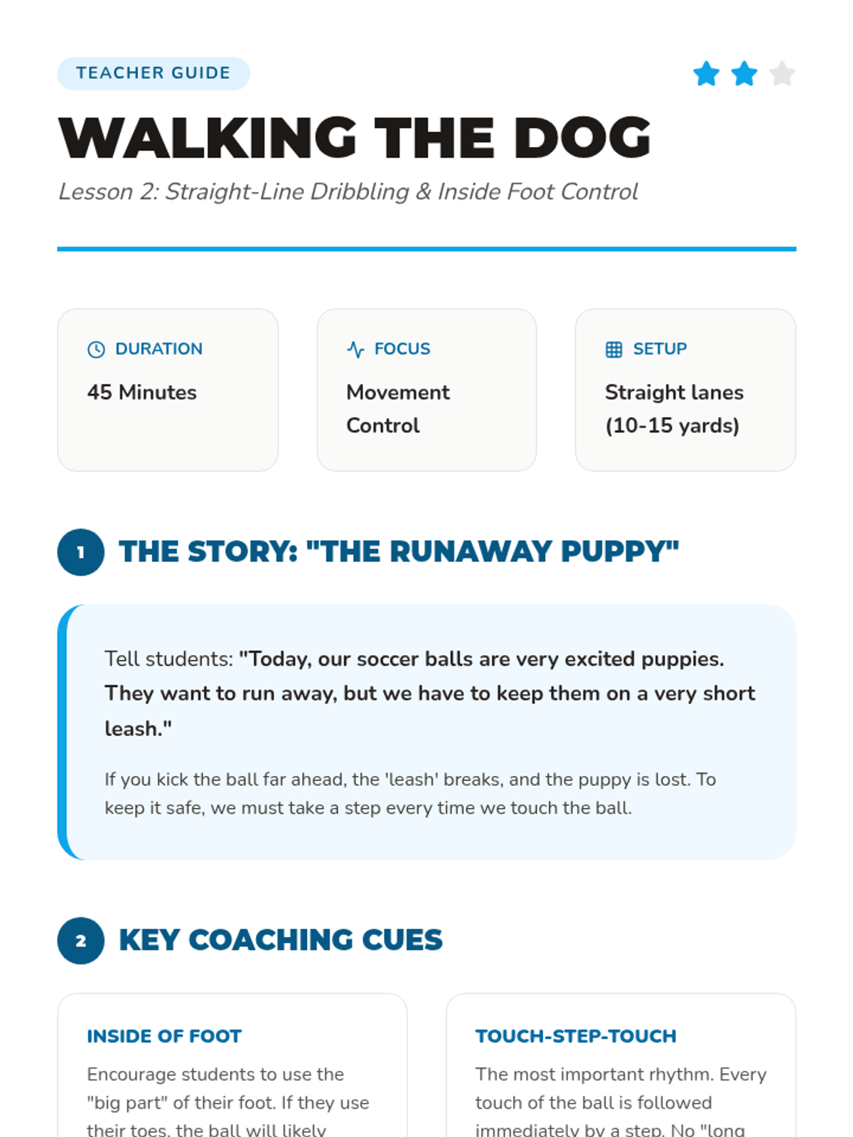A 1st Grade physical education sequence focusing on the foundations of soccer dribbling. Through imaginative play like 'soccer dogs' and 'asteroid navigation,' students learn ball control, speed regulation, and spatial awareness.