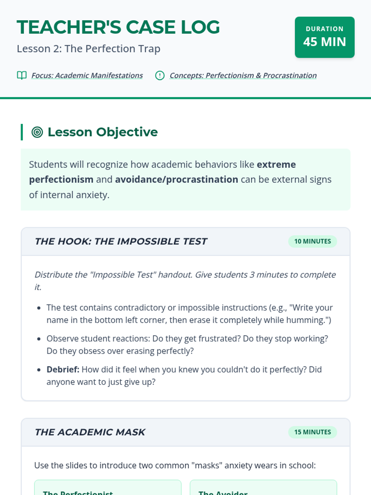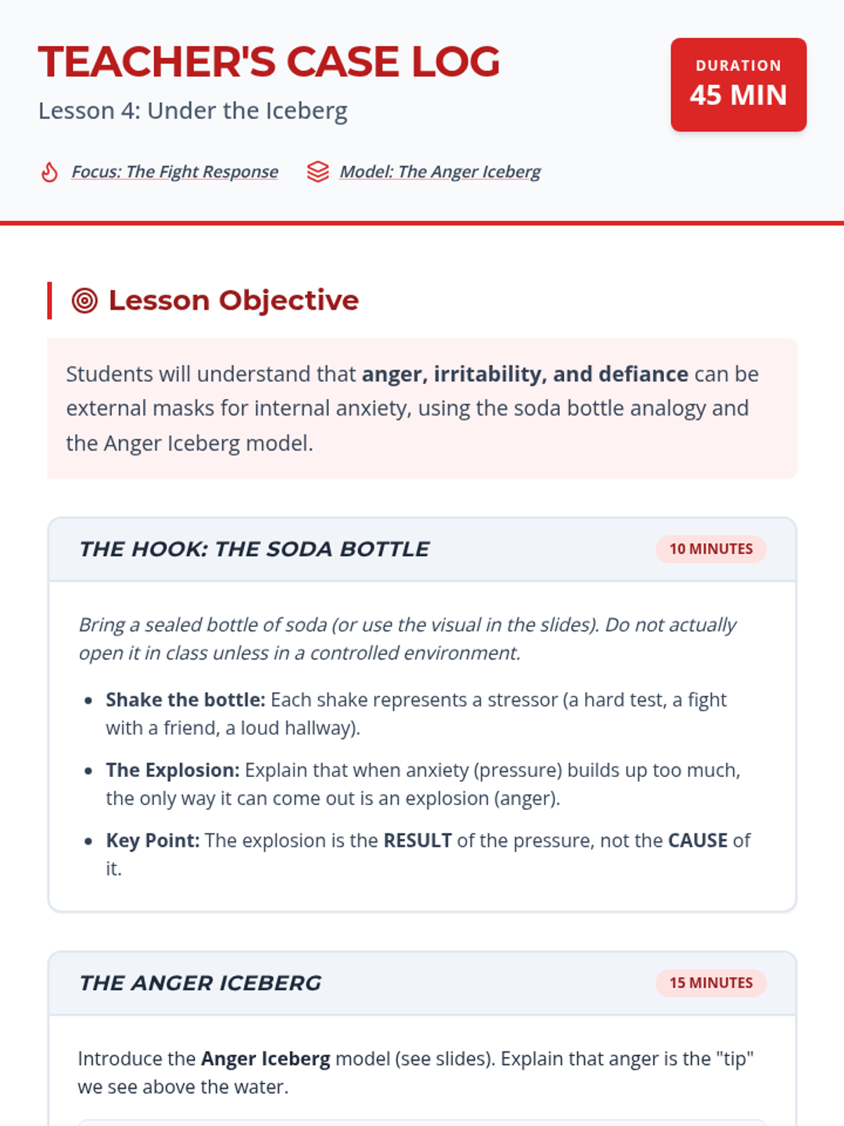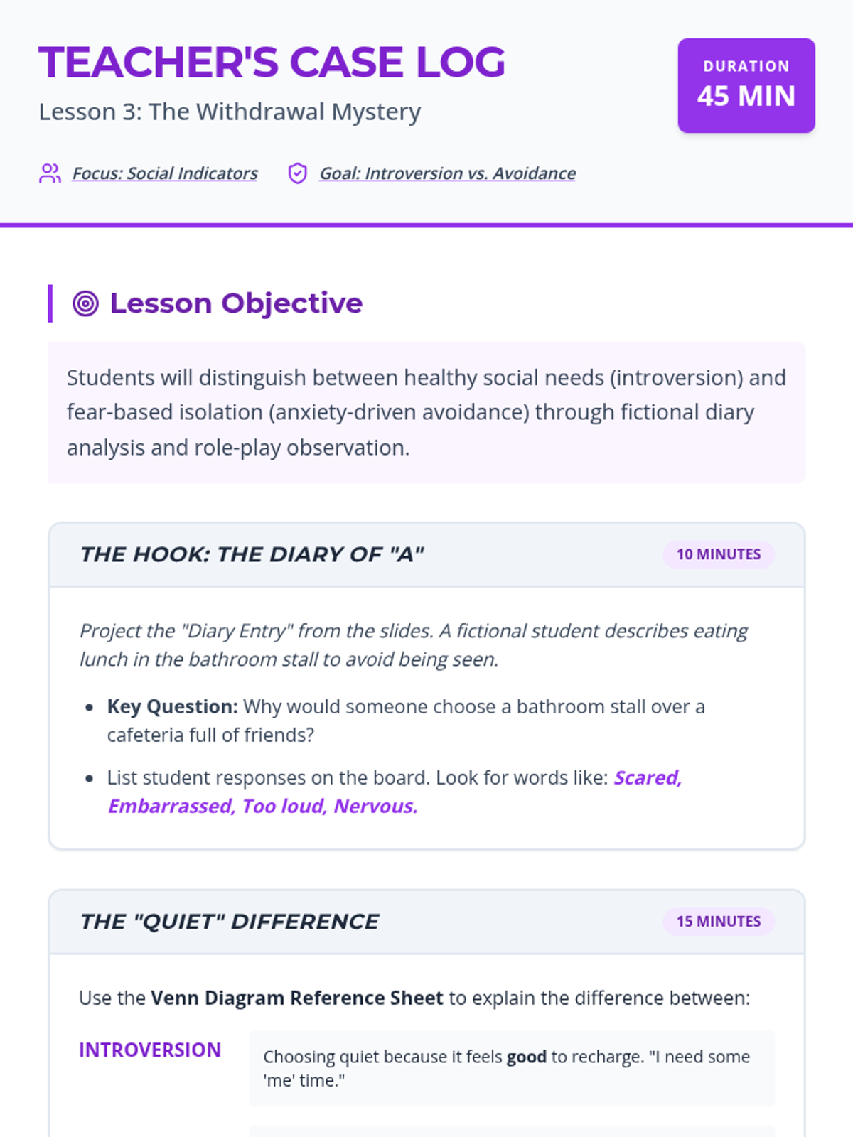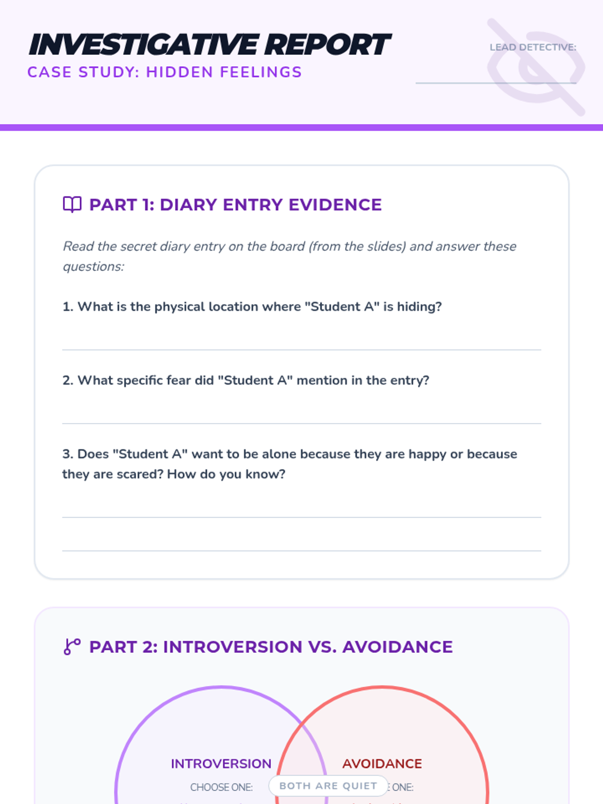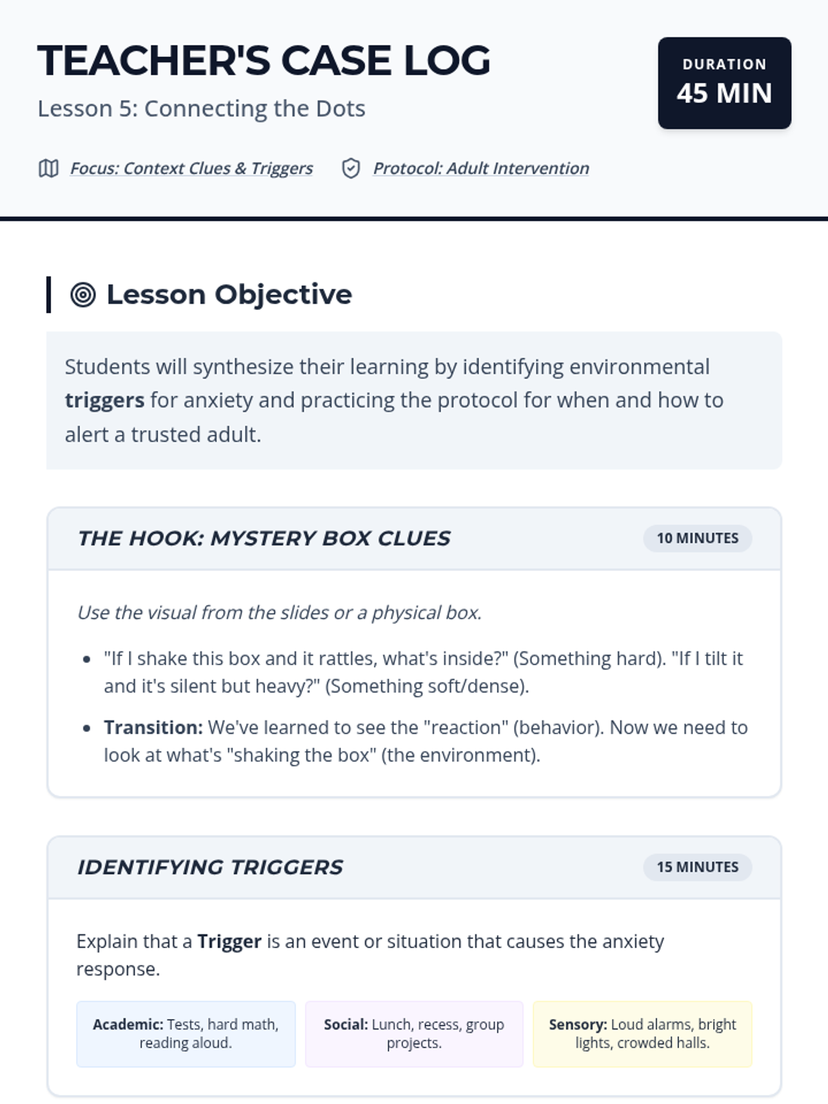 A 5-lesson sequence for 5th graders focused on identifying behavioral signs of anxiety. Students learn to observe changes in behavior as signals of emotional distress using a 'behavior detective' theme, building empathy and practical observation skills.