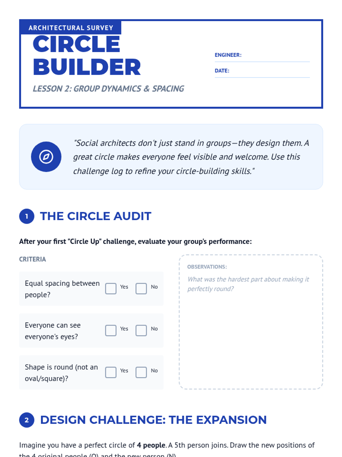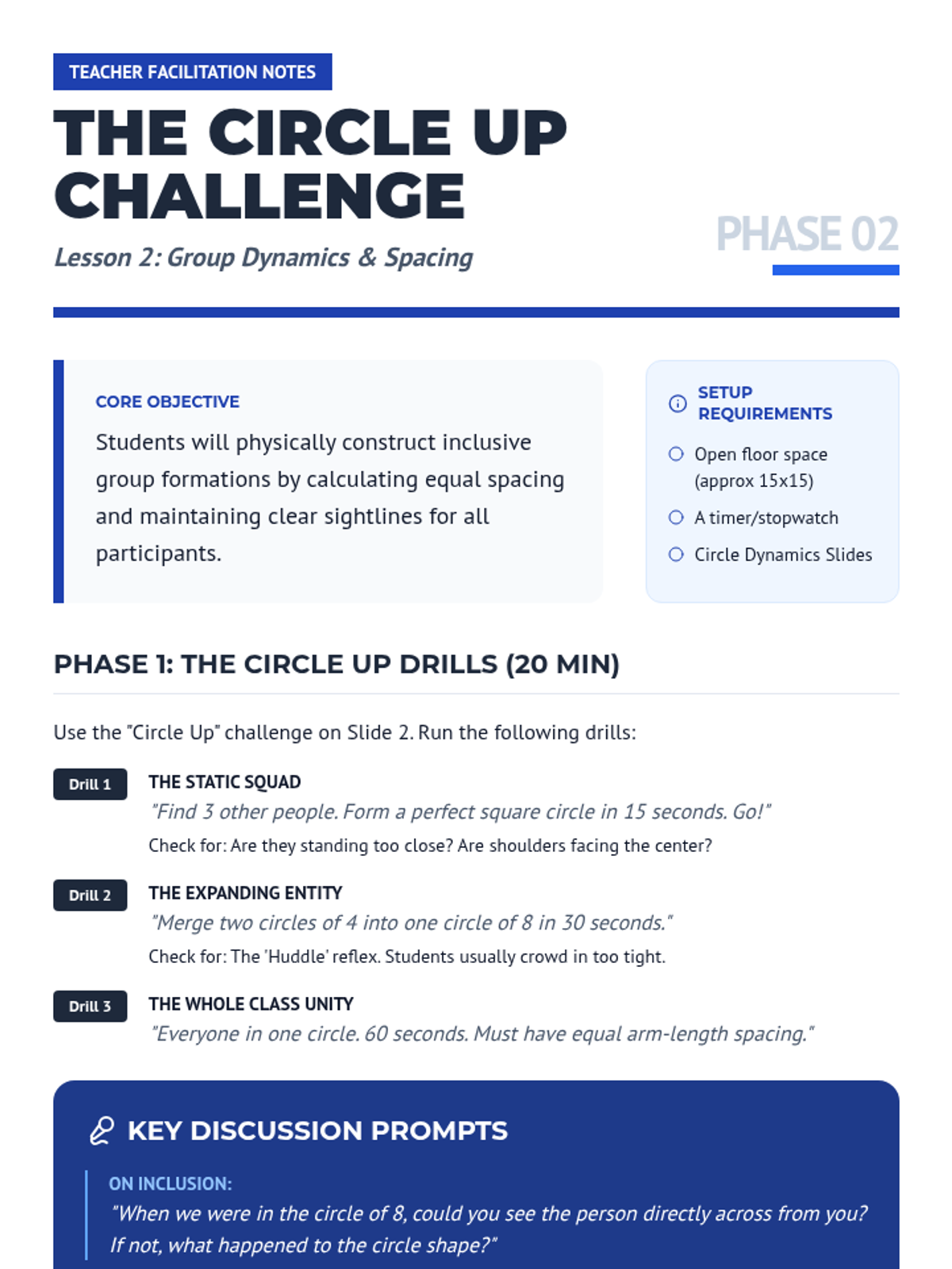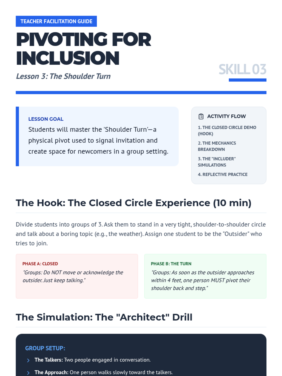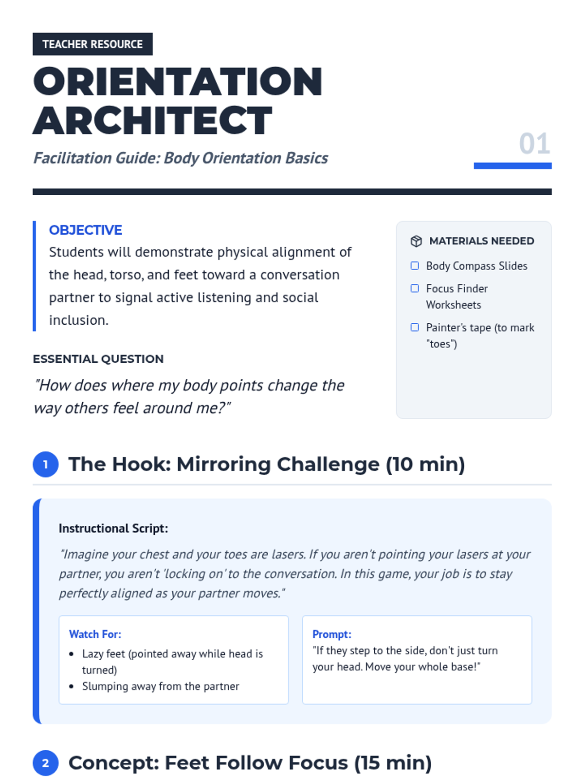 This sequence teaches 8th-grade students the physical mechanics of social interaction, focusing on body orientation, group formations, and nonverbal cues for inclusion and transition. Through a 'Social Architect' theme, students learn to use their bodies as tools for clear communication and social inclusivity.