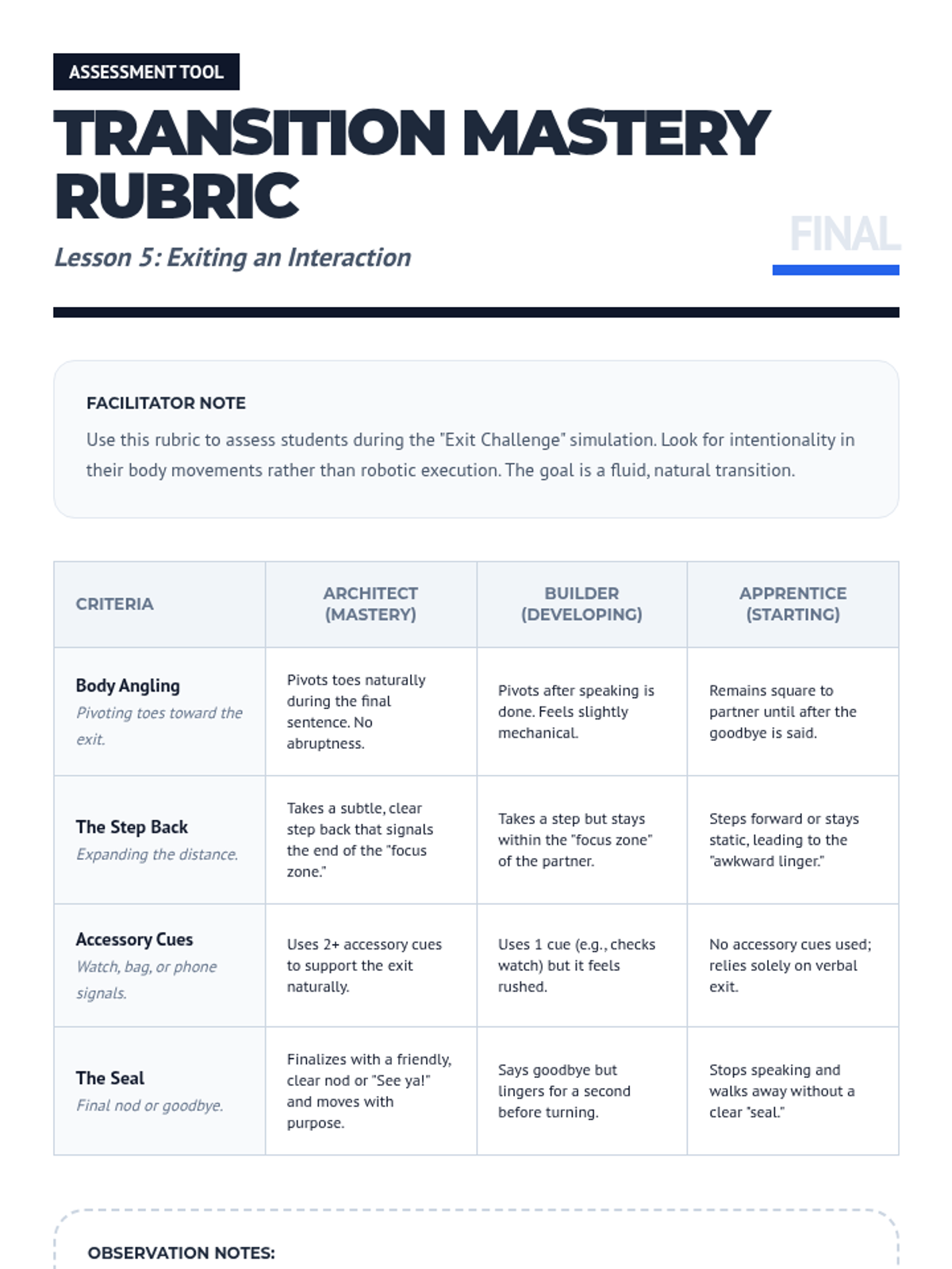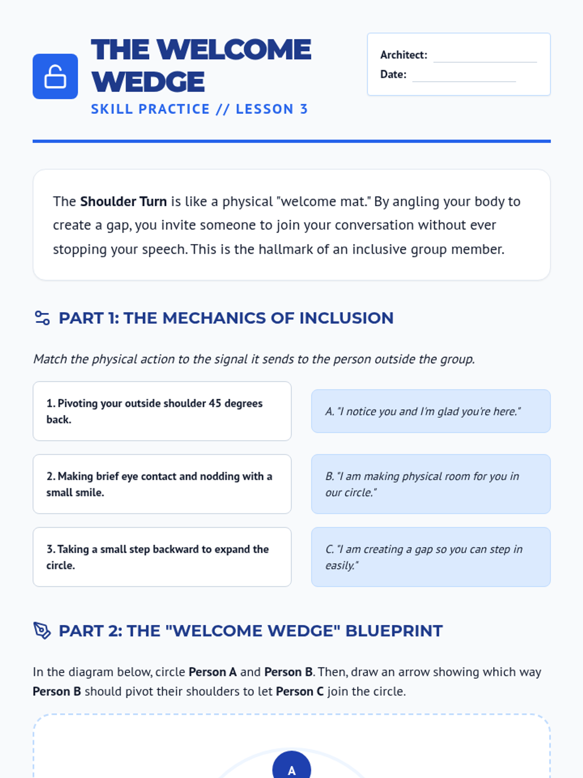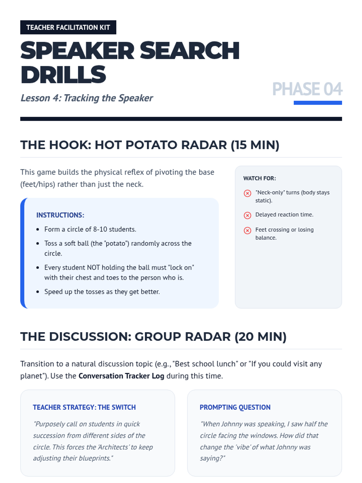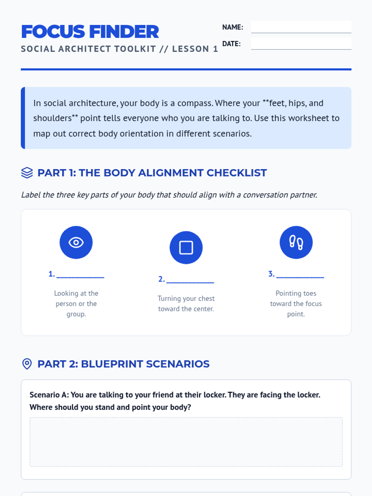 This sequence teaches 8th-grade students the physical mechanics of social interaction, focusing on body orientation, group formations, and nonverbal cues for inclusion and transition. Through a 'Social Architect' theme, students learn to use their bodies as tools for clear communication and social inclusivity.