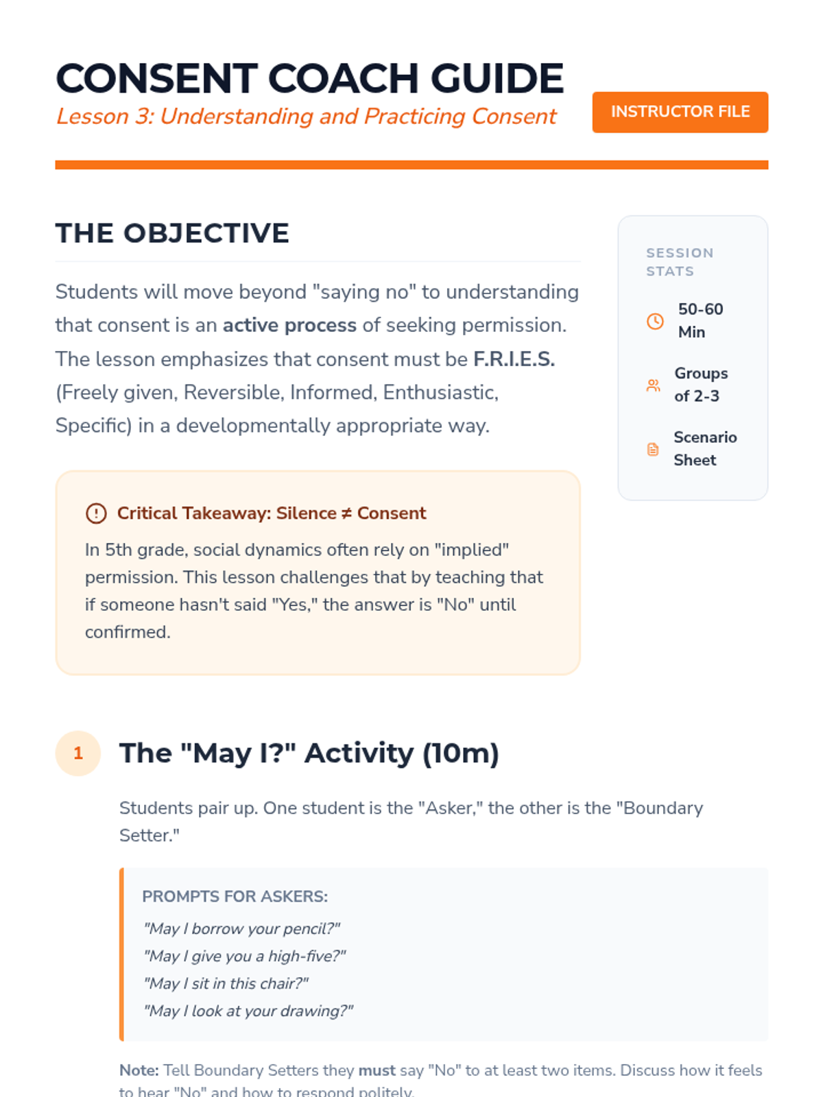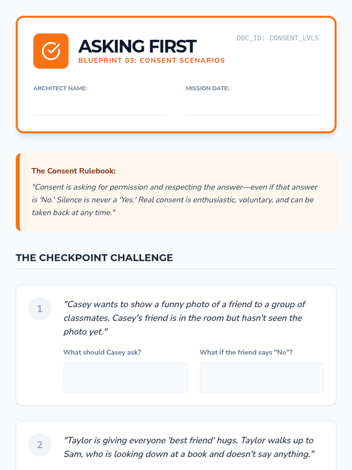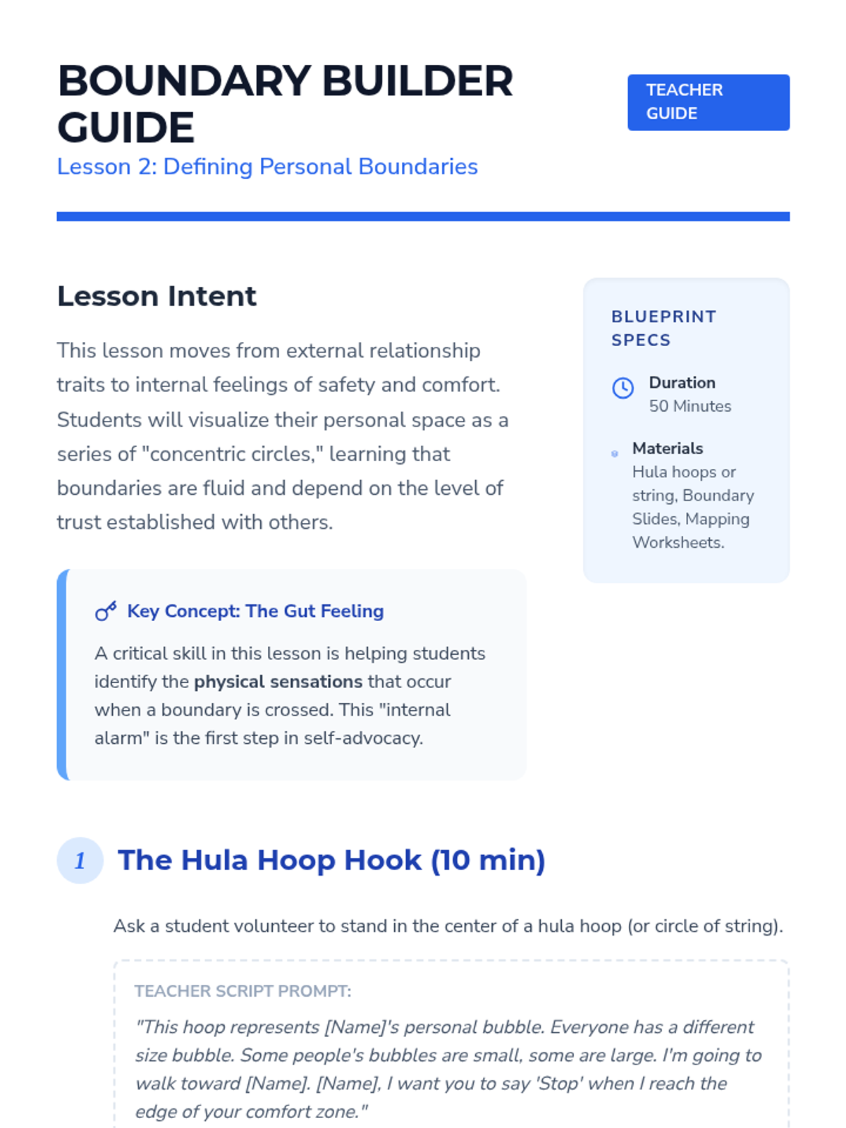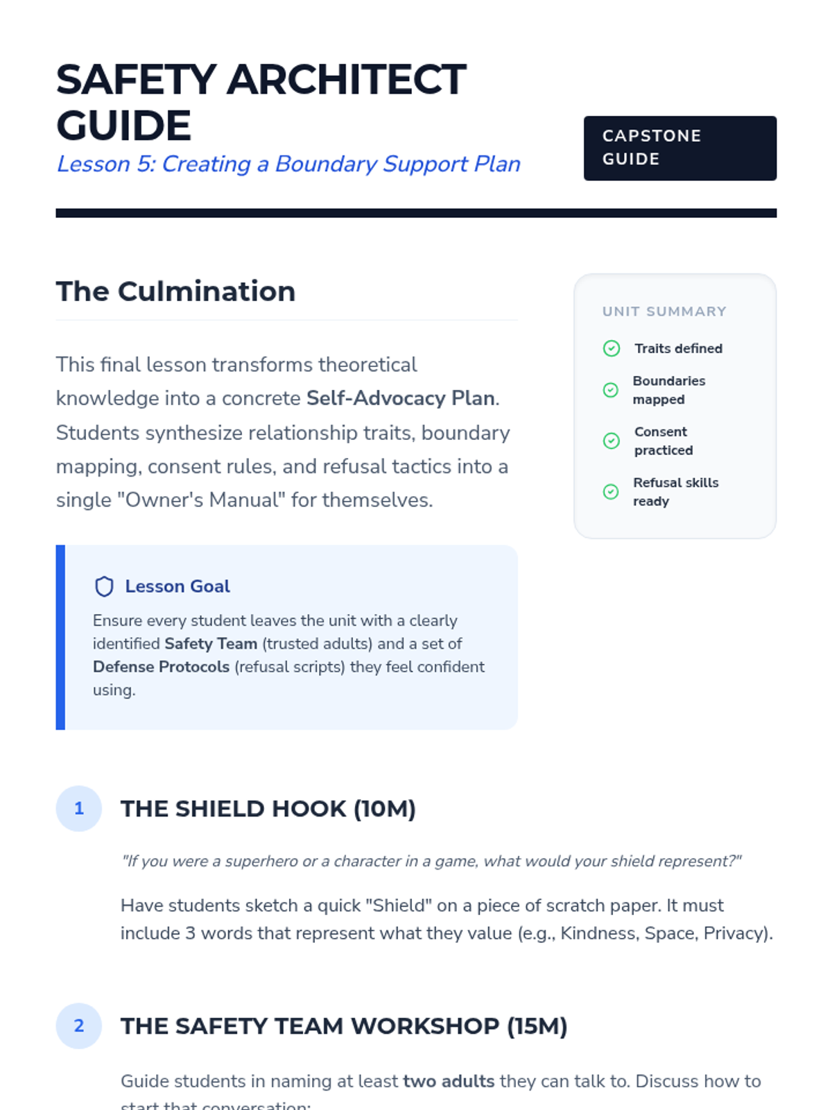 This 5-lesson sequence for 5th Grade students explores the essential components of healthy relationships, focusing on personal boundaries, consent, peer pressure resistance, and safety planning. Students use an architectural metaphor to 'build' healthy social connections and 'map' their personal comfort zones.