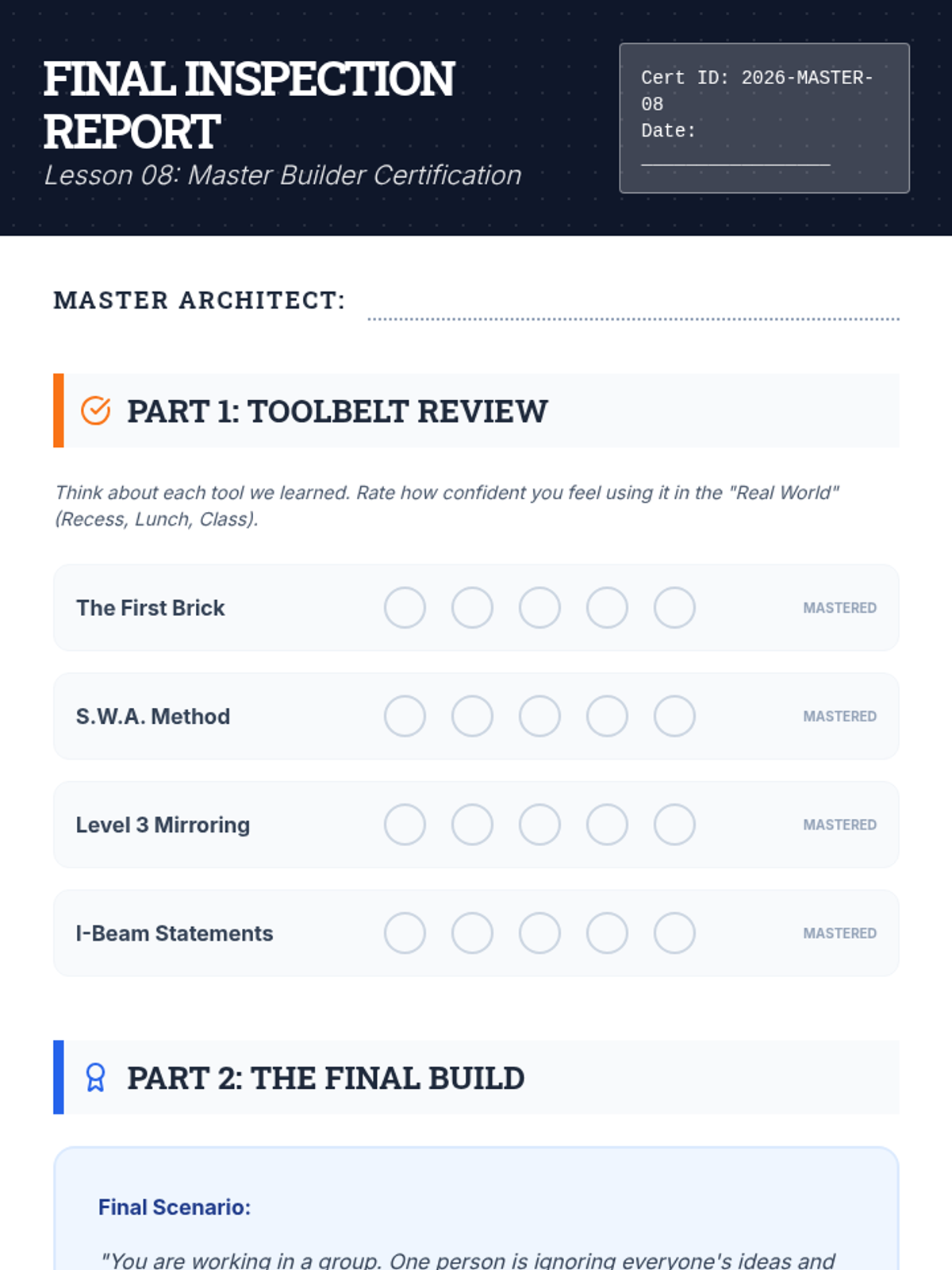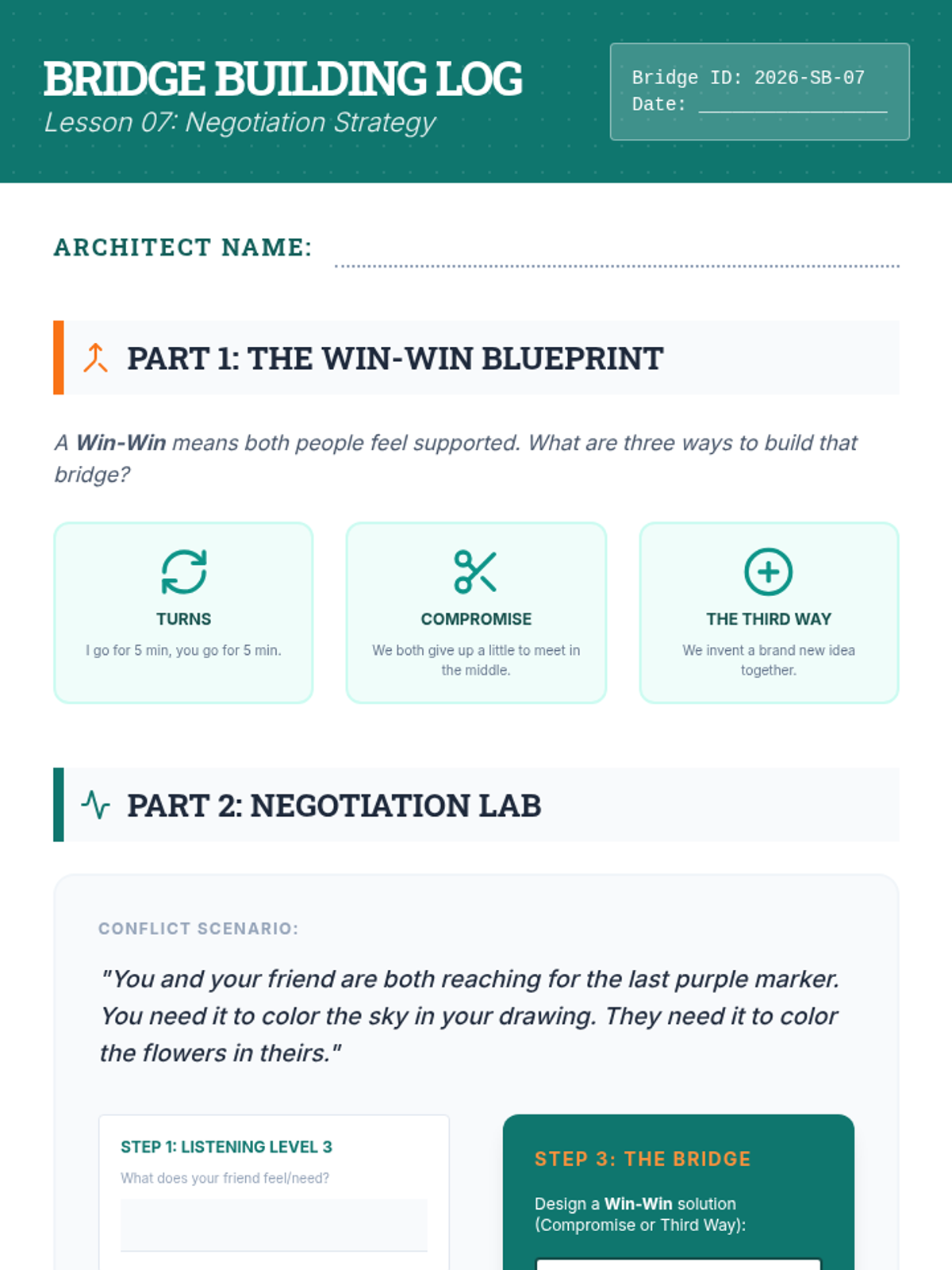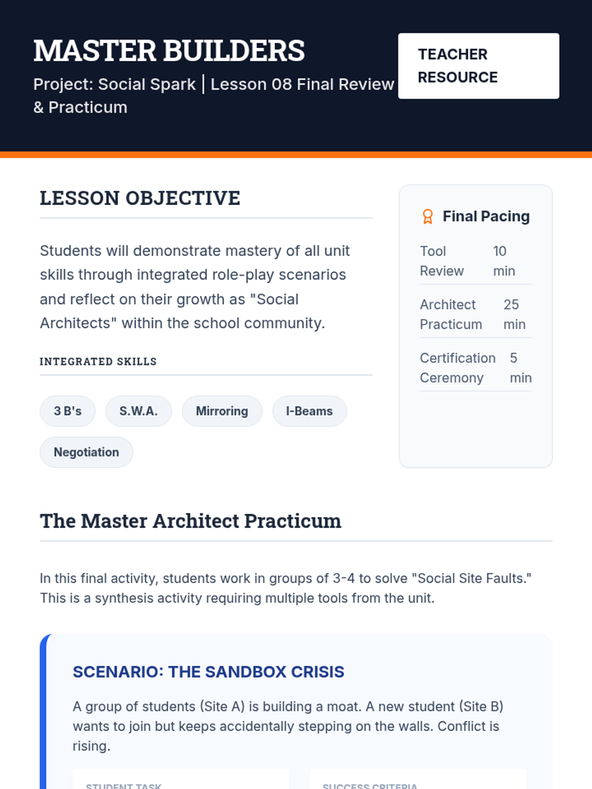 An 8-week curriculum designed to empower students with the tools to initiate positive peer interactions and resolve conflicts effectively. The unit uses a 'Social Architects' theme, framing social skills as building blocks for a strong community.