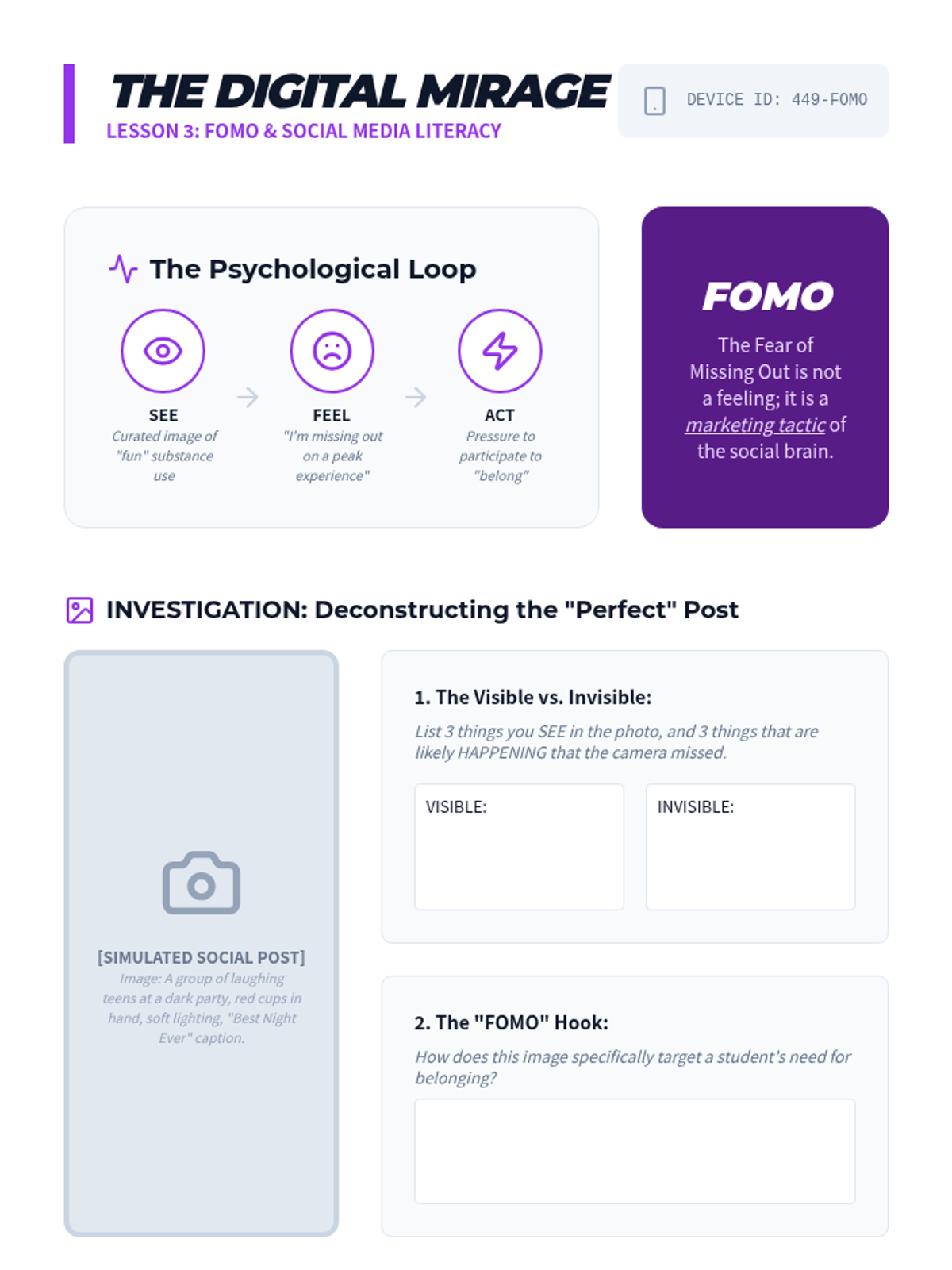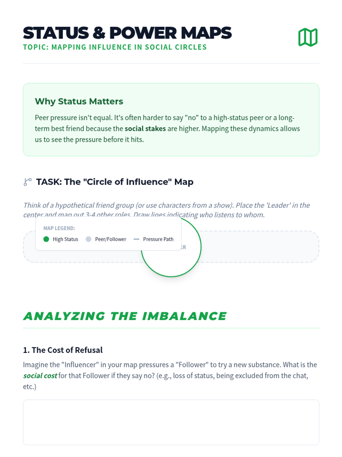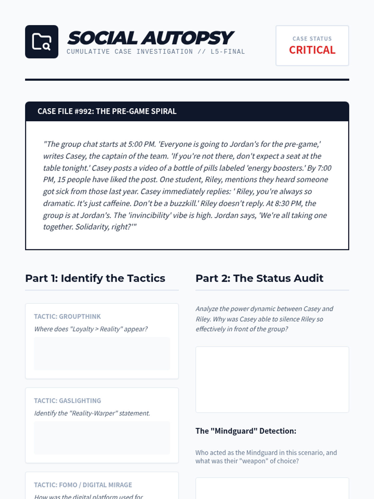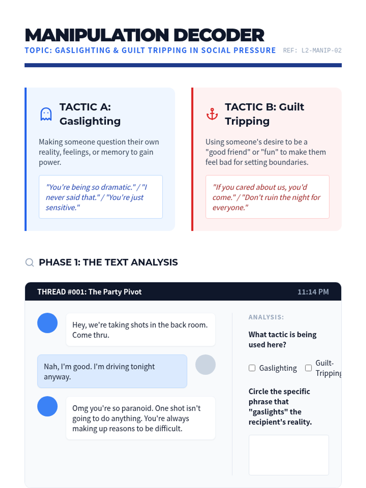 This 11th-grade health sequence investigates the psychological mechanisms of peer influence, focusing on subtle manipulation tactics like groupthink, gaslighting, and digital FOMO. Students move from identifying these tactics to deconstructing how they target belonging and status, ultimately learning to diagnose and navigate manipulative social dynamics before they lead to risky substance use decisions.