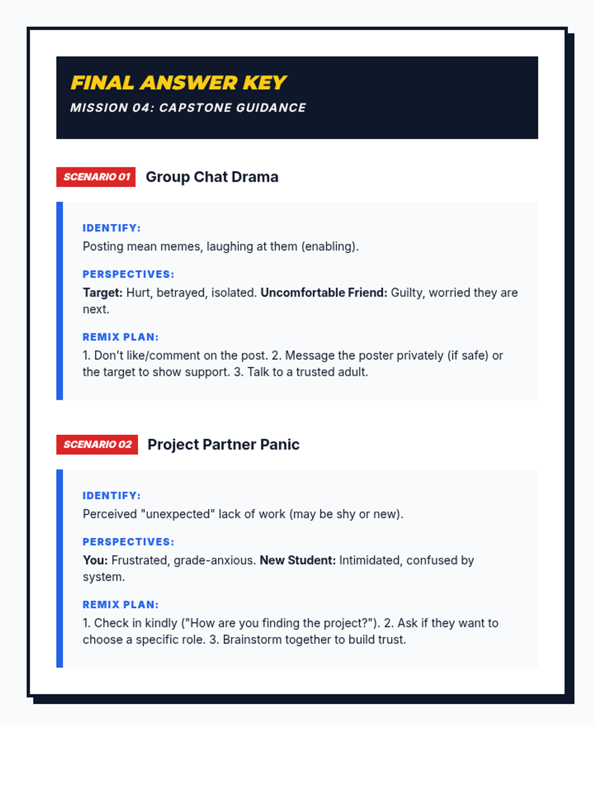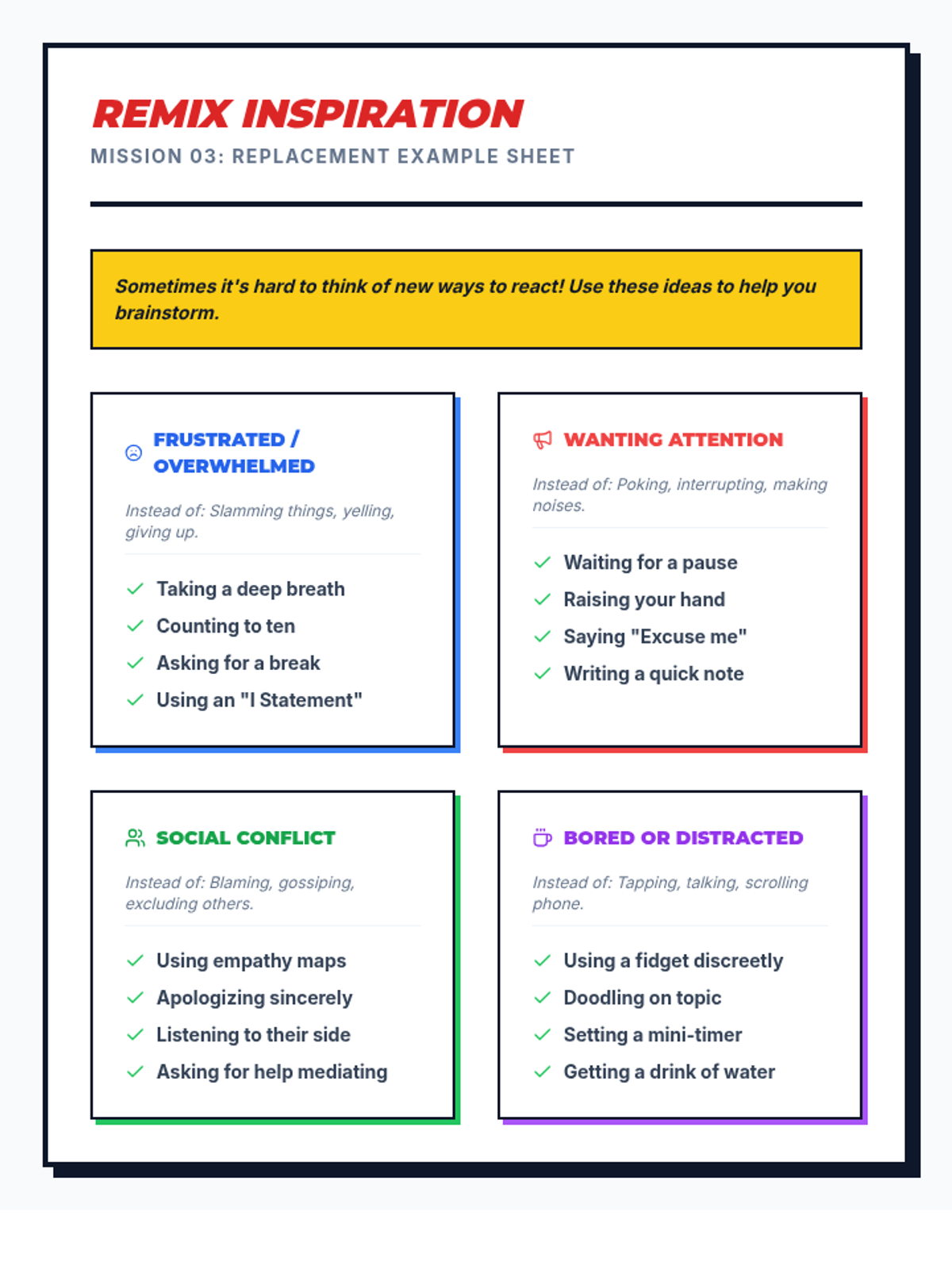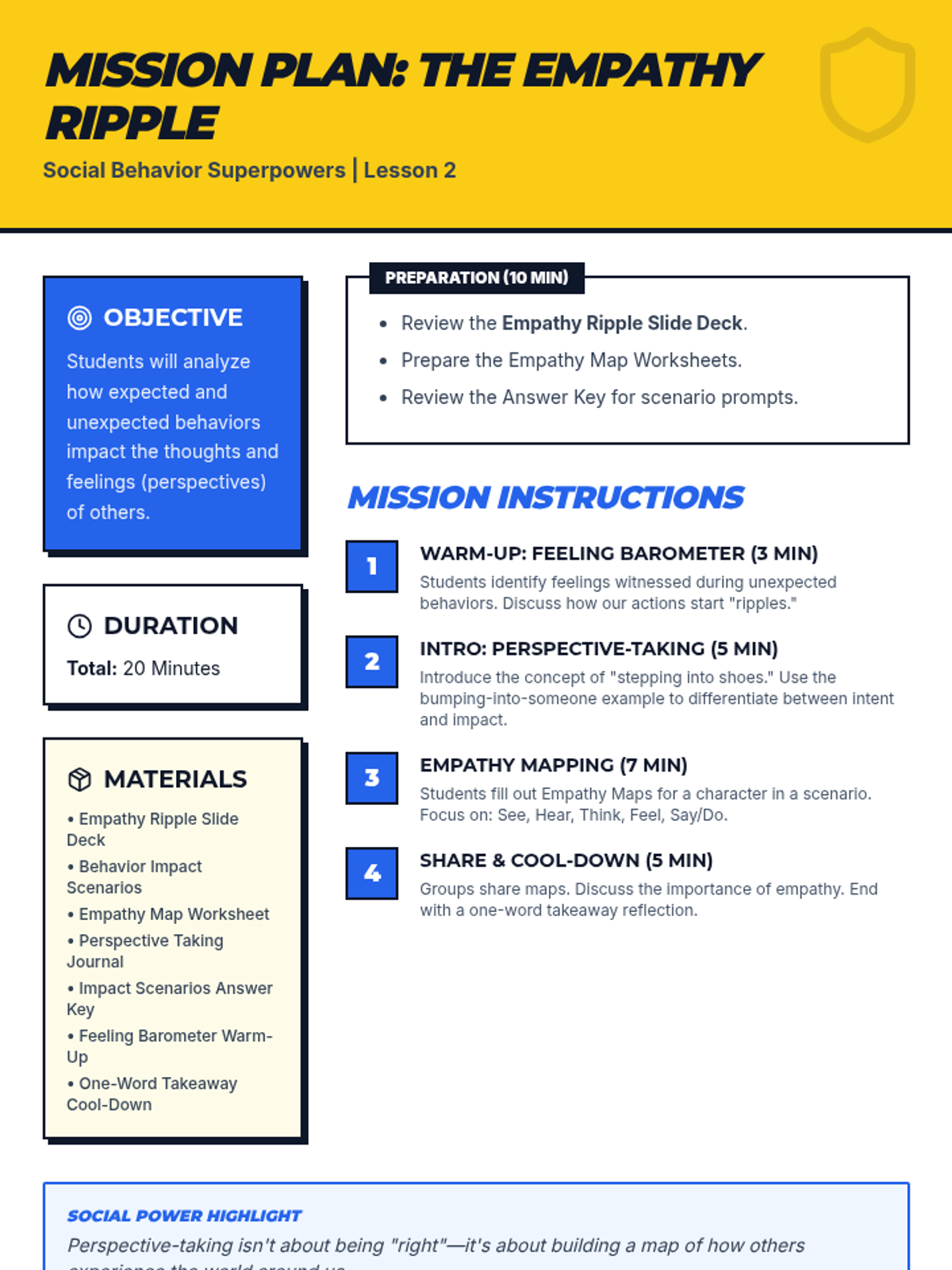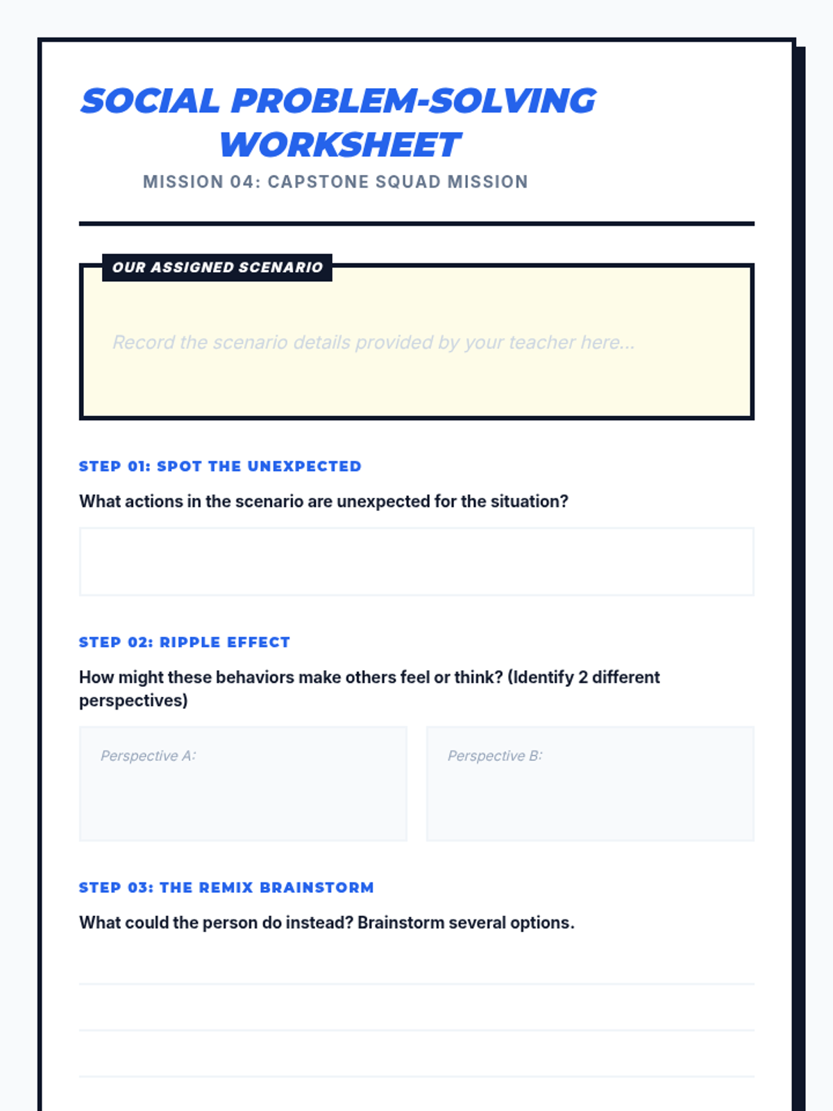 A four-part unit for 7th-grade students designed to develop social awareness and self-regulation. Students learn to identify expected and unexpected behaviors, practice perspective-taking through empathy mapping, and develop replacement strategies for more positive social outcomes.