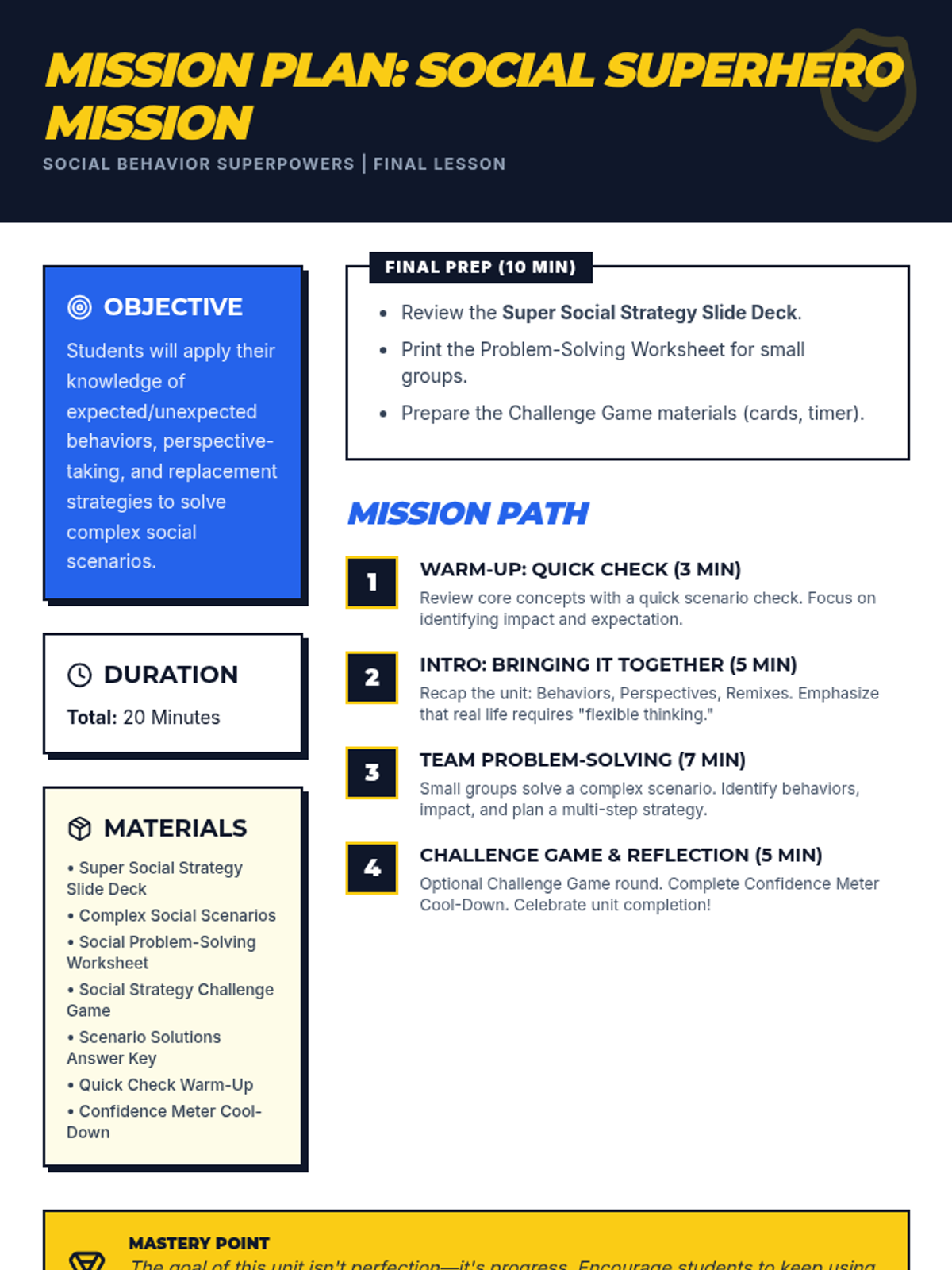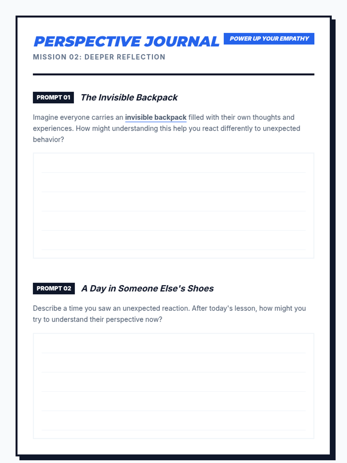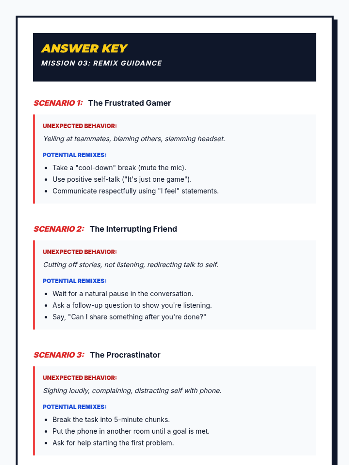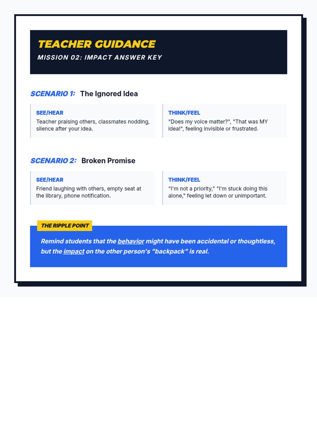 A four-part unit for 7th-grade students designed to develop social awareness and self-regulation. Students learn to identify expected and unexpected behaviors, practice perspective-taking through empathy mapping, and develop replacement strategies for more positive social outcomes.