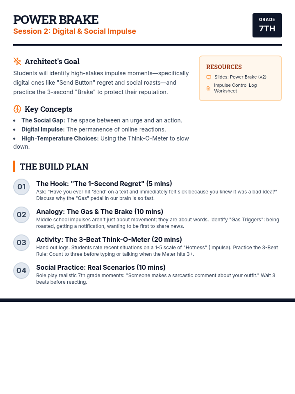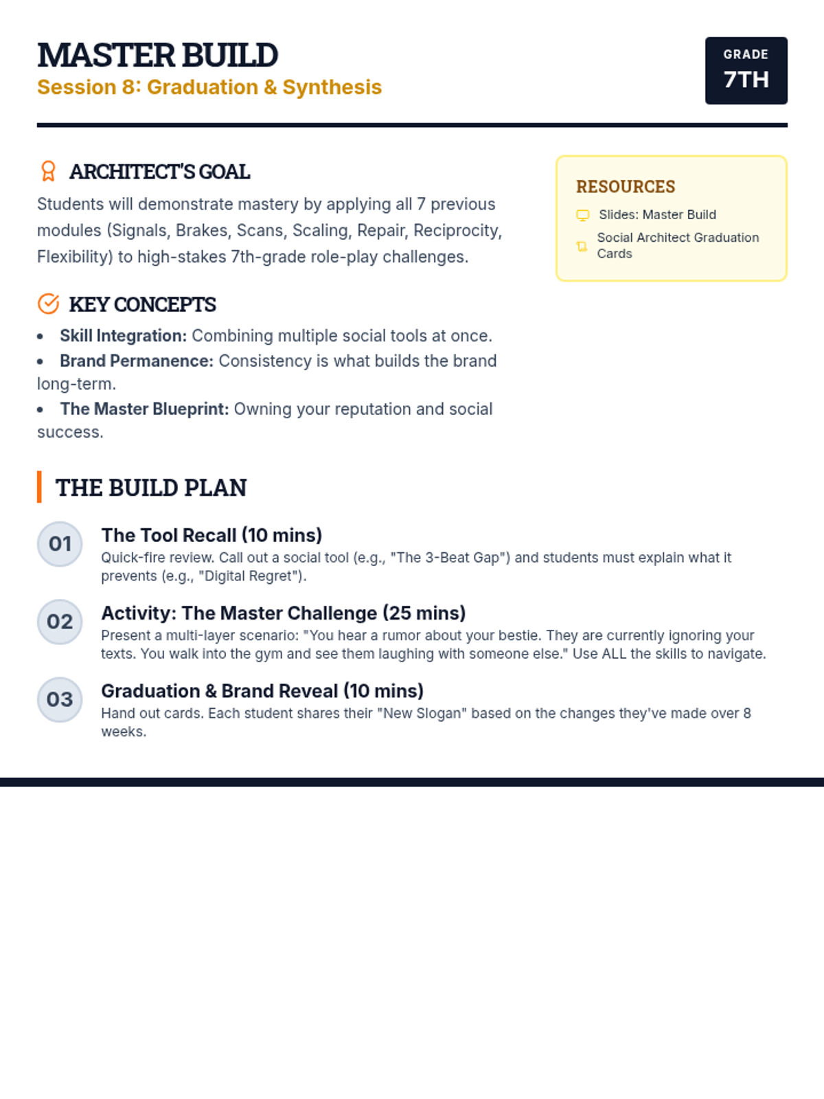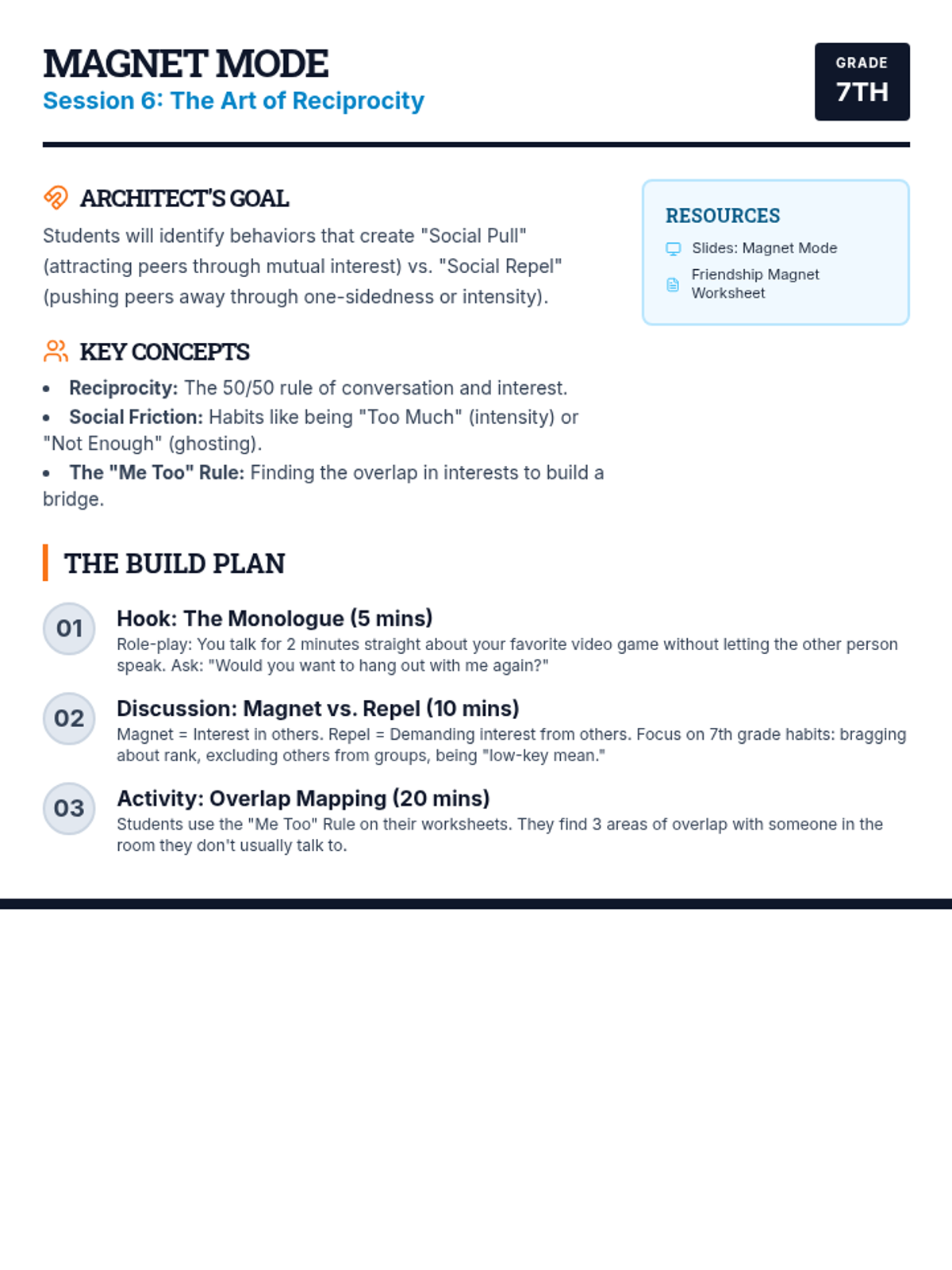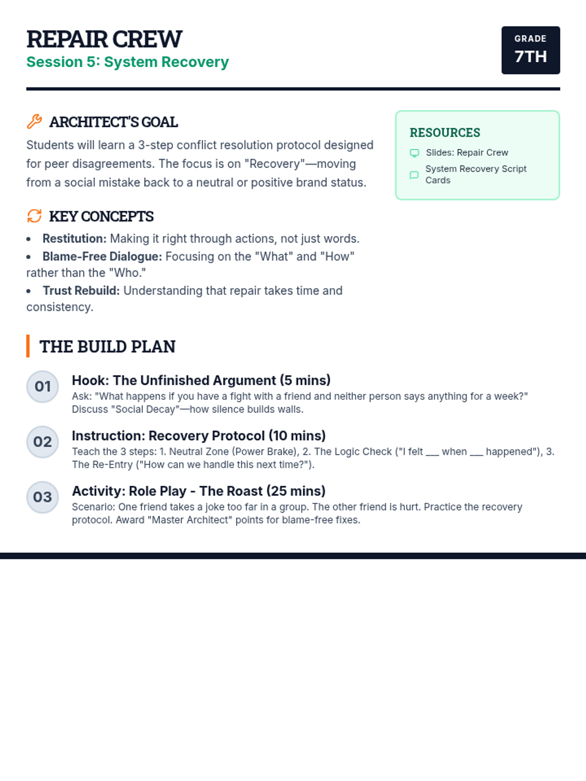 A 5-day SEL rollout sequence for middle schoolers, focusing on a simplified behavioral level system with three core focus areas: On-Task, Respect, and Safe Body. The system builds buy-in, defines expectations, and implements a consistent point-tracking scoreboard.