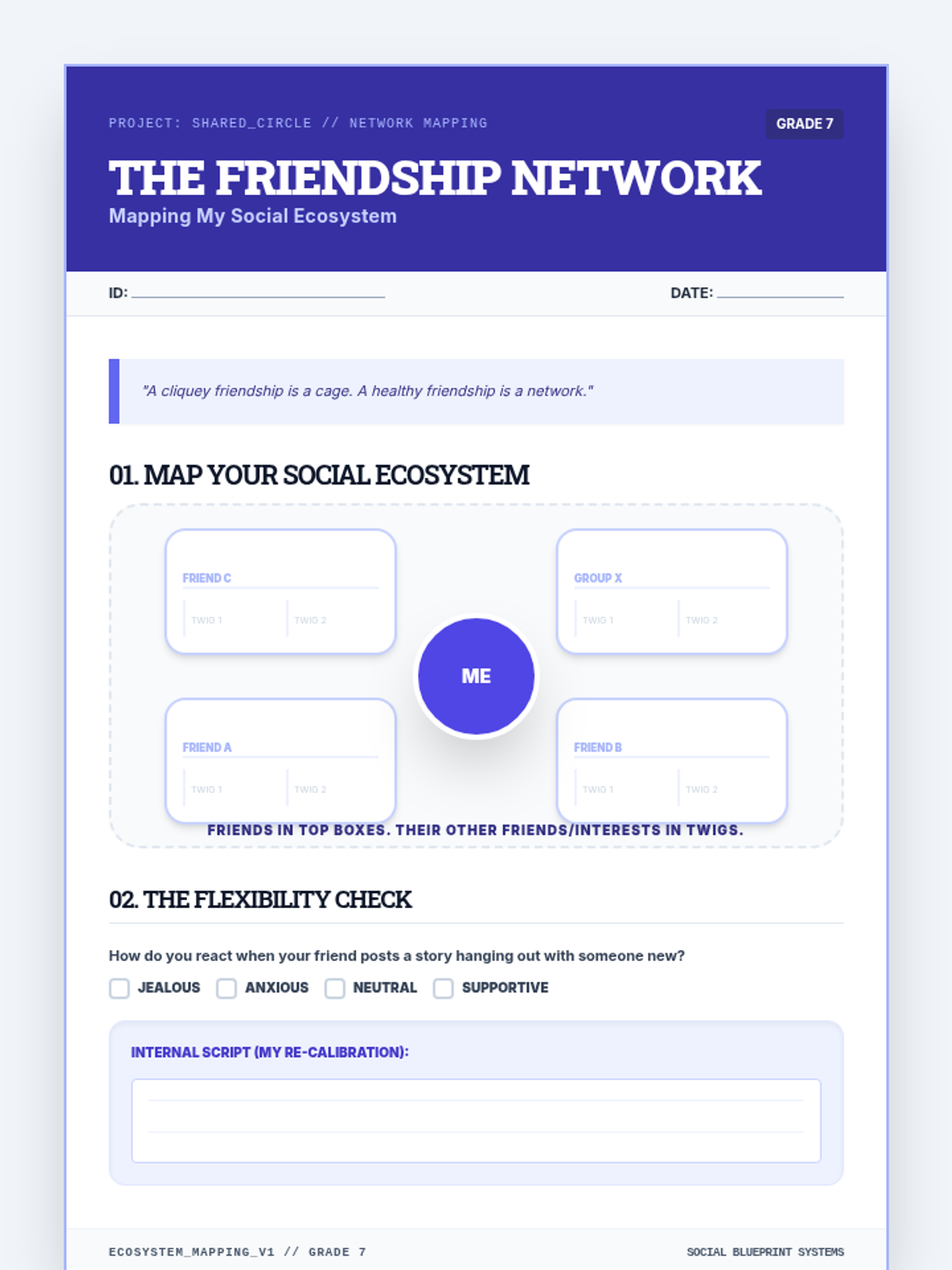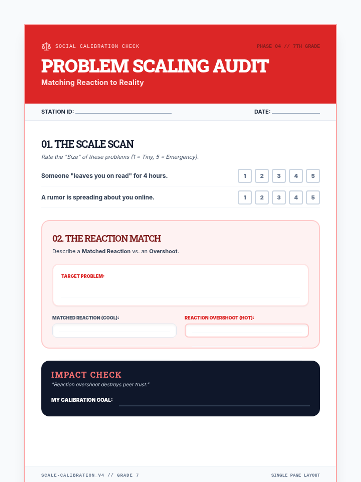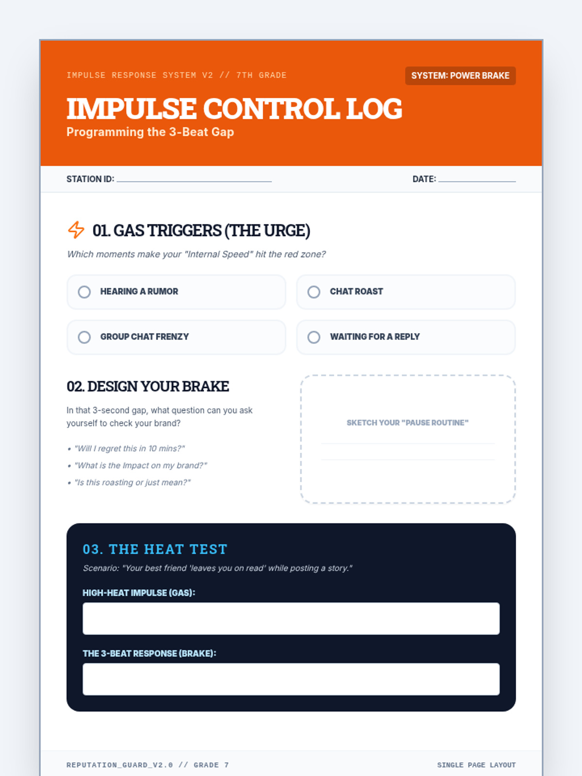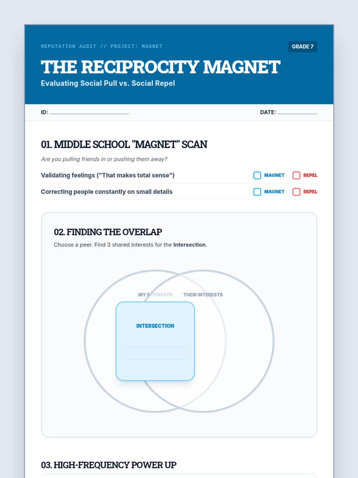 A comprehensive set of independent worksheets designed for a 13-year-old student to manage shame after mistakes, navigate peer drama using the Zones of Regulation, and apply grounding techniques for faster resetting. The materials use a 'Reset Blueprint' theme to make social-emotional learning feel like technical skill-building rather than therapy.