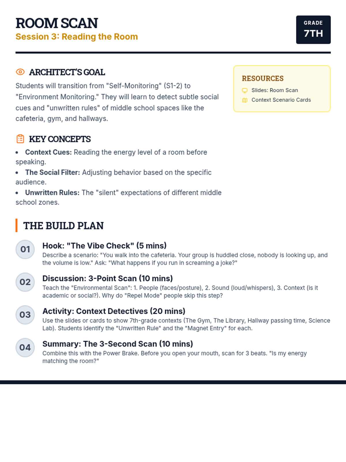 A comprehensive unit designed for middle and high school students to master the nuances of personal space, body language, and social norms in various school environments. This sequence moves from direct instruction to practical social strategies.