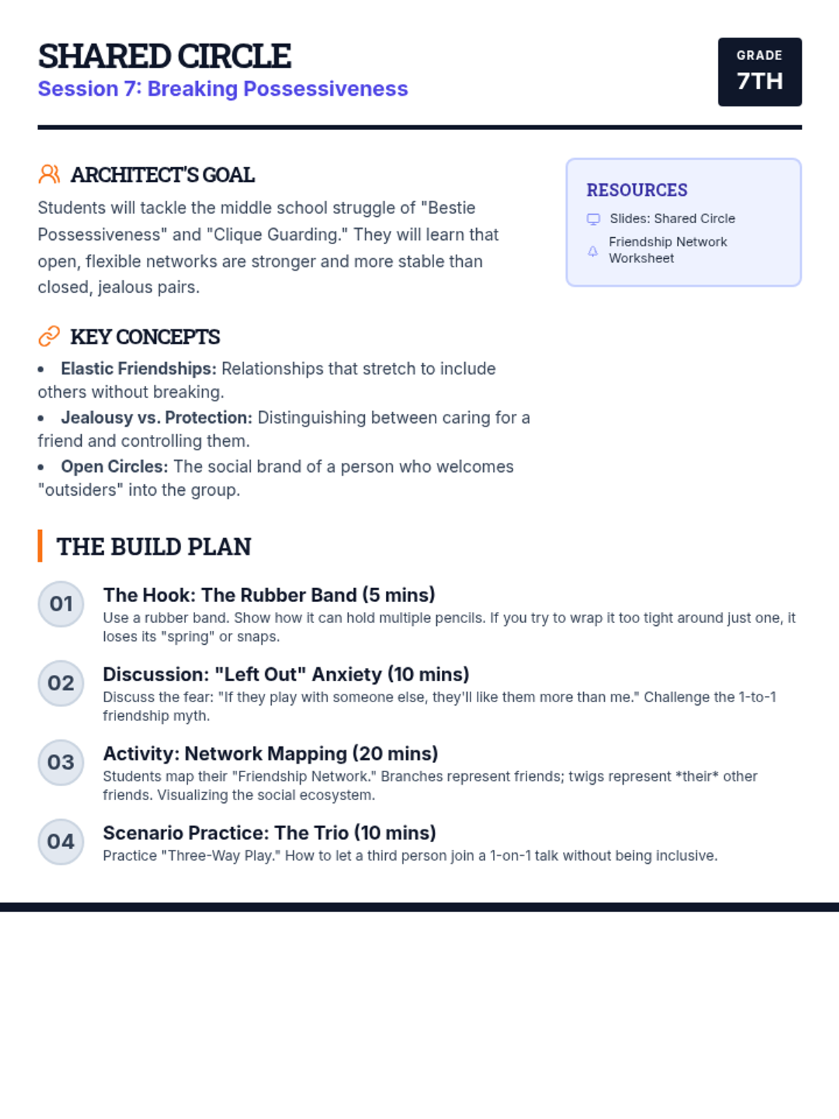 An 8-week small group social skills curriculum focused on self-awareness, impulse control, conflict resolution, and building healthy, non-possessive peer relationships using a 'blueprint' and 'architecture' theme.